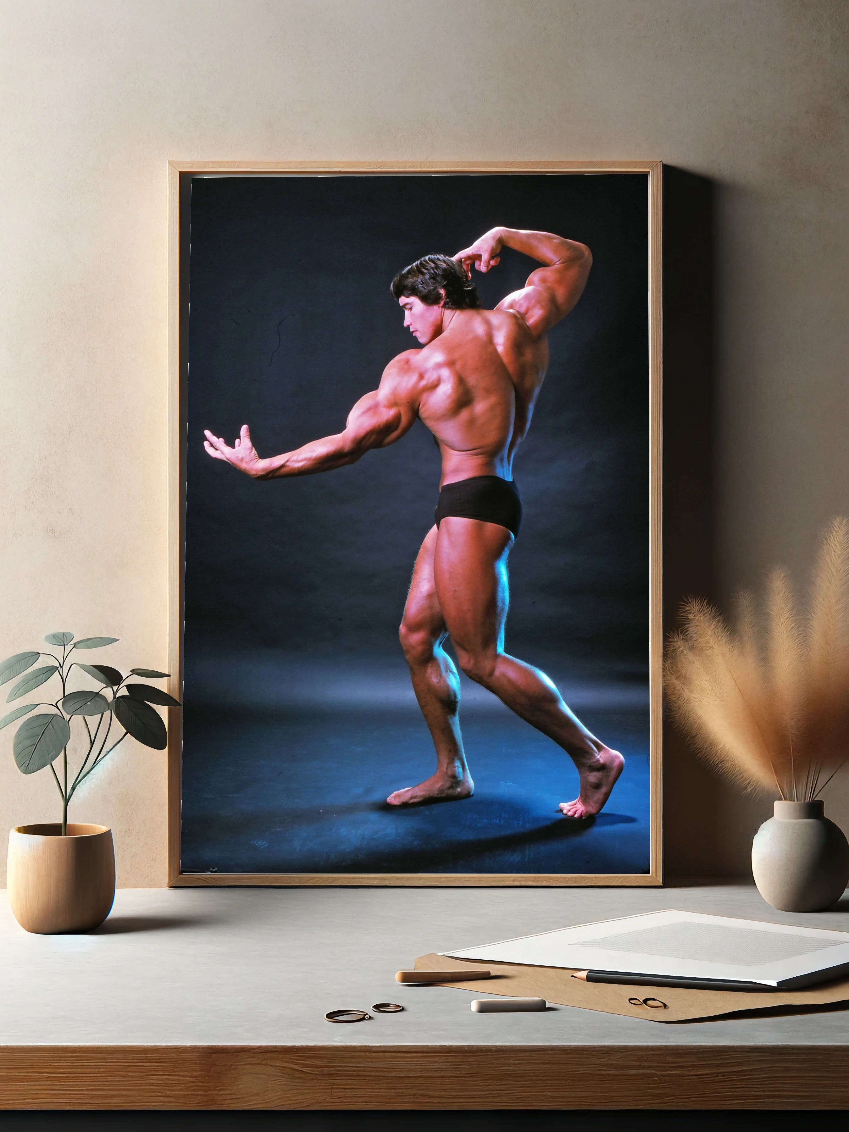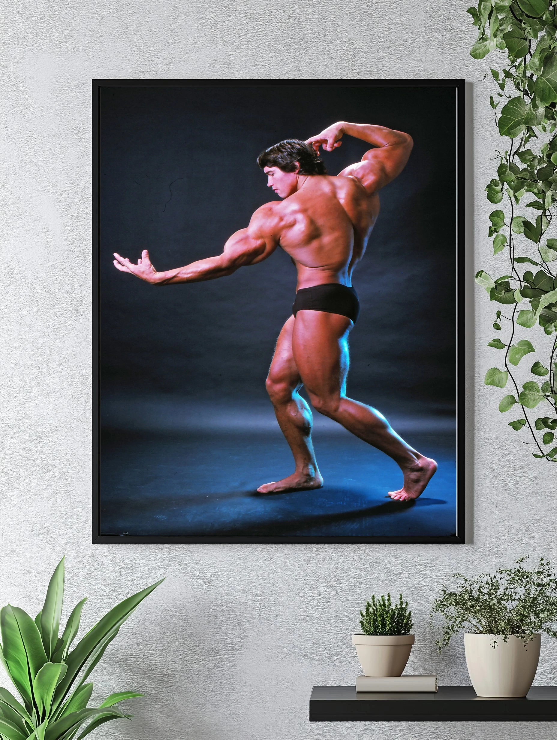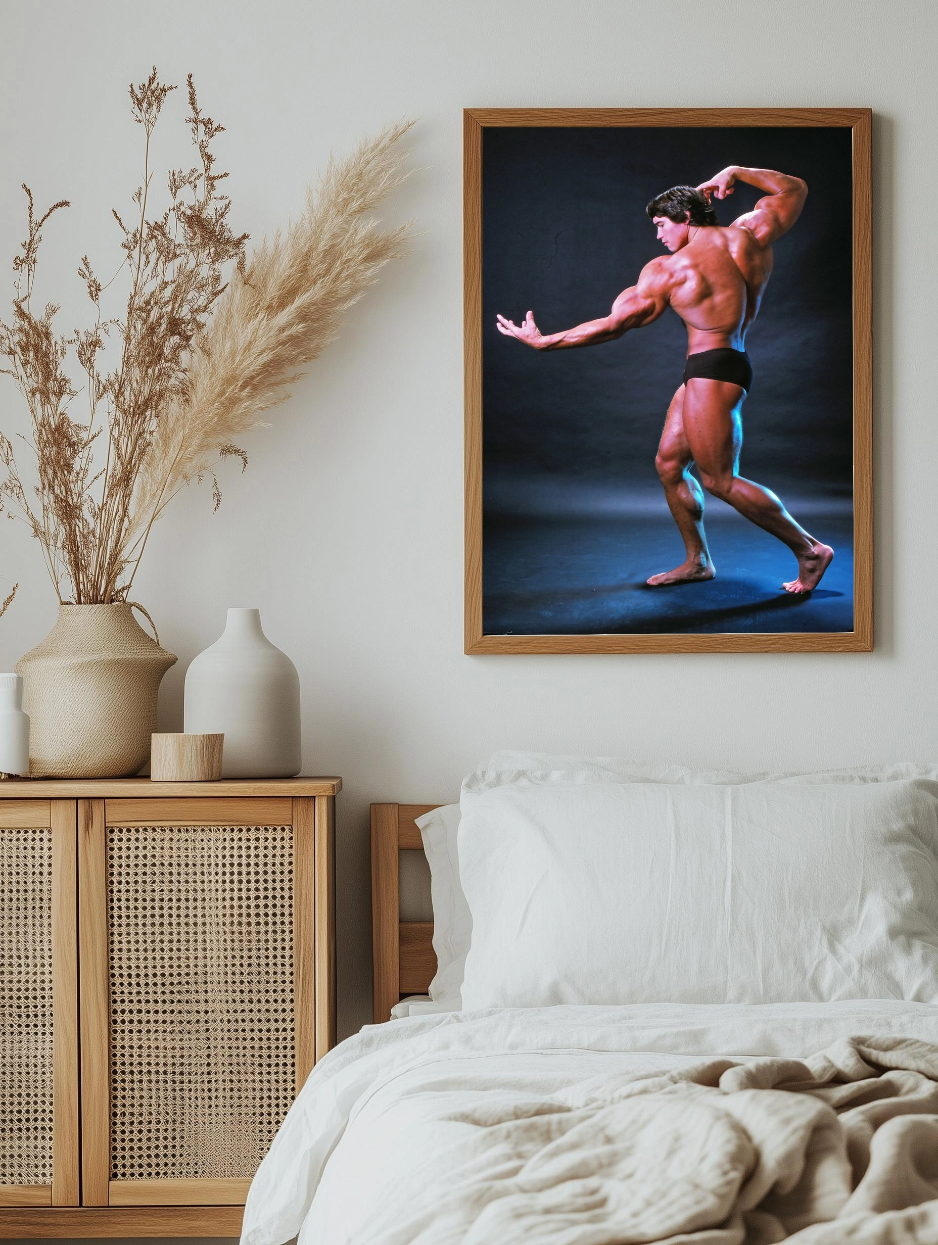 Фотография на тёмном фоне с акцентом на мощной и подтянутой мускулатуре мужчины. Обнажённое тело в динамической позе демонстрирует силу и гармонию спортивной фигуры, подчёркнутую ярким светом и выразительным контрастом. Современное искусство для стен и интерьерный декор, отлично подходящий для спортивных и фитнес-пространств.