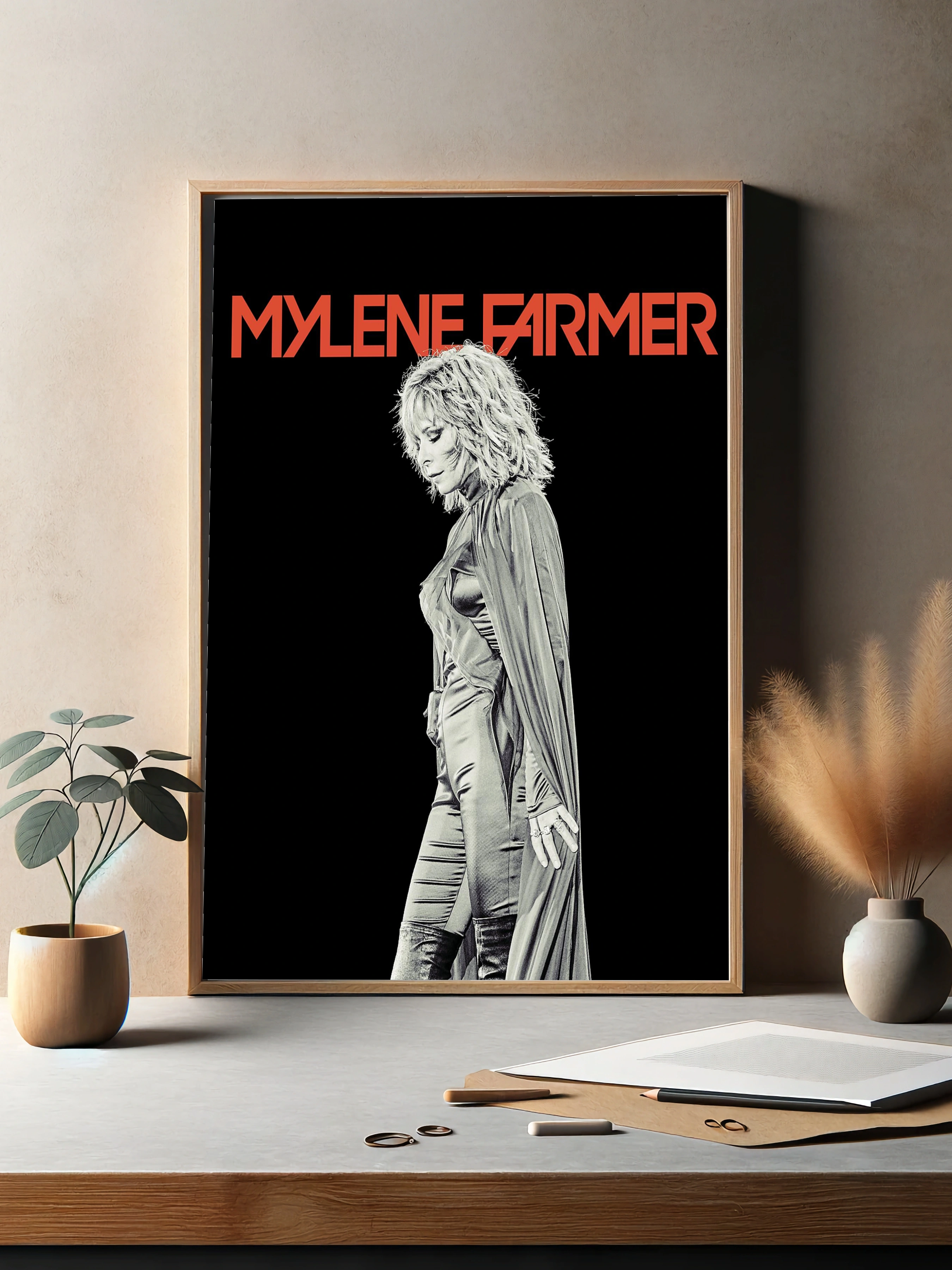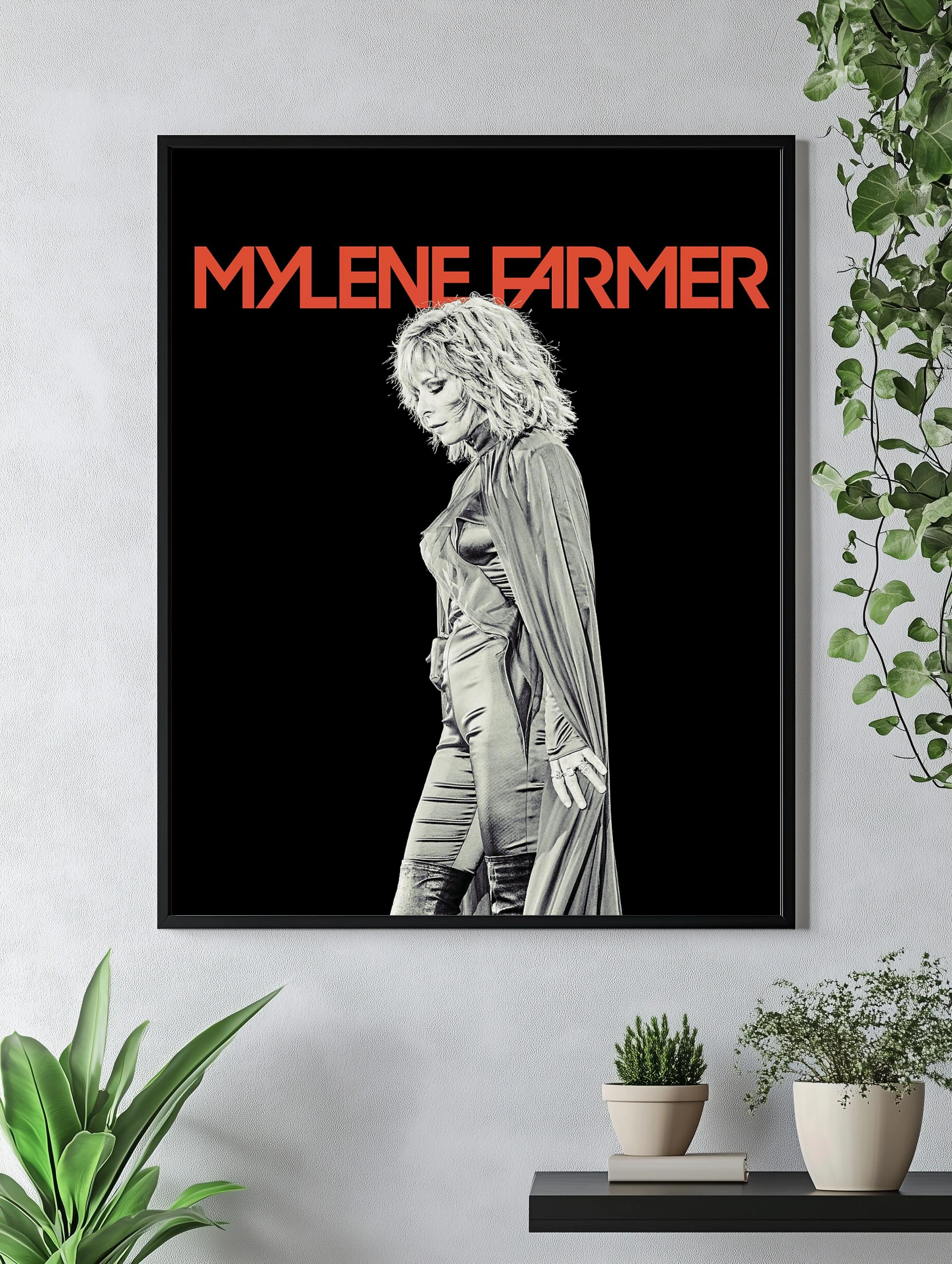 На изображении изображена знаменитая французская певица Mylene Farmer в элегантном наряде и длинном плаще на черном фоне. Фото выполнено в монохромном стиле с акцентом на текстуру одежды и плавные линии силуэта. Декоративный плакат отлично подойдет как интерьерный постер для гостиной или спальни, создавая атмосферу современного искусства и музыкальной эстетики.
