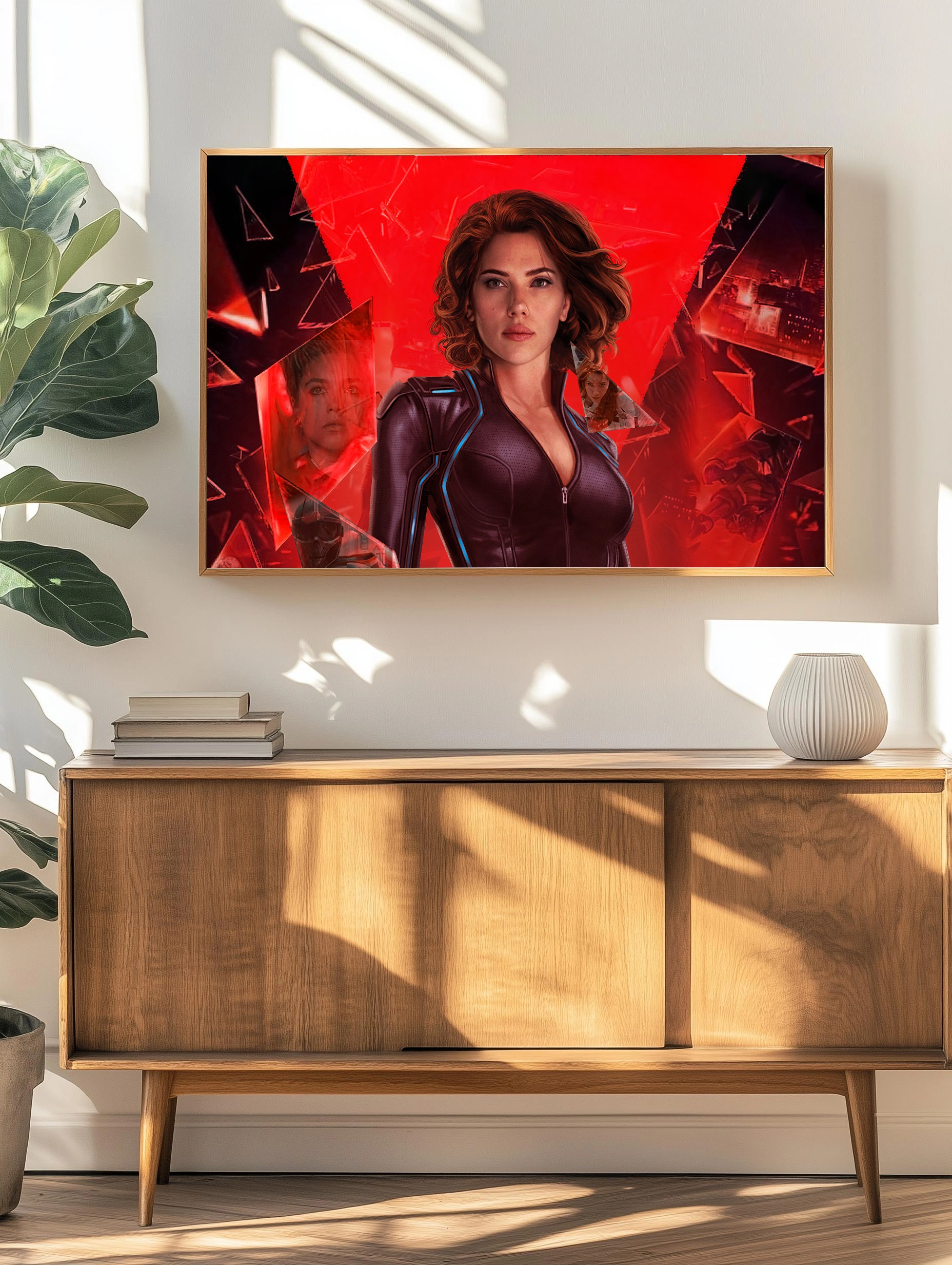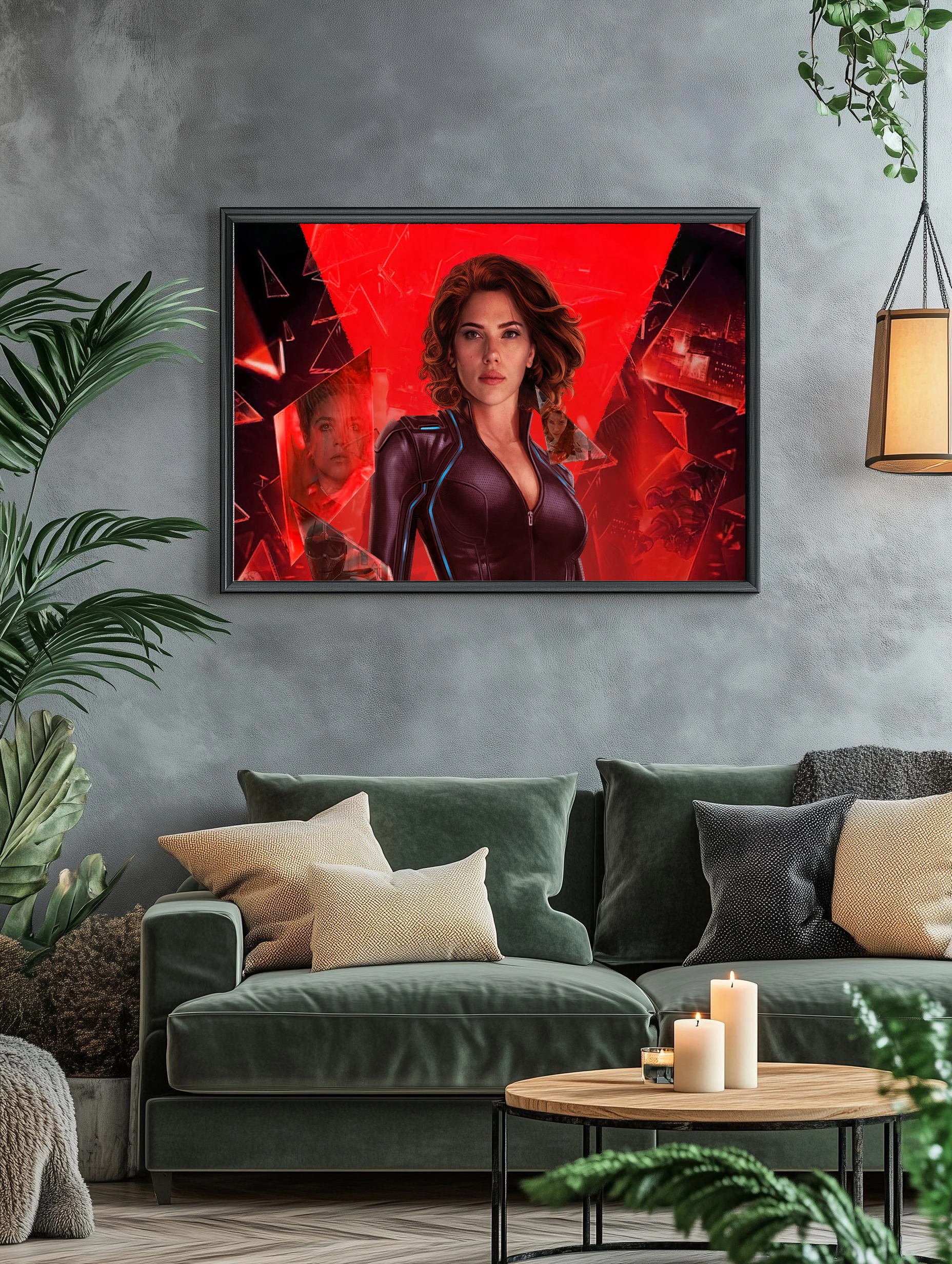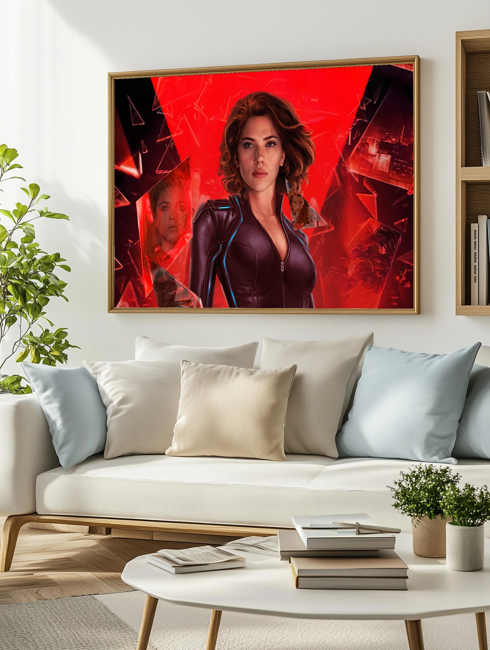Декоративный плакат с изображением Чёрной Вдовы — Наташи Романовой из киновселенной Marvel. Герой представлен на фоне красного, разорванного стекла с множеством фрагментов отражений, создающих драматичное и напряжённое настроение. Картина для гостиной, интерьера офиса и современного искусства для стен.