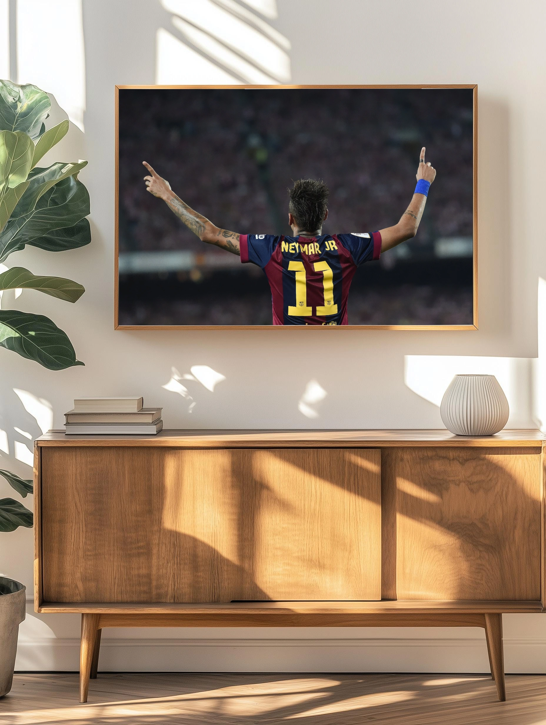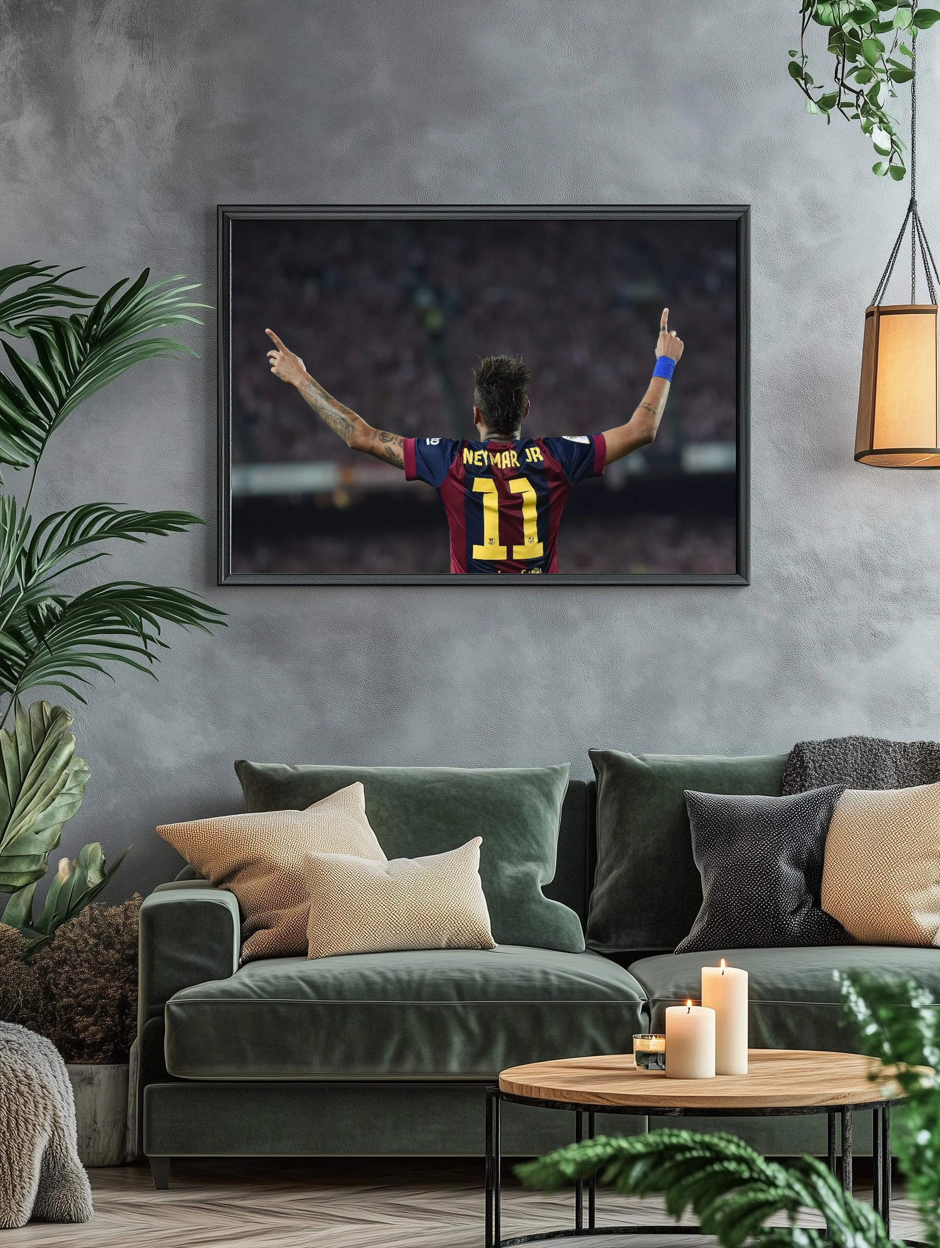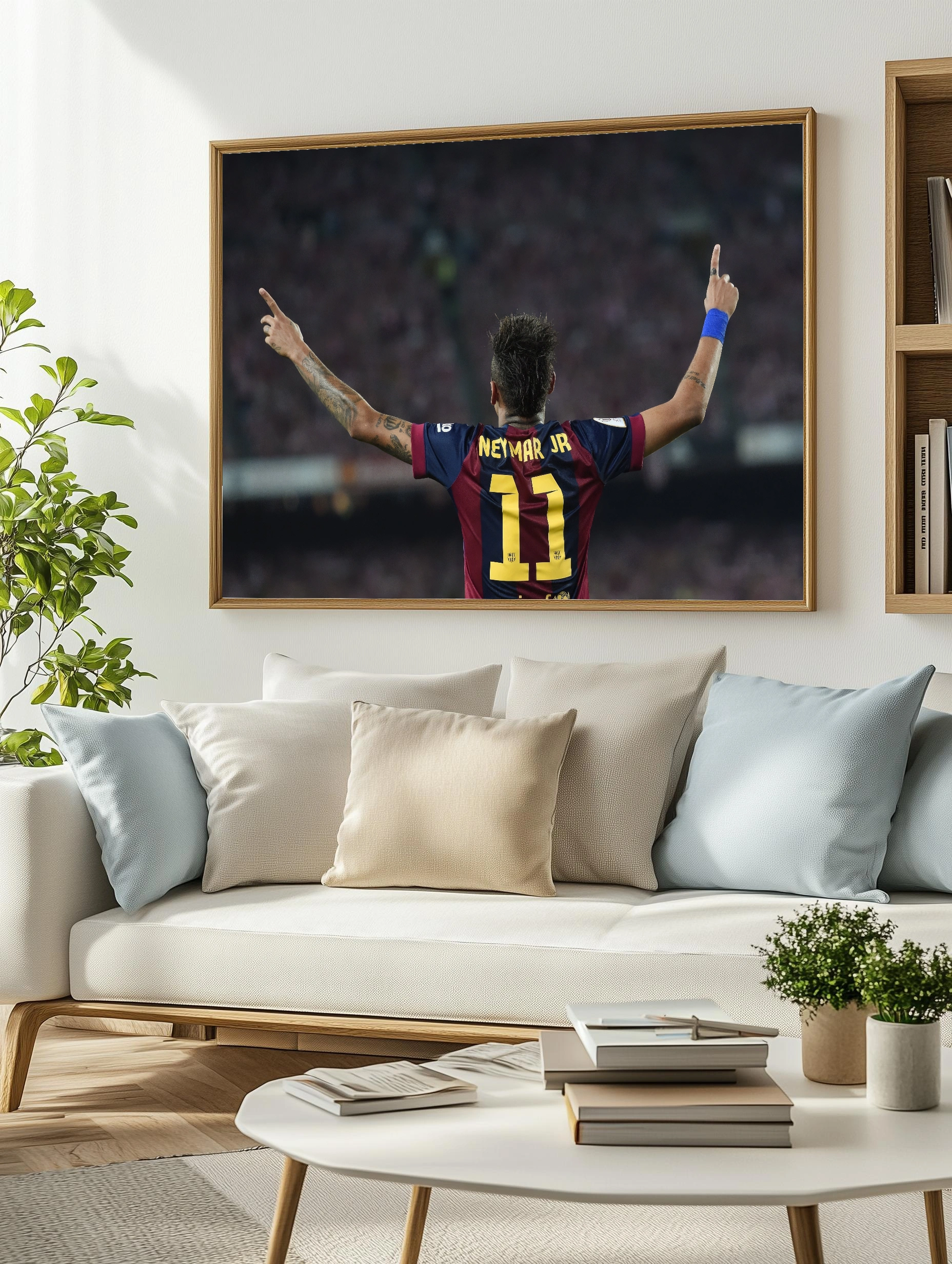 Изображение показывает известного футбольного игрока Неймара JR с поднятыми руками на стадионе. Яркая спортивная атмосфера, динамичный момент в игре. Яркие бордово-синие цвета формы и жёлтые цифры создают энергичное и активное настроение. Отличный выбор для спортивного интерьера, офиса или гостиной.