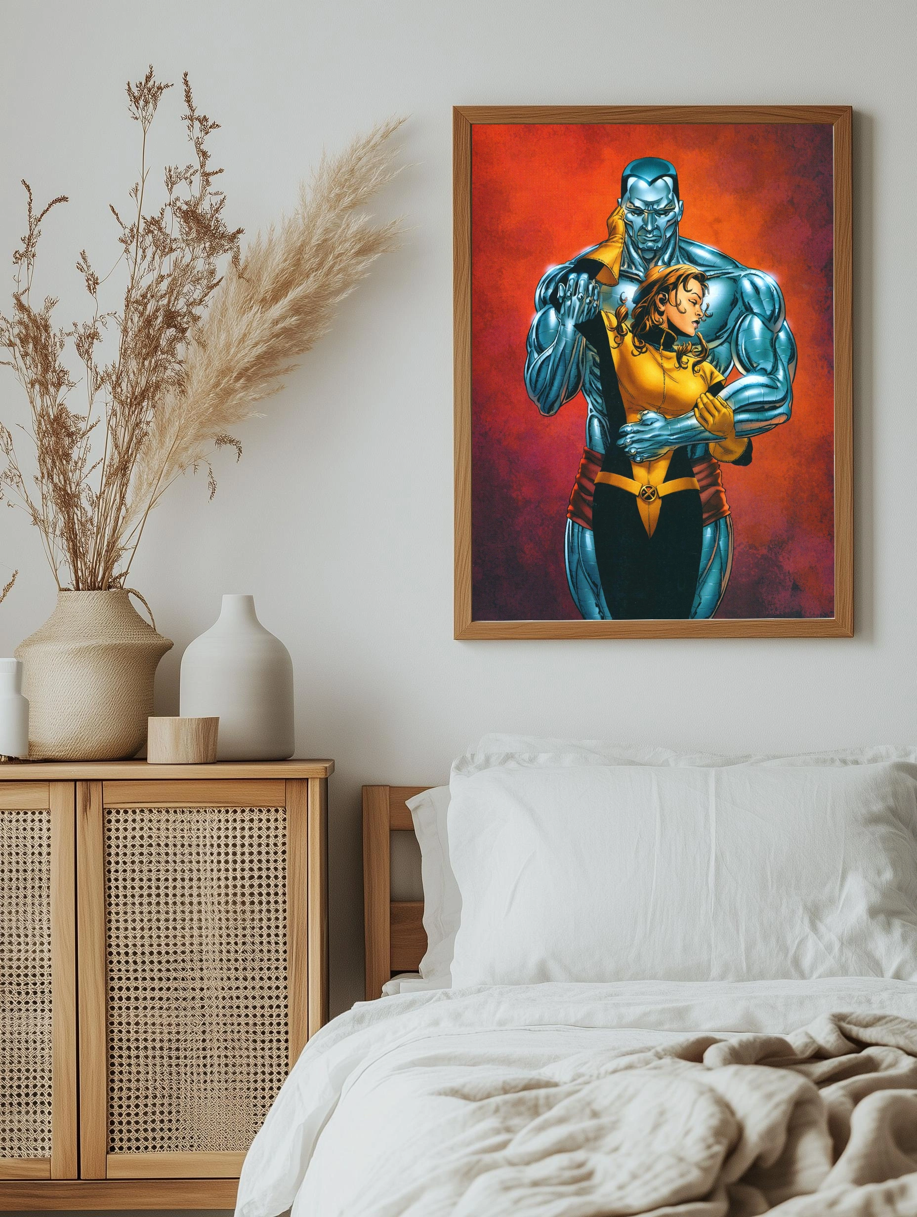 На этом художественном постере изображены известные персонажи вселенной Marvel — Колосс и Китти из команды Людей Икс. Они запечатлены в нежном объятии на фоне огненно-красного оттенка, что подчёркивает силу их связи и контраст между металлическим синим и тёплым жёлтым цветами. Идеальный интерьерный арт для поклонников супергероев, добавляющий уникальный стильный декор стен.