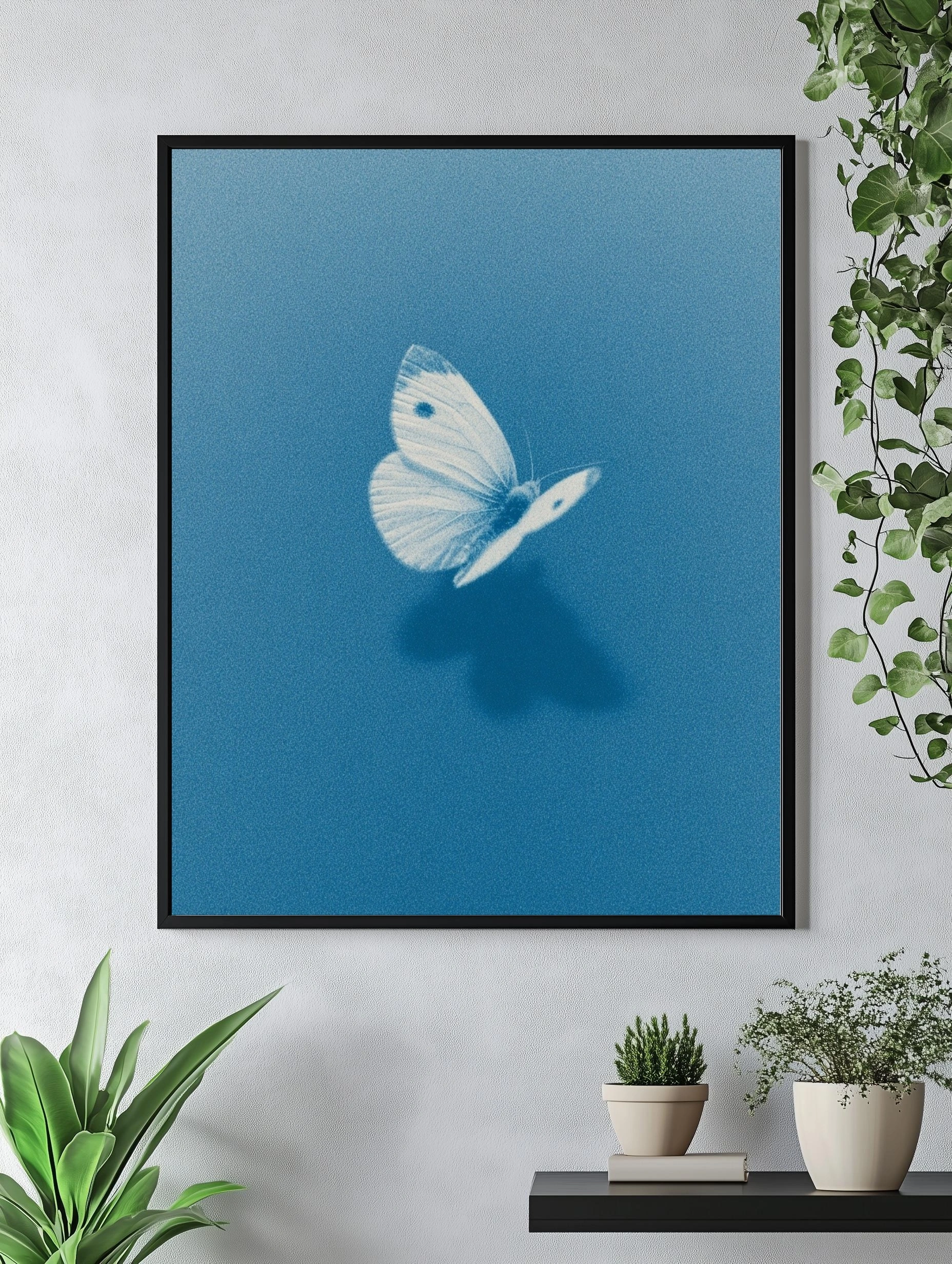 Этот постер изображает изящную бабочку, парящую в воздухе на фоне глубокого синего цвета. Бабочка с белыми крыльями и характерными черными точками создает ощущение легкости и свободы. Её тень, мягко отбрасываемая на фоне, добавляет глубину и объем, подчеркивая хрупкость и красоту природы. Синий цвет фона, от светло-голубого до насыщенного индиго, создает атмосферу спокойствия и умиротворения. Стиль изображения можно отнести к минимализму, что делает его идеальным для современных интерьеров. Этот постер станет отличным акцентом в гостиной, спальне или офисе, привнося в пространство нотки свежести и вдохновения. Он идеально подходит для молодежной аудитории, ценящей эстетику и гармонию в интерьере.