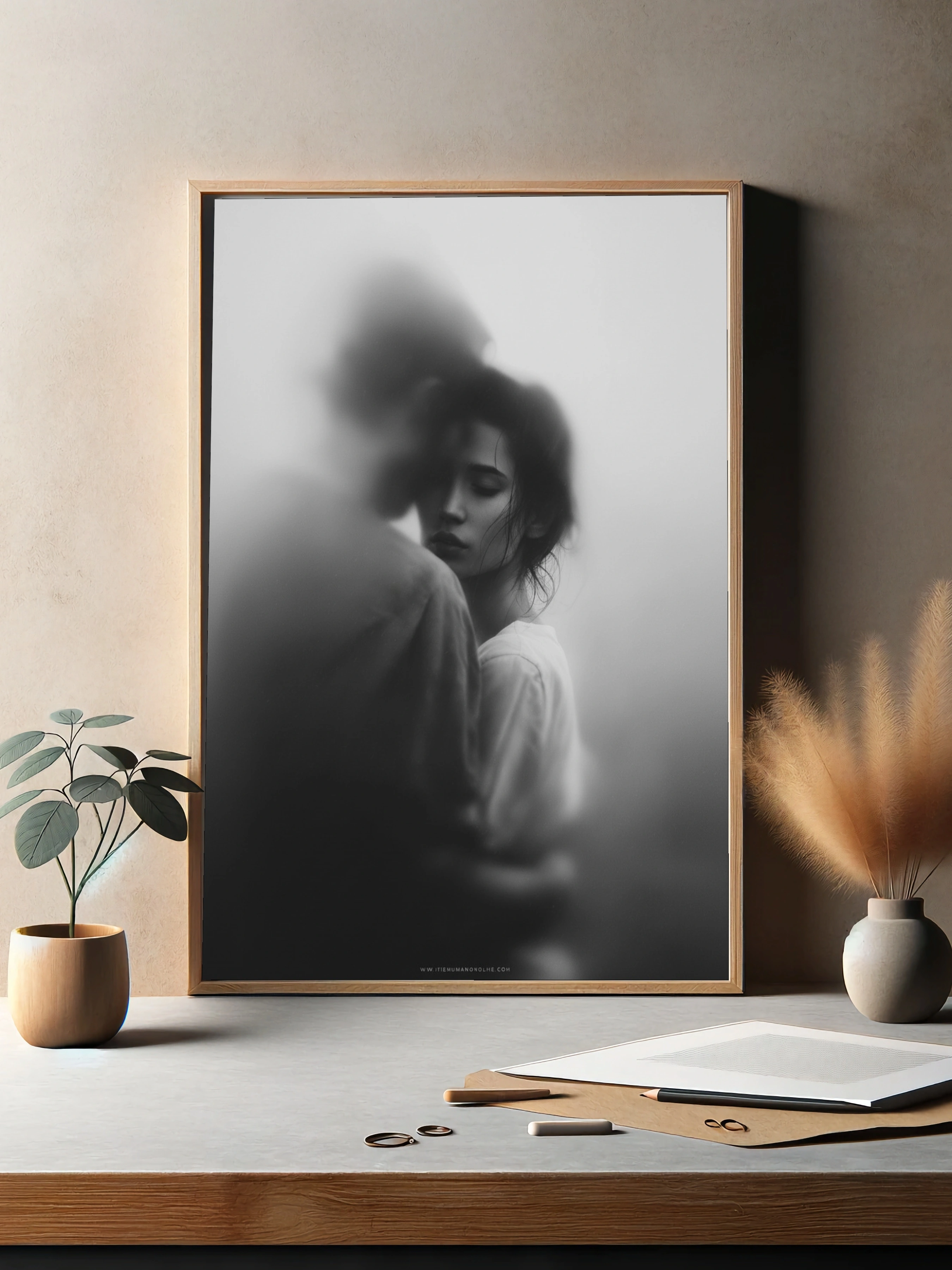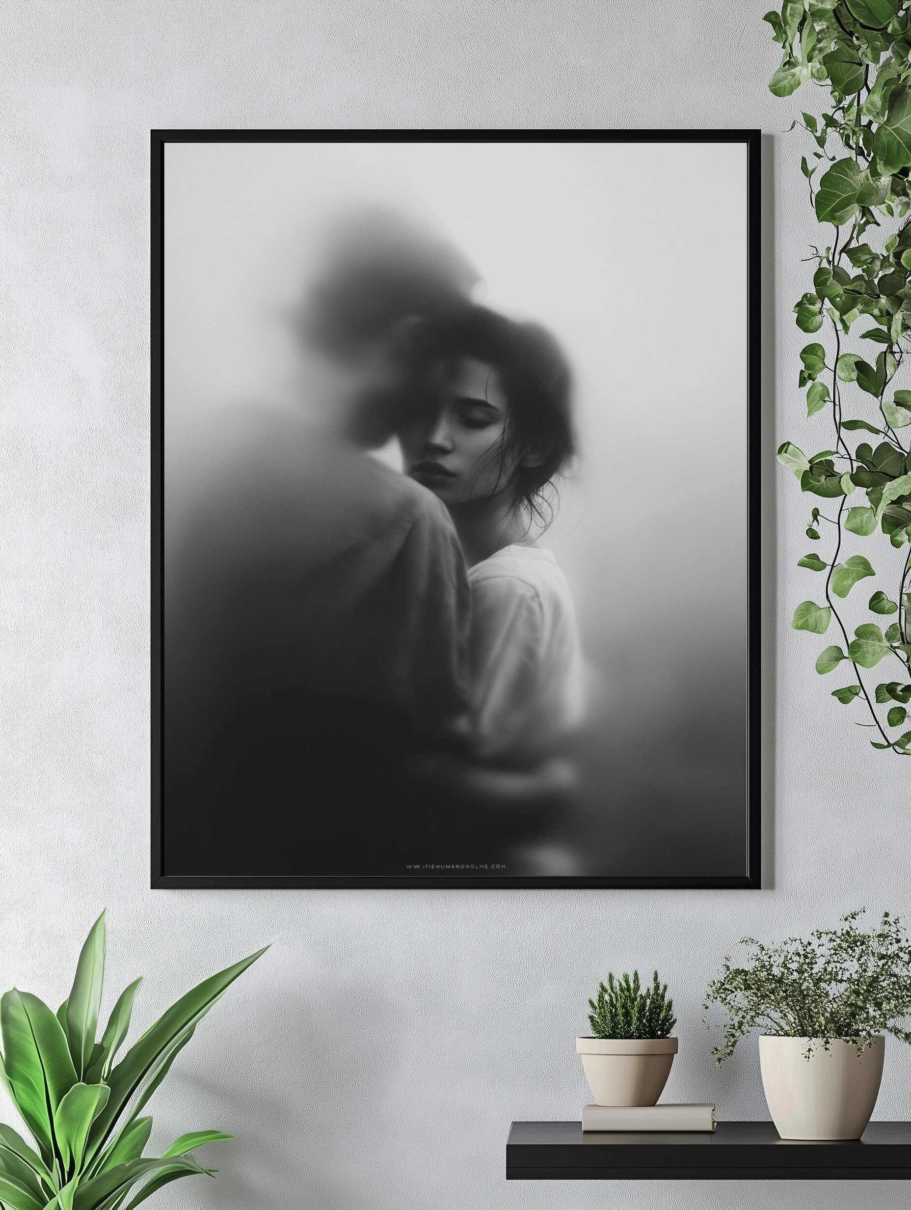 Этот постер запечатлевает трогательный момент близости между двумя людьми, окутанными легким туманом. Их лица едва различимы, что создает атмосферу загадки и интимности. Женщина с распущенными волосами и мягким выражением лица, кажется, погружена в свои мысли, в то время как мужчина, стоящий рядом, обнимает её с нежностью. Композиция выполнена в черно-белых тонах, что усиливает эмоциональную нагрузку и делает изображение более выразительным. Постер идеально впишется в интерьер спальни или гостиной, создавая уютную и романтичную атмосферу. Он станет отличным выбором для молодежной аудитории и тех, кто ценит искусство и эмоции в интерьере.