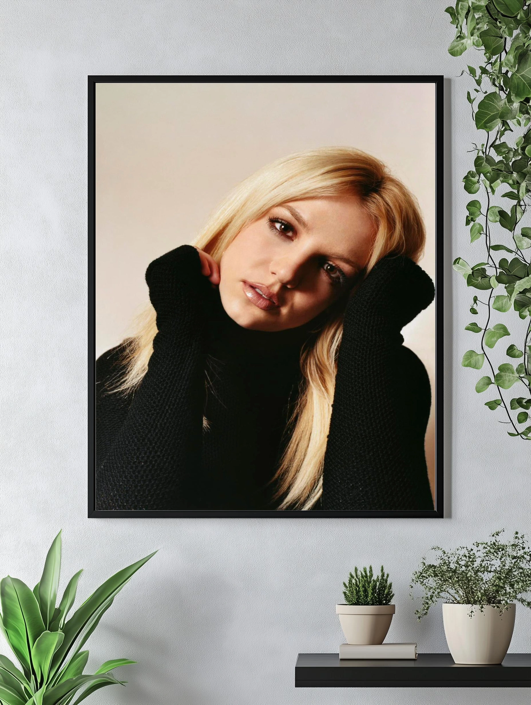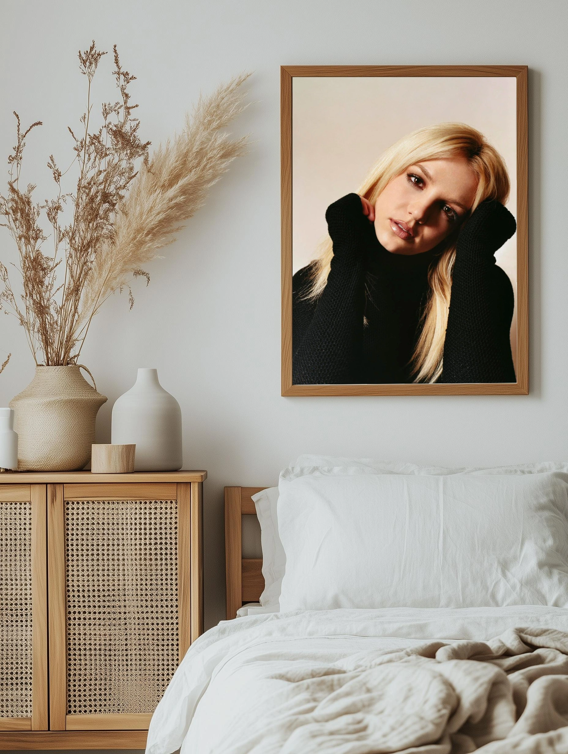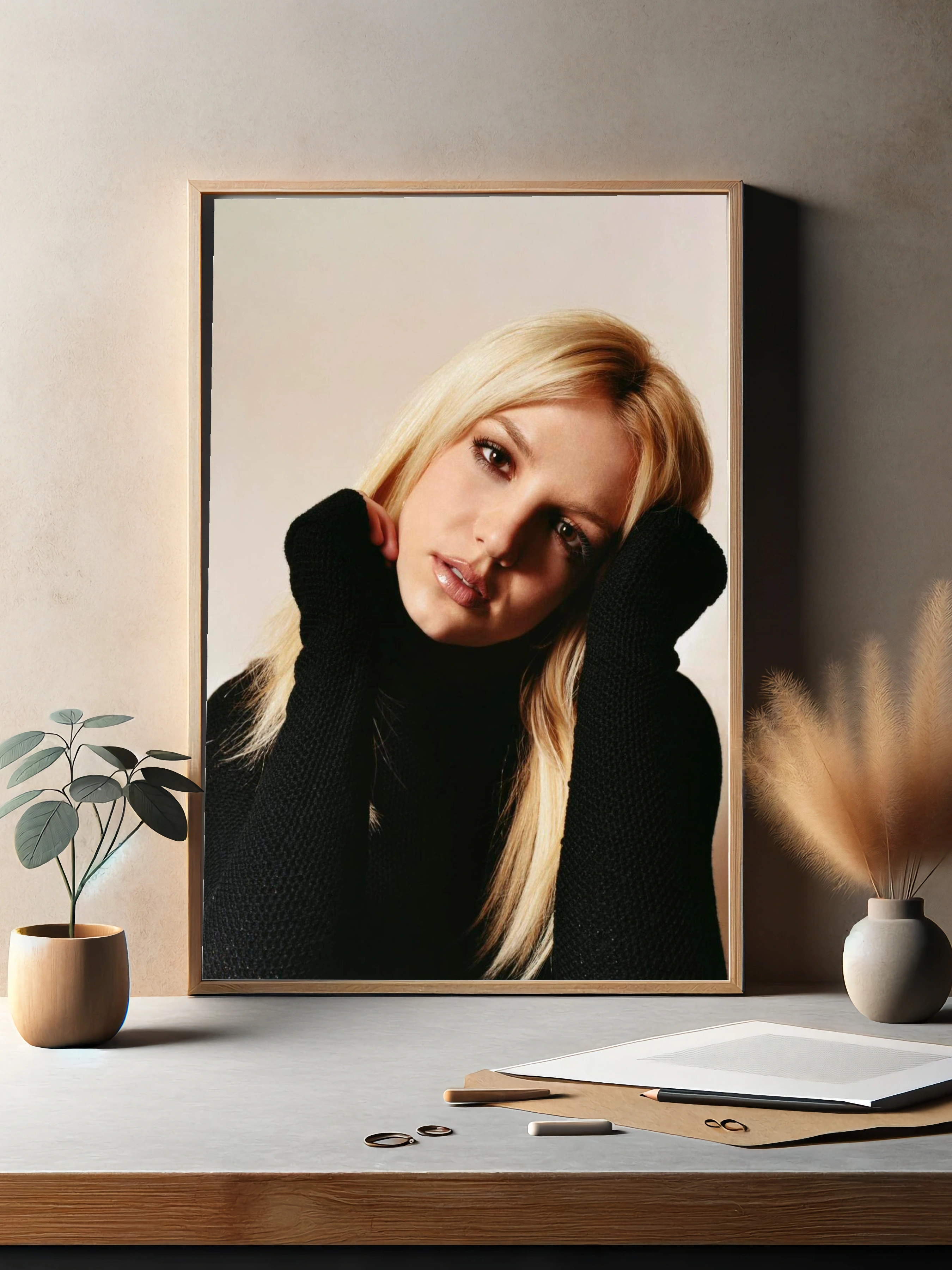 Фотокартина с портретом молодой женщины с светлыми волосами и выразительными глазами, одетой в чёрный свитер с длинными рукавами. Нейтральный бежевый фон подчёркивает естественную красоту и эмоциональность образа. Этот интерьерный арт для стен отлично подходит для гостиной, спальни или офиса, создавая атмосферу уюта и стиля.