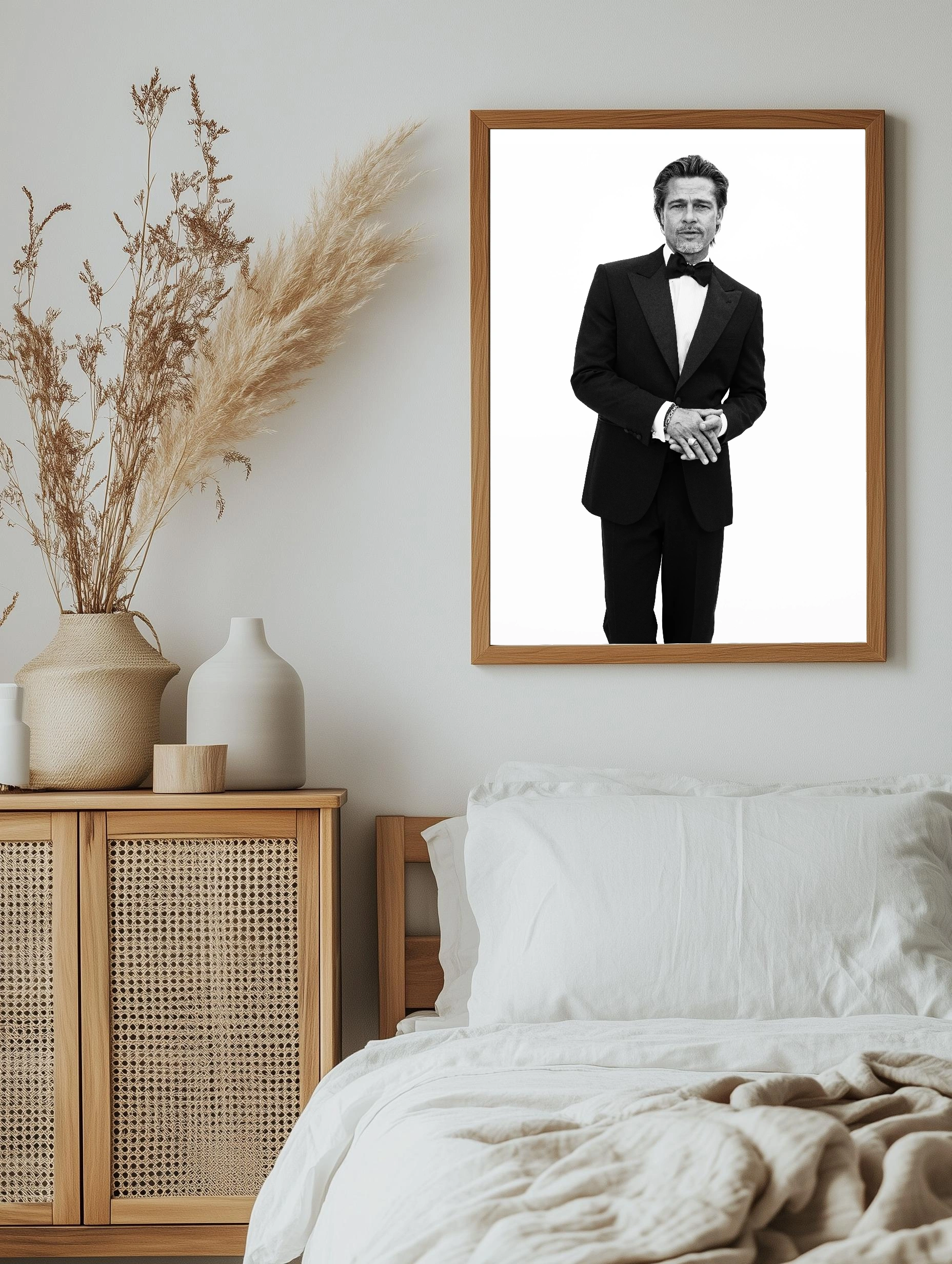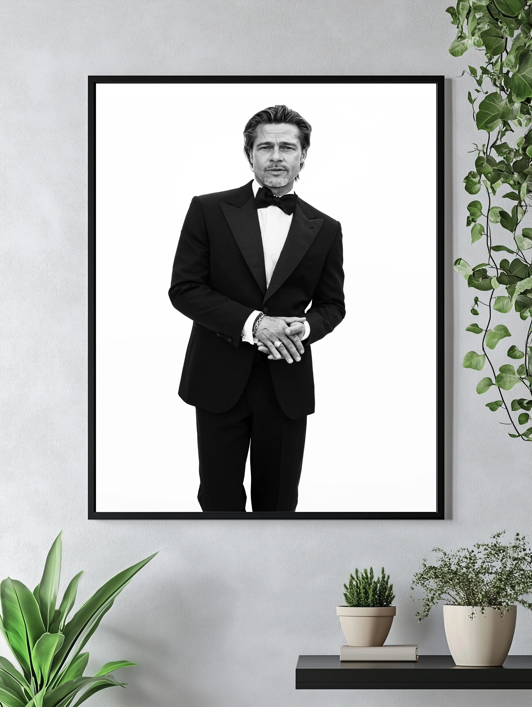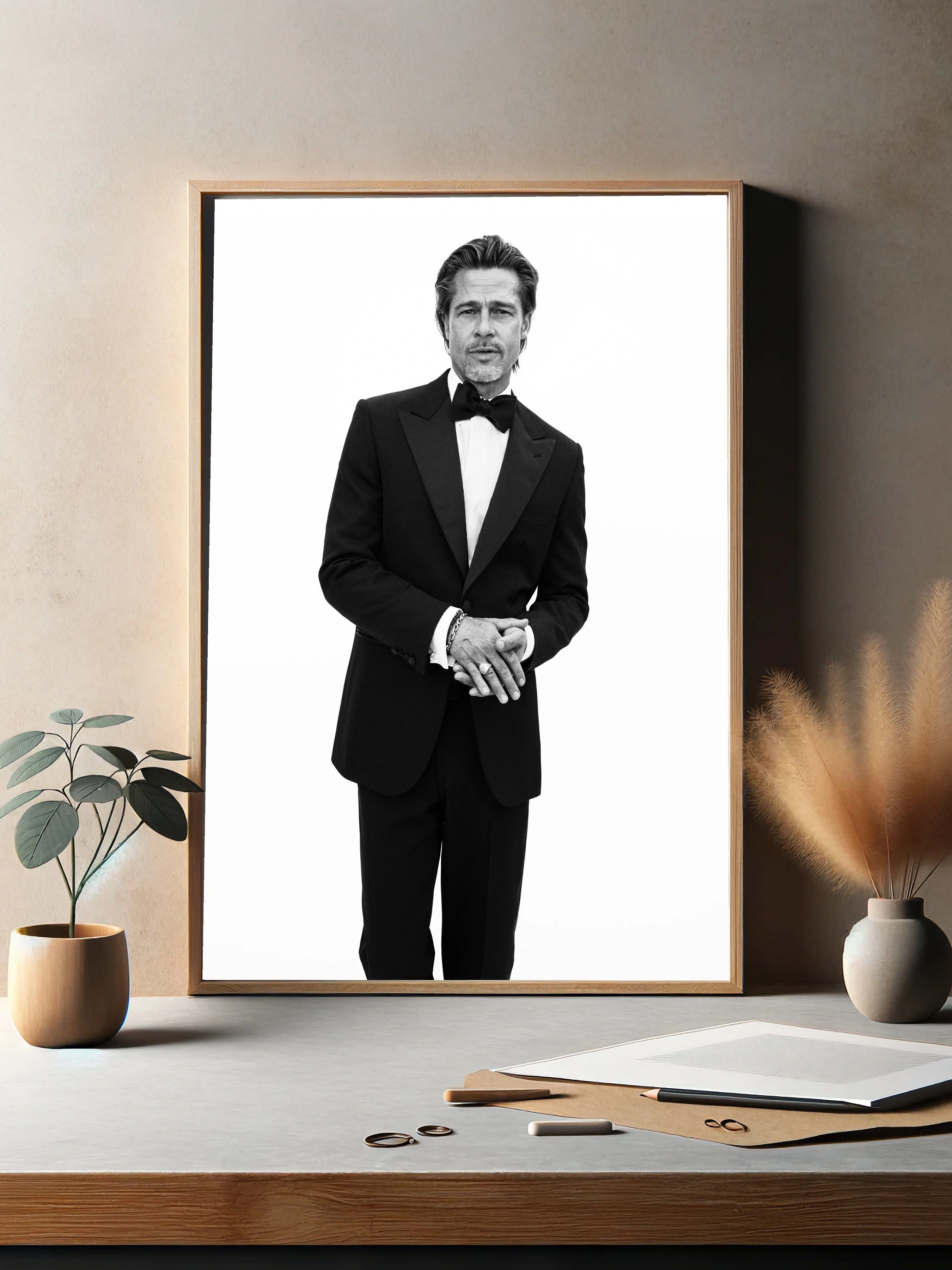 Черно-белая художественная картина с изображением Брэд Питта в классическом смокинге с бабочкой на белом фоне. Фотопортрет передает элегантность и сдержанность, идеально подходящий для интерьера гостиной или офиса. Такой декоративный плакат станет стильным декором стен и современным искусством для дома.