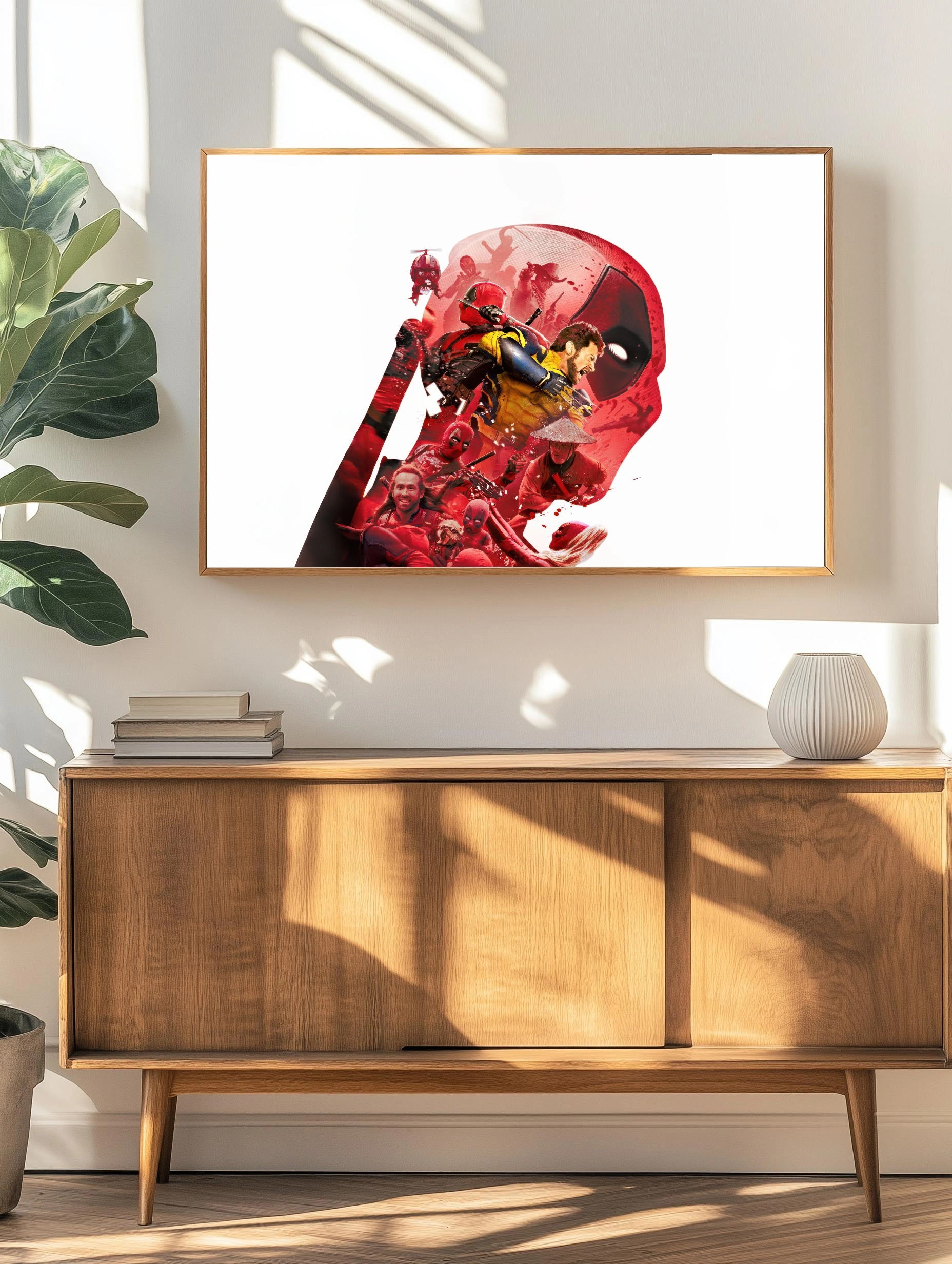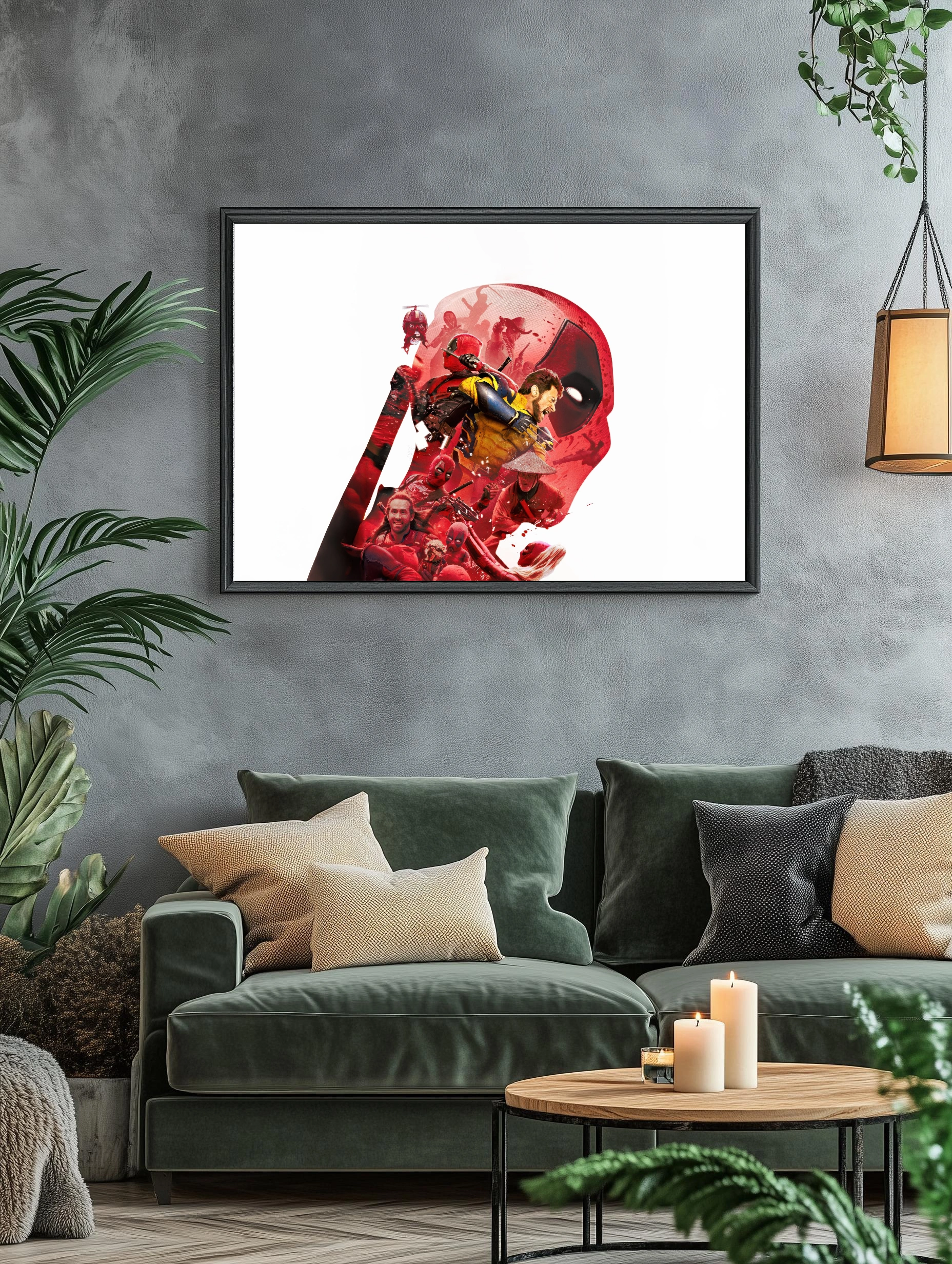 Изображение представляет собой художественный коллаж с персонажем Дэдпулом из одноимённого кино и актёром Райаном Рейнольдсом, который исполнил эту роль. Стиль сочетает динамичную композицию с насыщенной красной гаммой и элементами экшена, что создаёт ощущение энергии и драйва. Это уникальная картина для интерьера, идеально подходящая как декоративный плакат или художественный постер для стен в гостиной или офисе.