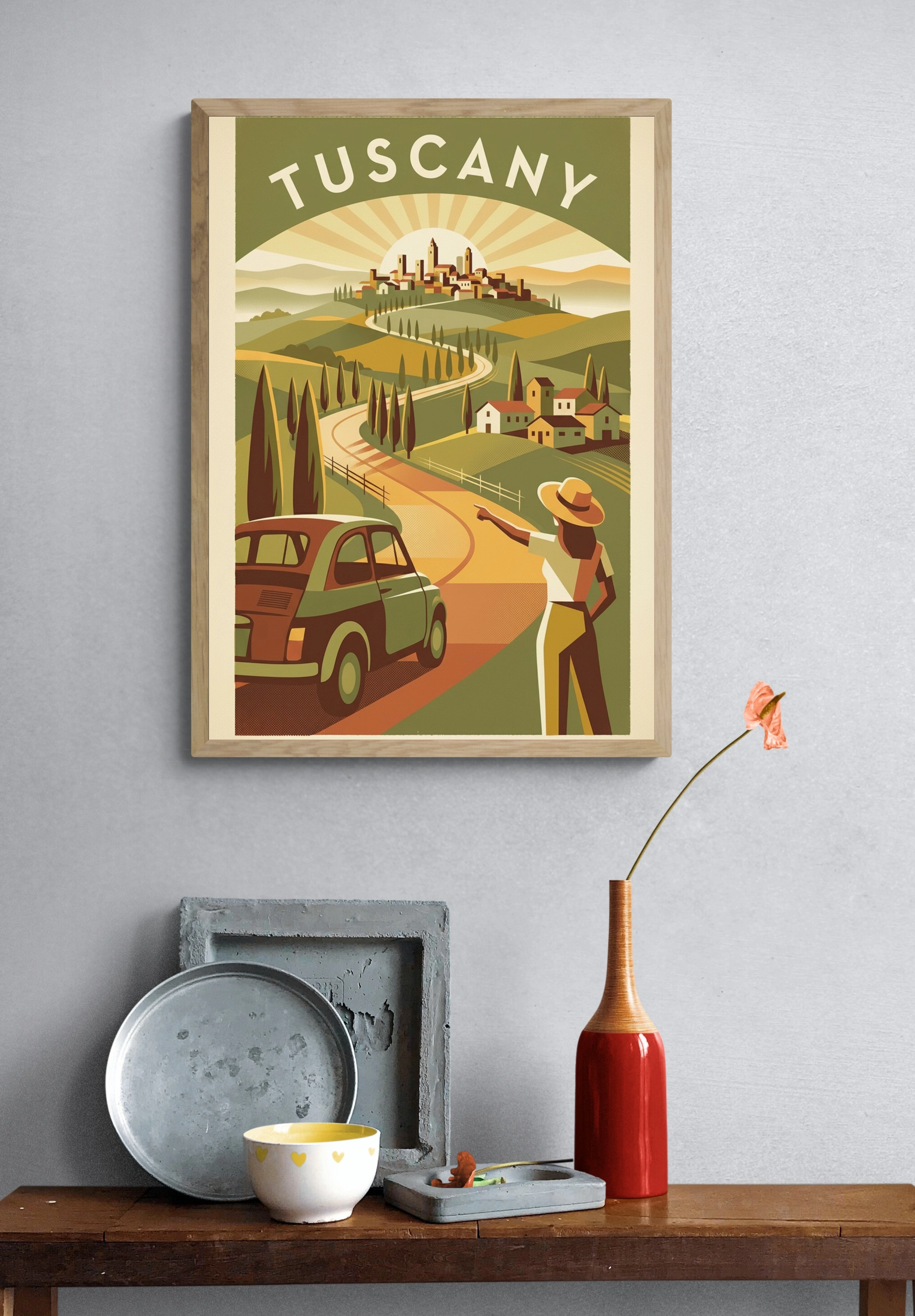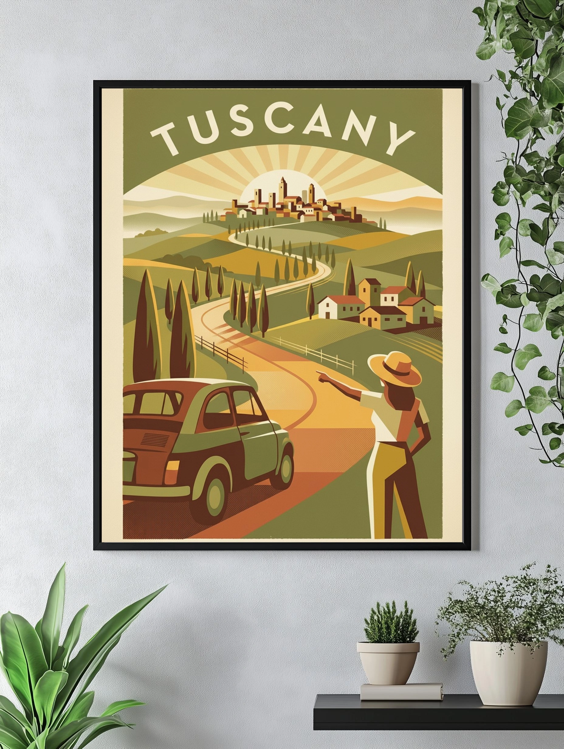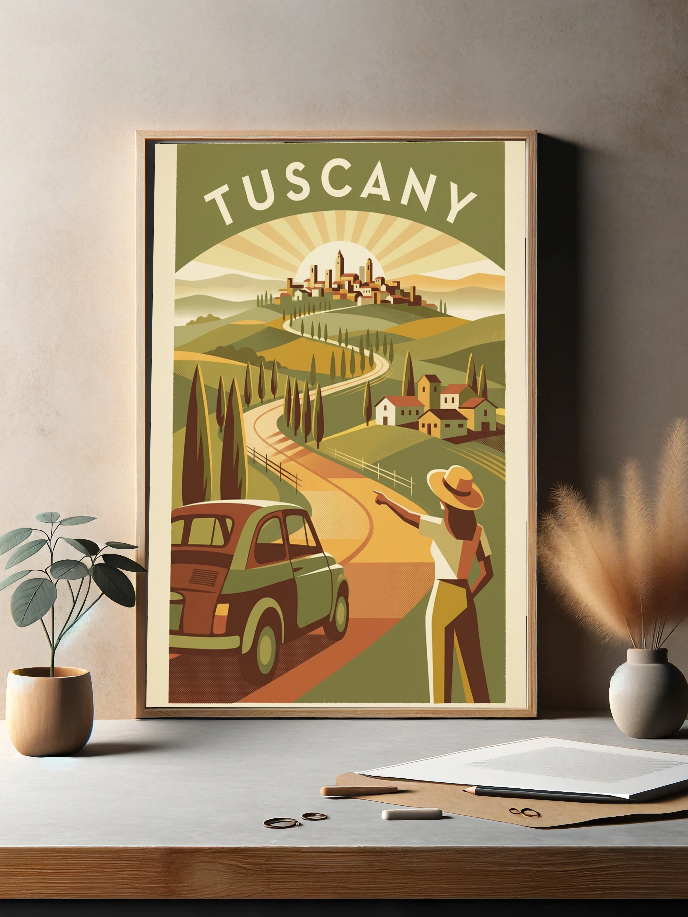 Погрузитесь в атмосферу Тосканы с этим великолепным постером, который изображает живописный пейзаж с извивающейся дорогой, ведущей к уютному городку на холме. На переднем плане — стильный ретро-автомобиль, а рядом с ним стоит женщина в белой блузке и светлых брюках, с шляпой на голове, указывающая в сторону горизонта. За ней раскинулись зелёные холмы, усыпаные кипарисами и маленькими домиками с красными крышами. Солнечные лучи мягко освещают сцену, создавая теплую и уютную атмосферу, которая вдохновляет на путешествия и приключения.