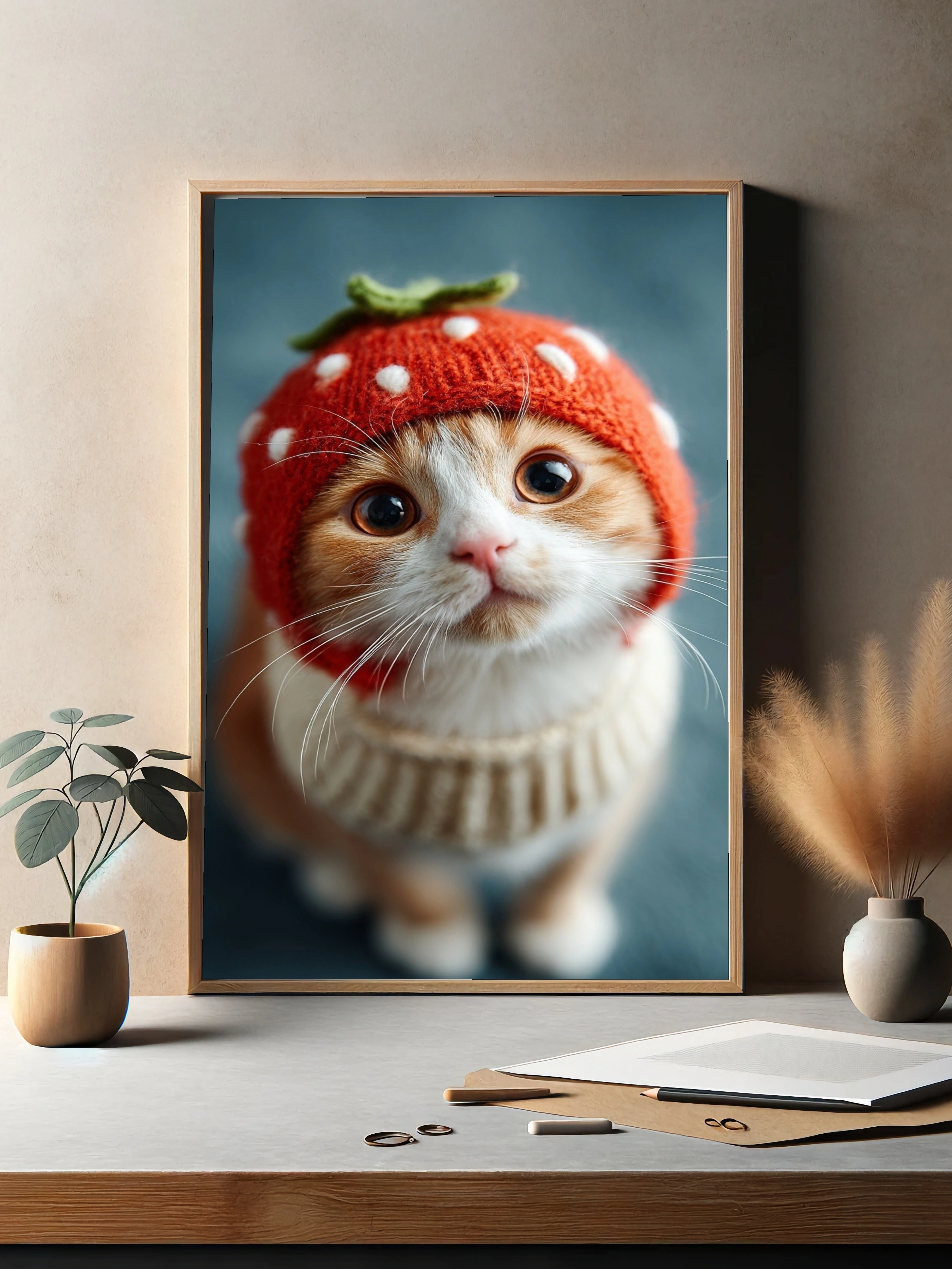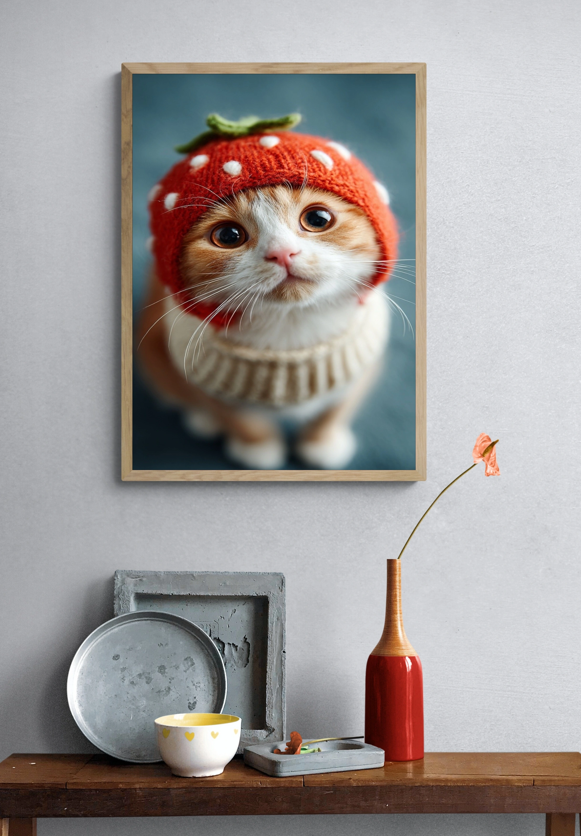 Этот милый постер с изображением котенка в клубничной шапке и уютном свитере станет настоящим украшением вашего интерьера! Котенок с большими, выразительными глазами и нежным розовым носиком привлекает внимание и вызывает улыбку. Яркая оранжевая шапка с белыми горошками и зеленым листочком создает игривый и веселый образ, а светлый свитер добавляет уюта и тепла. Фон в нежных голубых оттенках подчеркивает красоту главного героя, создавая атмосферу спокойствия и радости. Этот постер идеально подойдет для детской комнаты, гостиной или даже офиса, добавляя нотку игривости и позитива в любое пространство. Он станет отличным подарком для любителей животных и всех, кто ценит милые и забавные вещи!