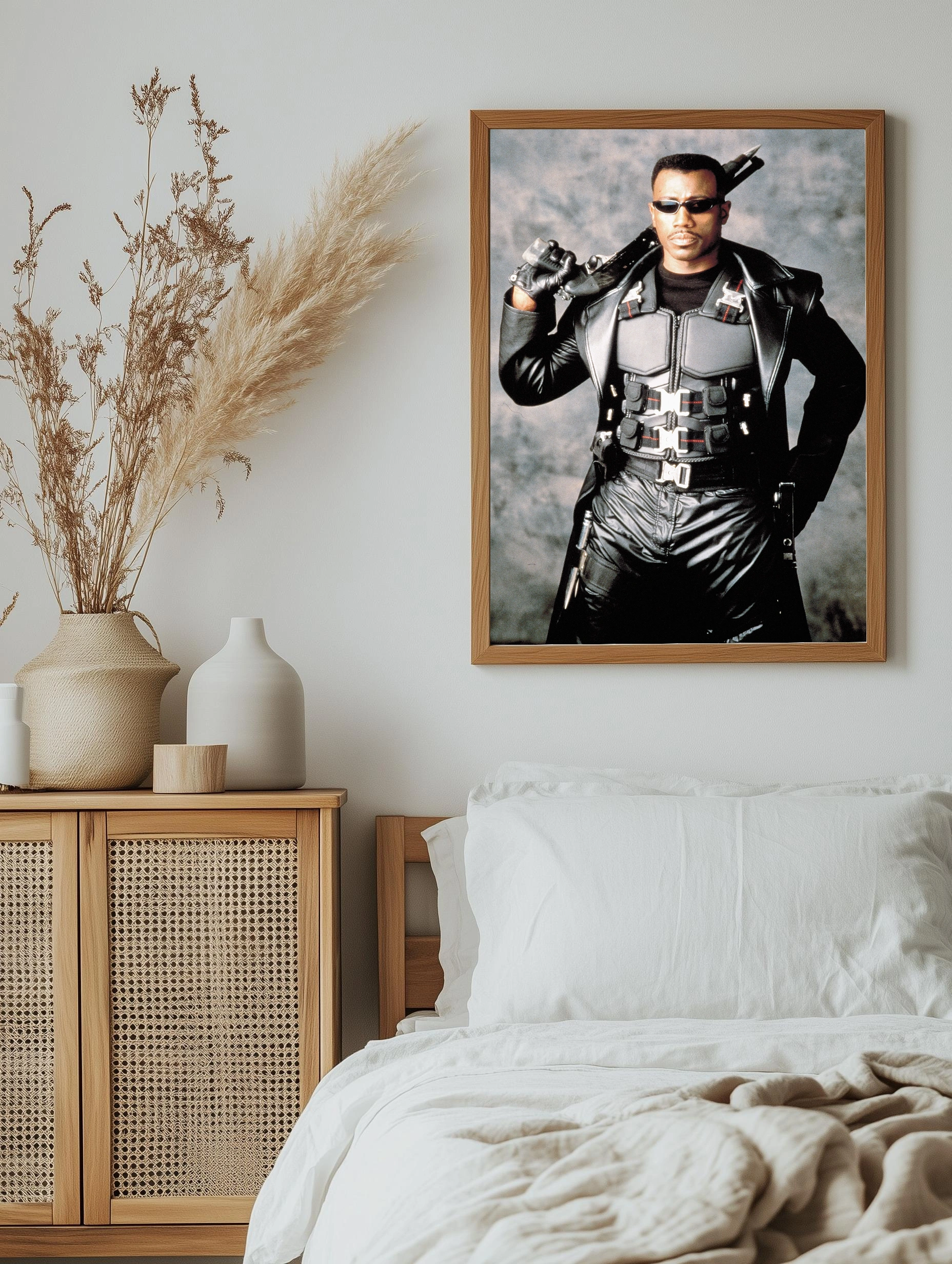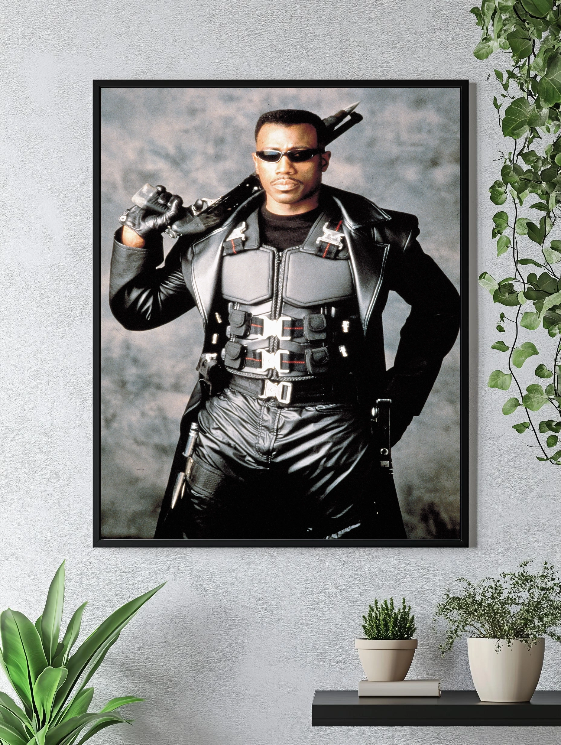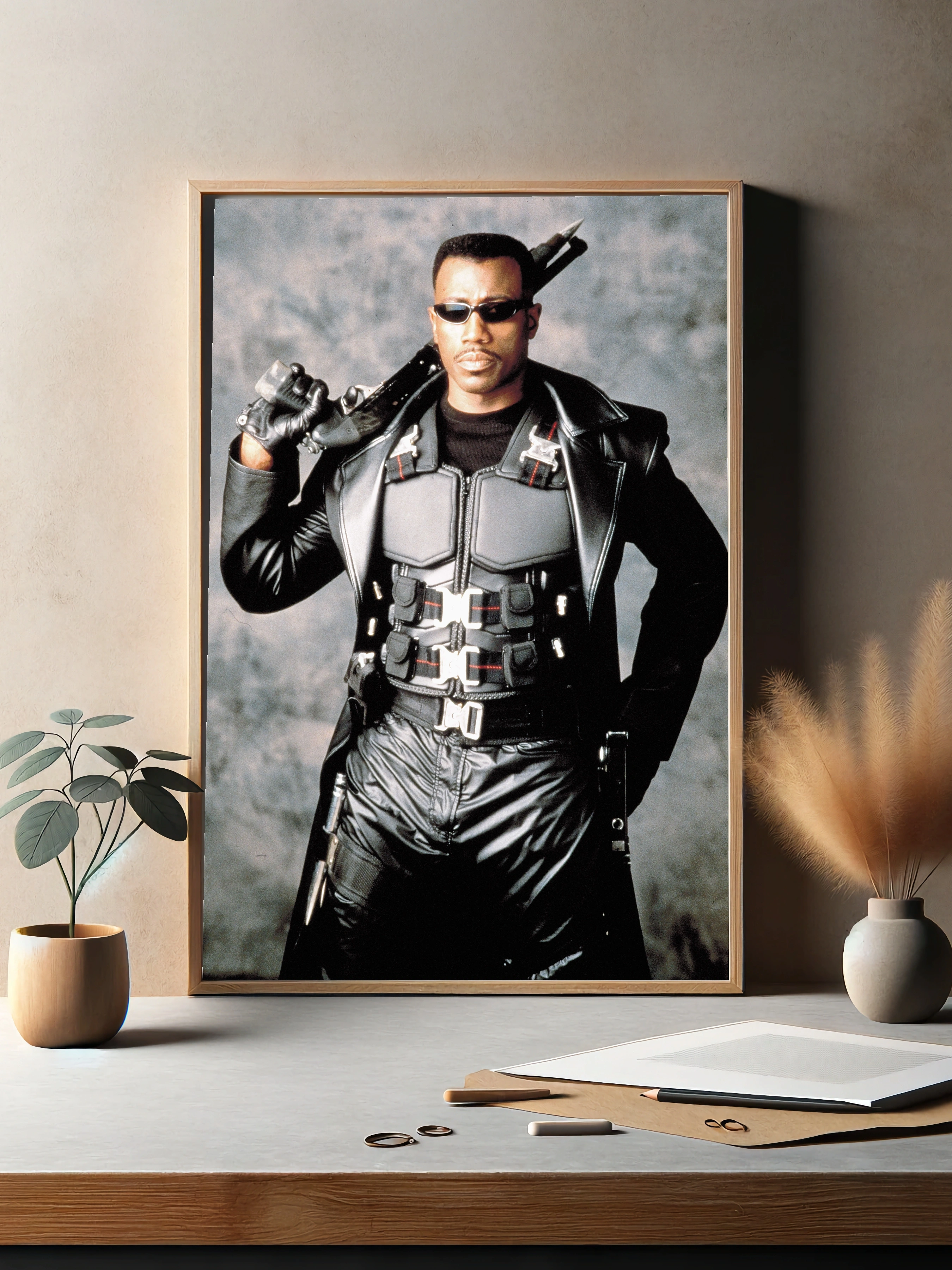 На изображении представлен Блейд — культовый герой из одноимённого фильма, облачённый в чёрную кожаную экипировку с бронежилетом и солнечными очками, с оружием на плече. Строгий фон подчёркивает мрачную атмосферу, а динамичная поза героя создаёт настроение силы и решимости. Идеально подходит как декоративный плакат для интерьера в стиле современного искусства и интерьерное искусство для спальни или офиса.