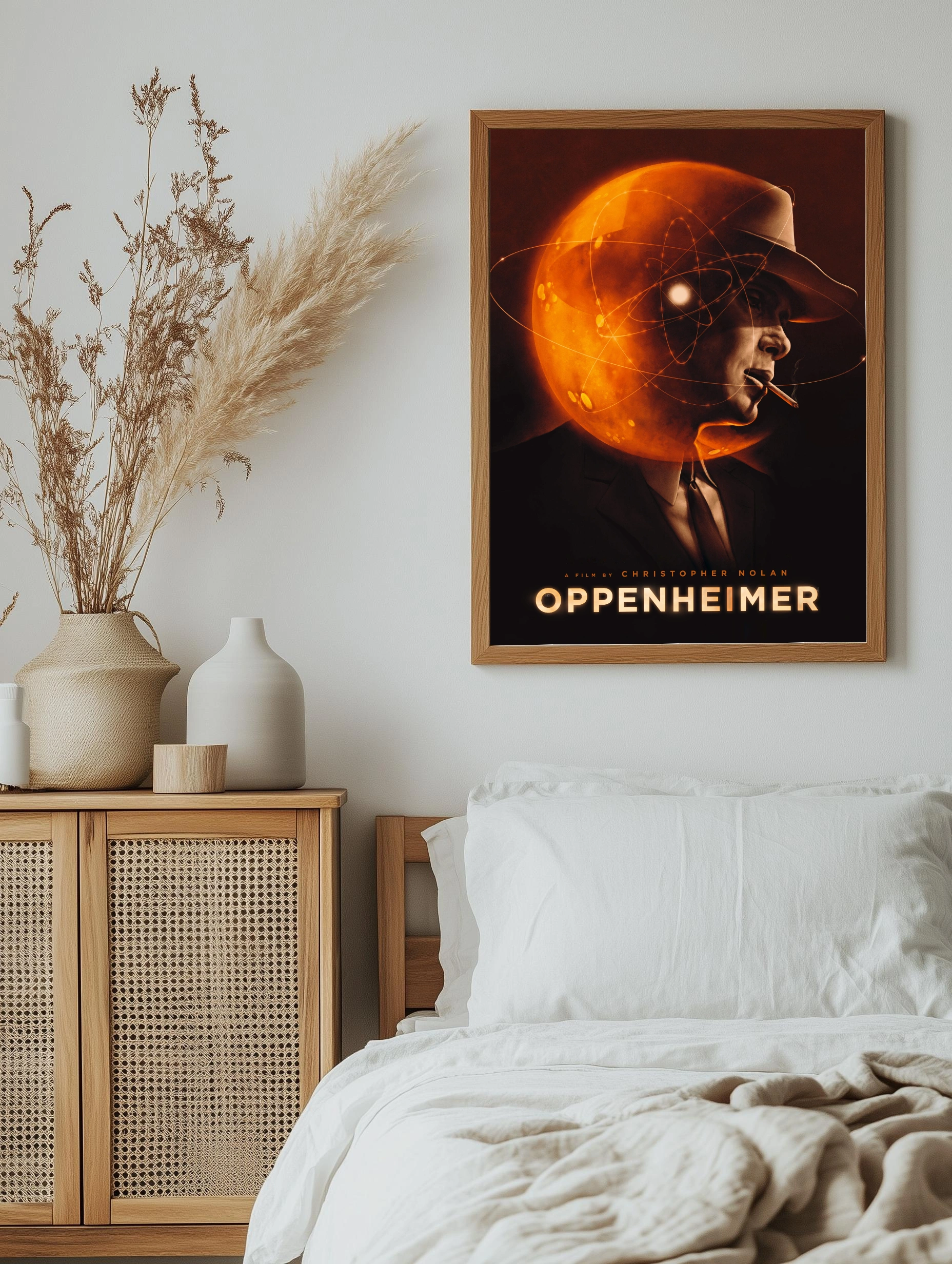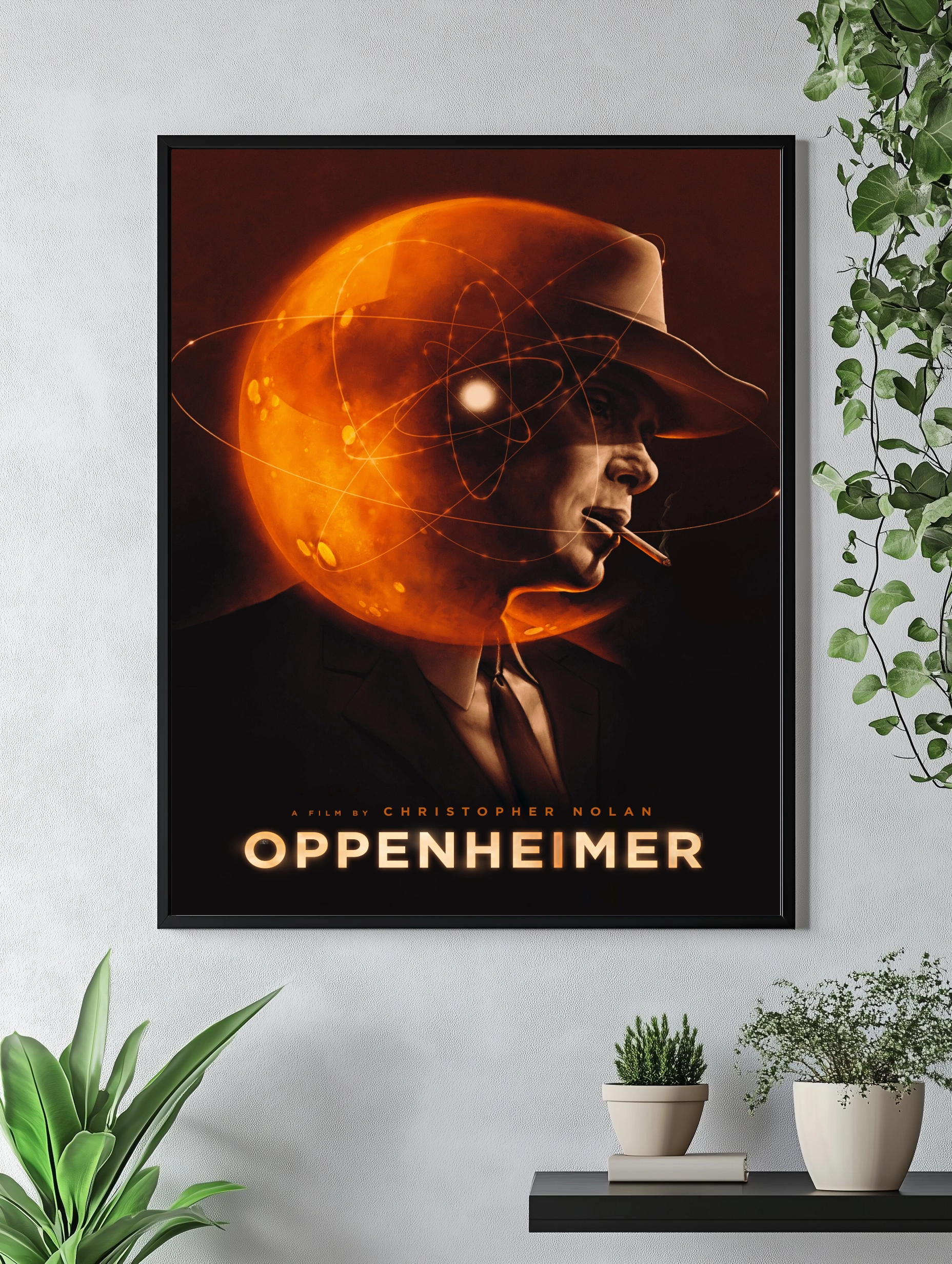 Декоративный постер на холсте с изображением знаменитого ученого Роберта Оппенгеймера. Абстрактный оранжевый лунный диск формирует фон и одновременно шляпу героя, вокруг которой стилизованно изображены орбитальные линии атома. Картина для интерьера передает драматизм эпохи ядерных исследований и личность в тени событий. Современное искусство для стен подойдет для гостиной или кабинета.