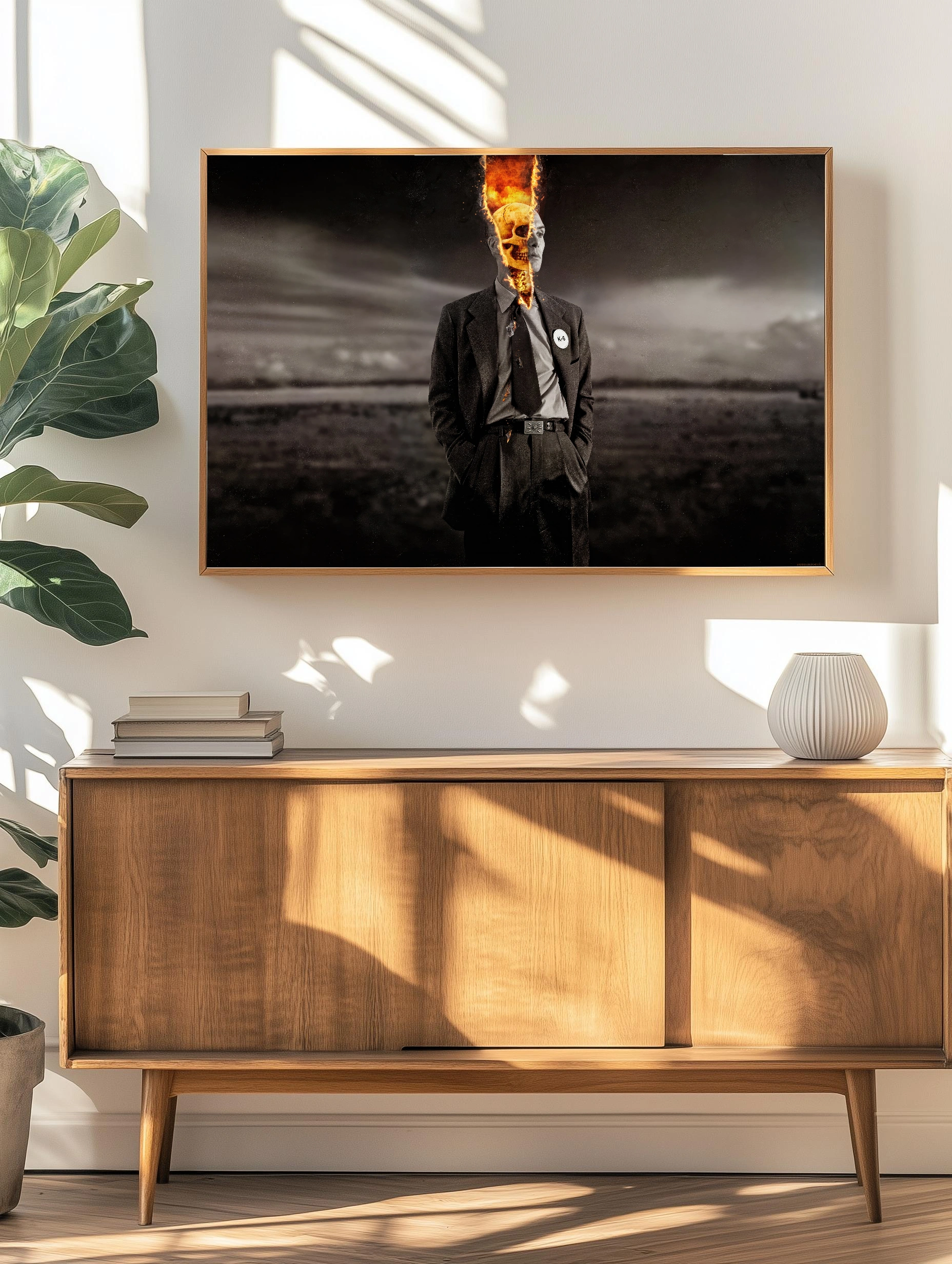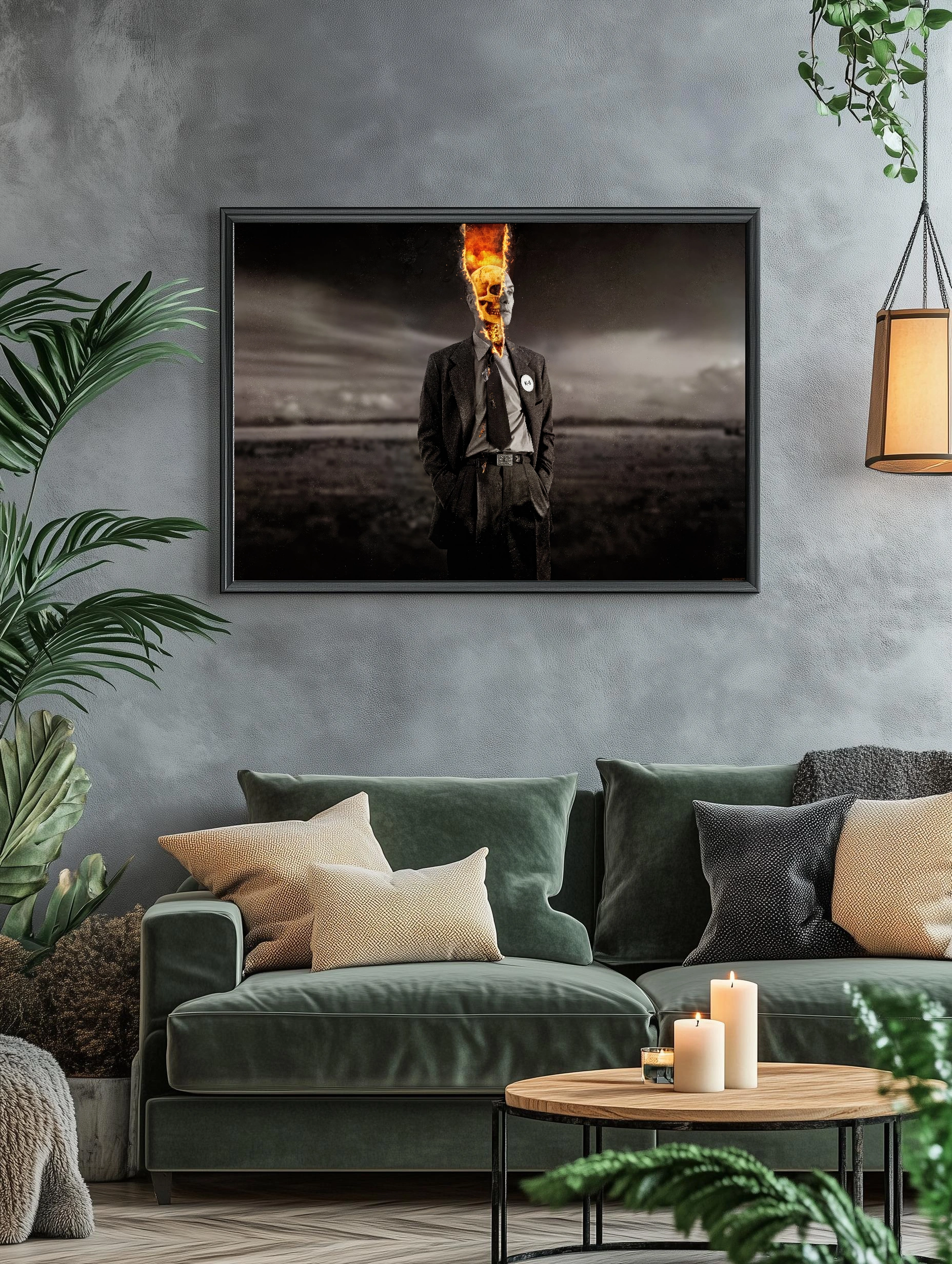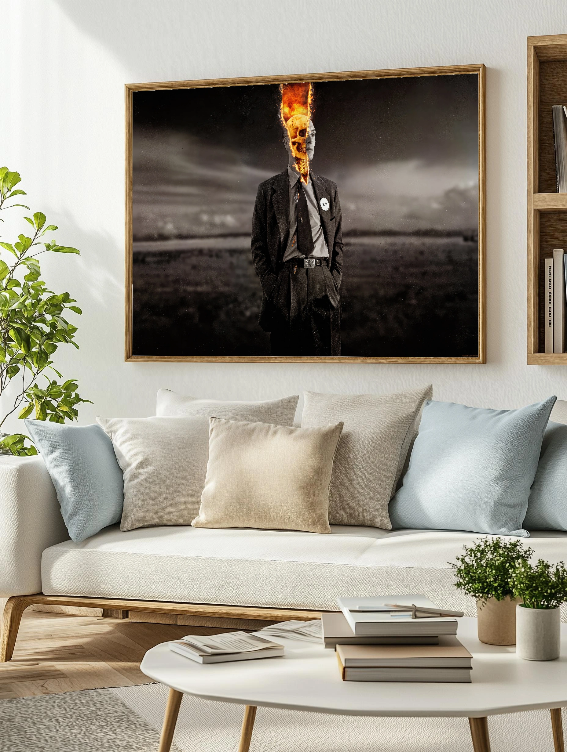 Изображение демонстрирует таинственного мужчину в классическом деловом костюме с черным галстуком, чье лицо частично трансформируется в горящий огненный череп. Фон приобретает мрачный, дымчатый оттенок, создавая атмосферу сюрреализма и мистики. Этот художественный плакат отлично подойдет как интерьерное искусство и стильный декоративный плакат для дома или офиса.