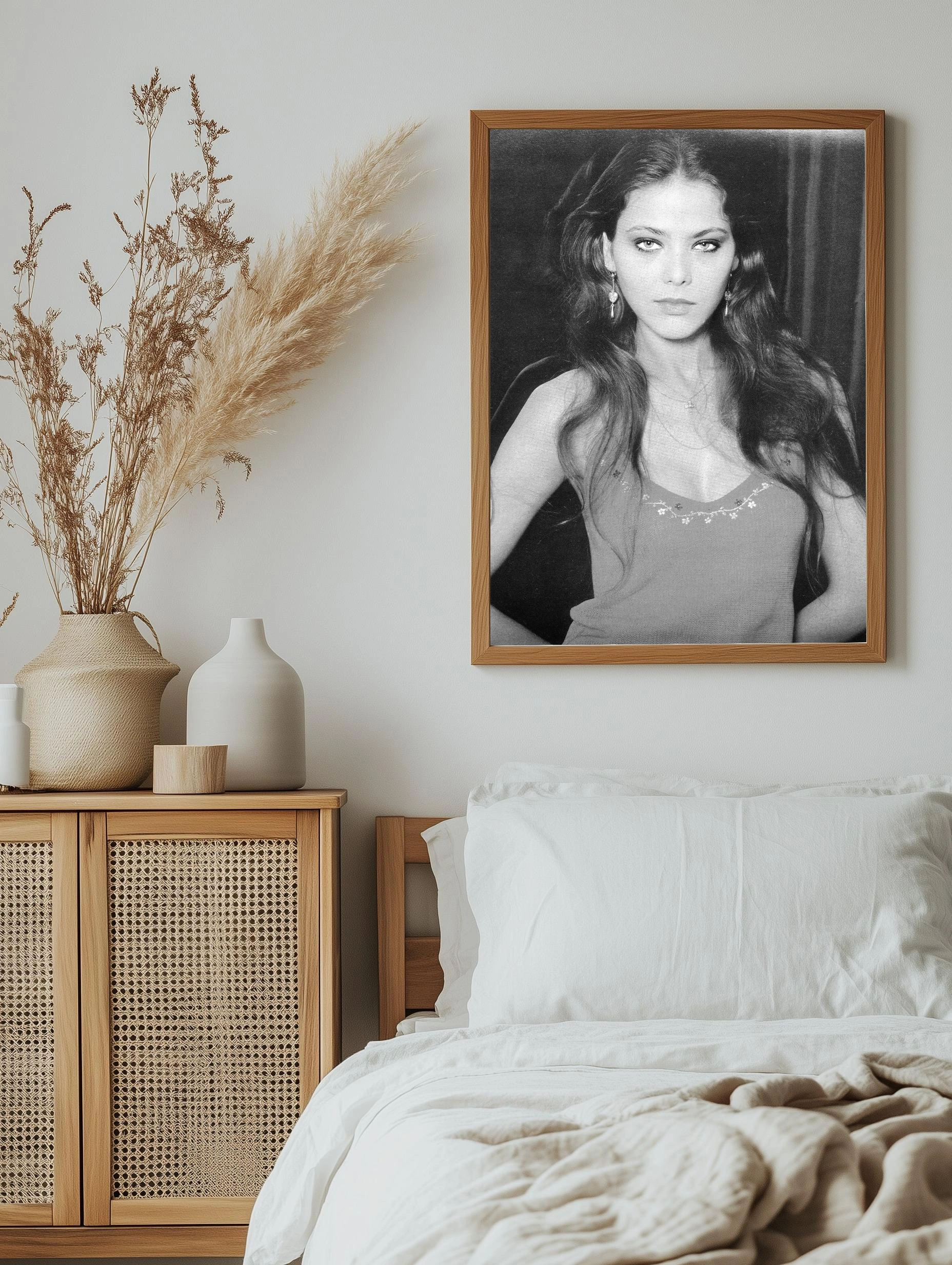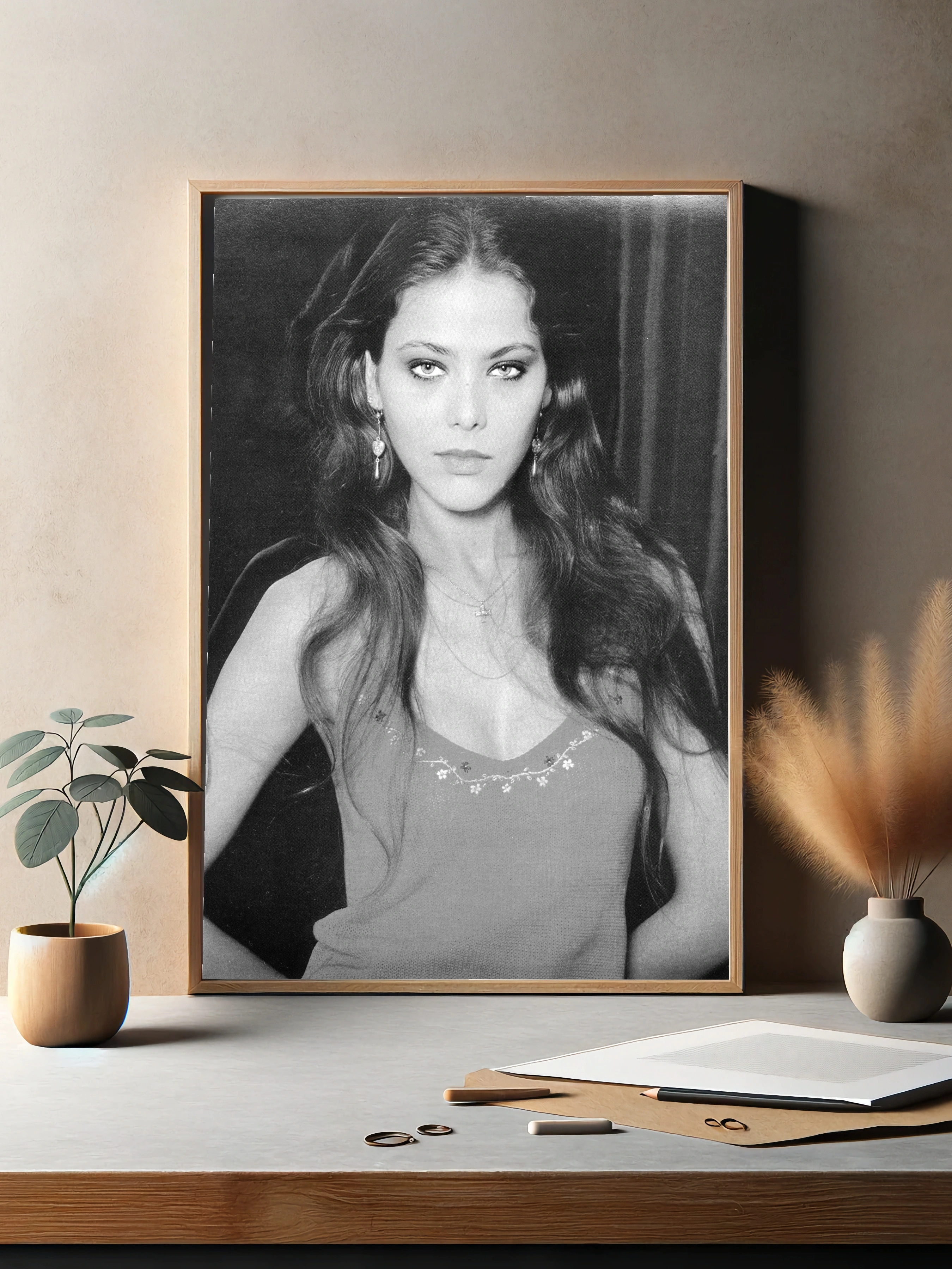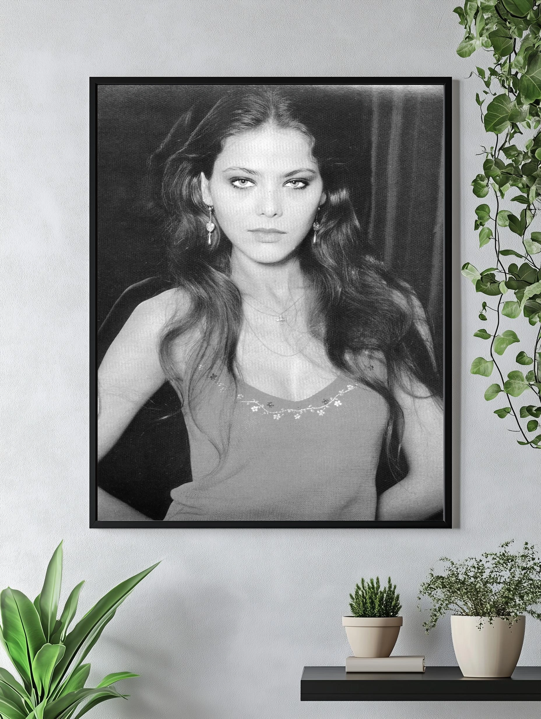 На изображении представлен крупный черно-белый портрет молодой женщины с длинными волнистыми волосами. Она смотрит прямо в камеру с выразительными светлыми глазами, в ушах серьги, на шее — тонкие цепочки с крестиком. Стиль фотографии классический и элегантный, что делает изображение подходящим для интерьерного декора, представляя собой художественный плакат с уникальной эмоциональной глубиной, отлично впишется в гостиную или офис.