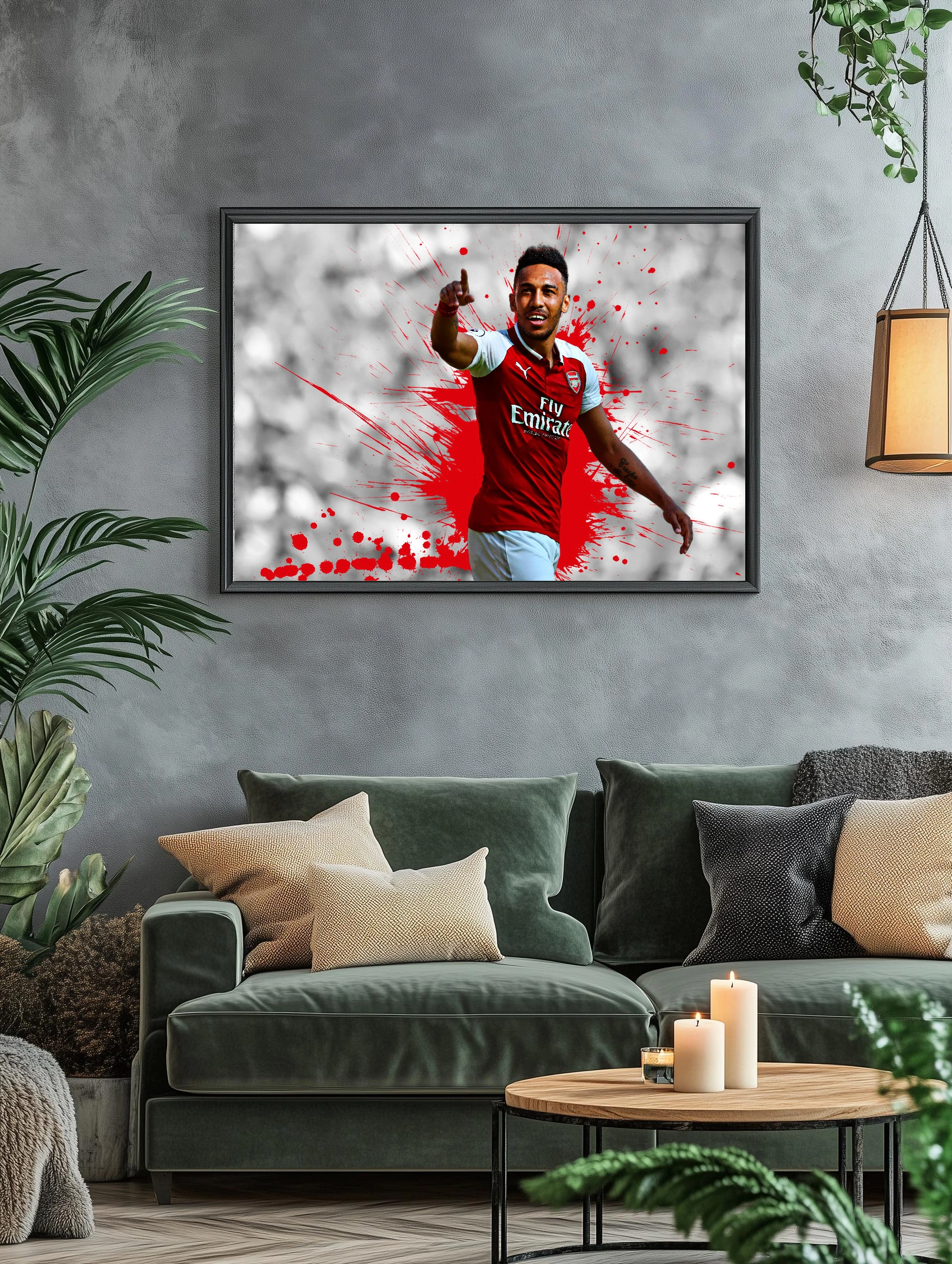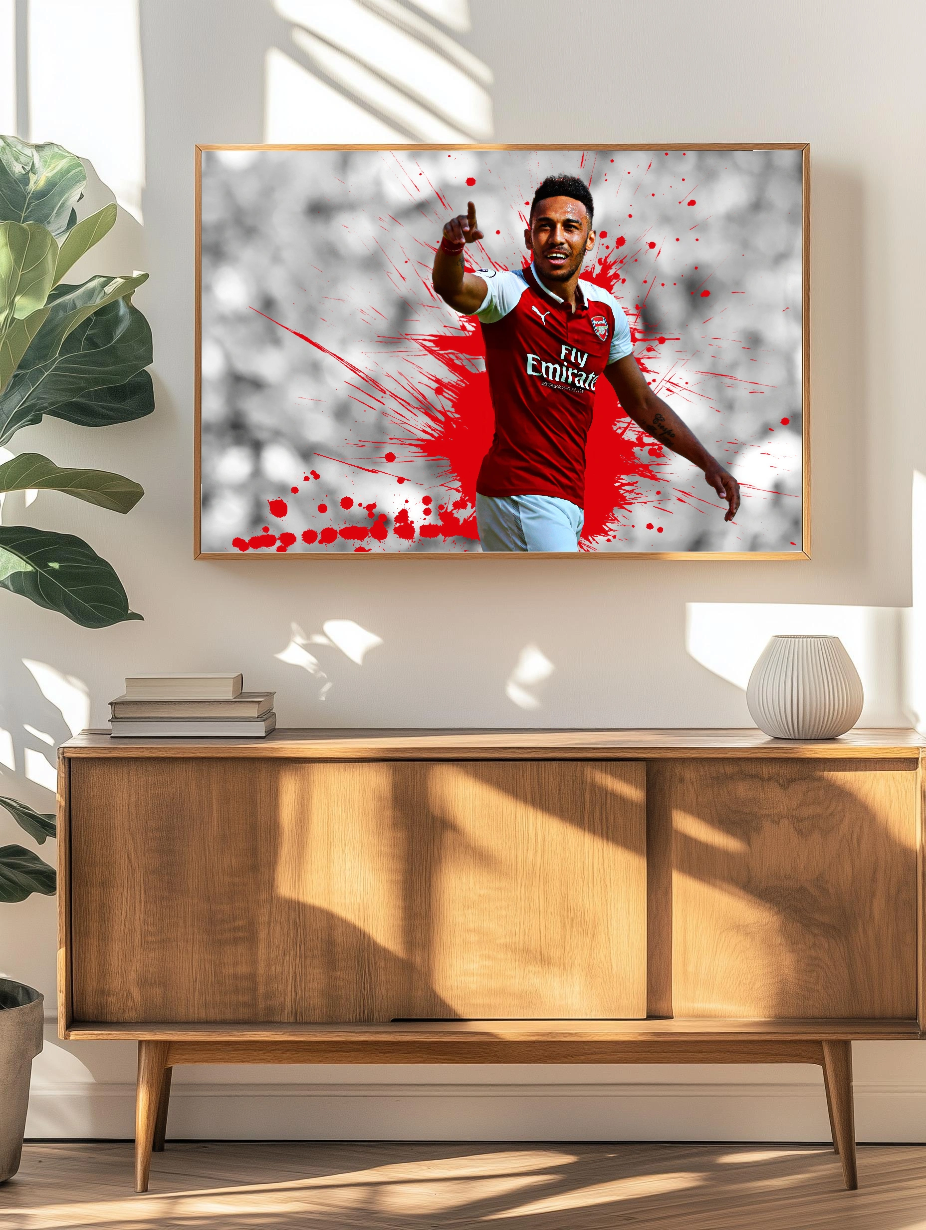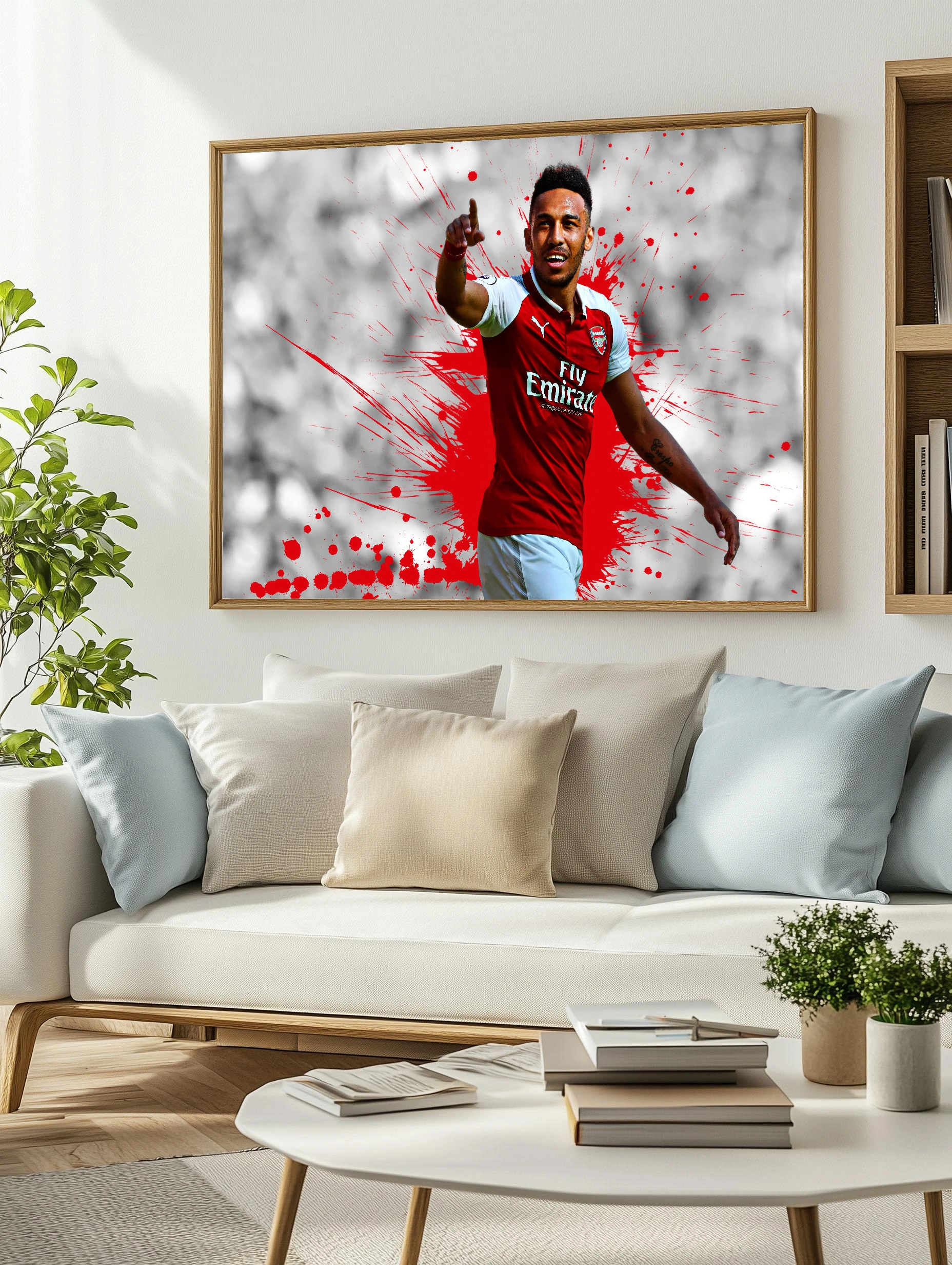 На изображении представлен знаменитый футболист Пьер-Эмерик Обамеянг в красно-белой форме клуба Арсенал. Фон выполнен в размытых оттенках серого, а за спортсменом эффектно разбрызган ярко-красный цвет, создающий динамику и энергию. Это современное интерьерное искусство отлично впишется как картина для гостиной или офиса, добавляя спортивный настрой и яркость.