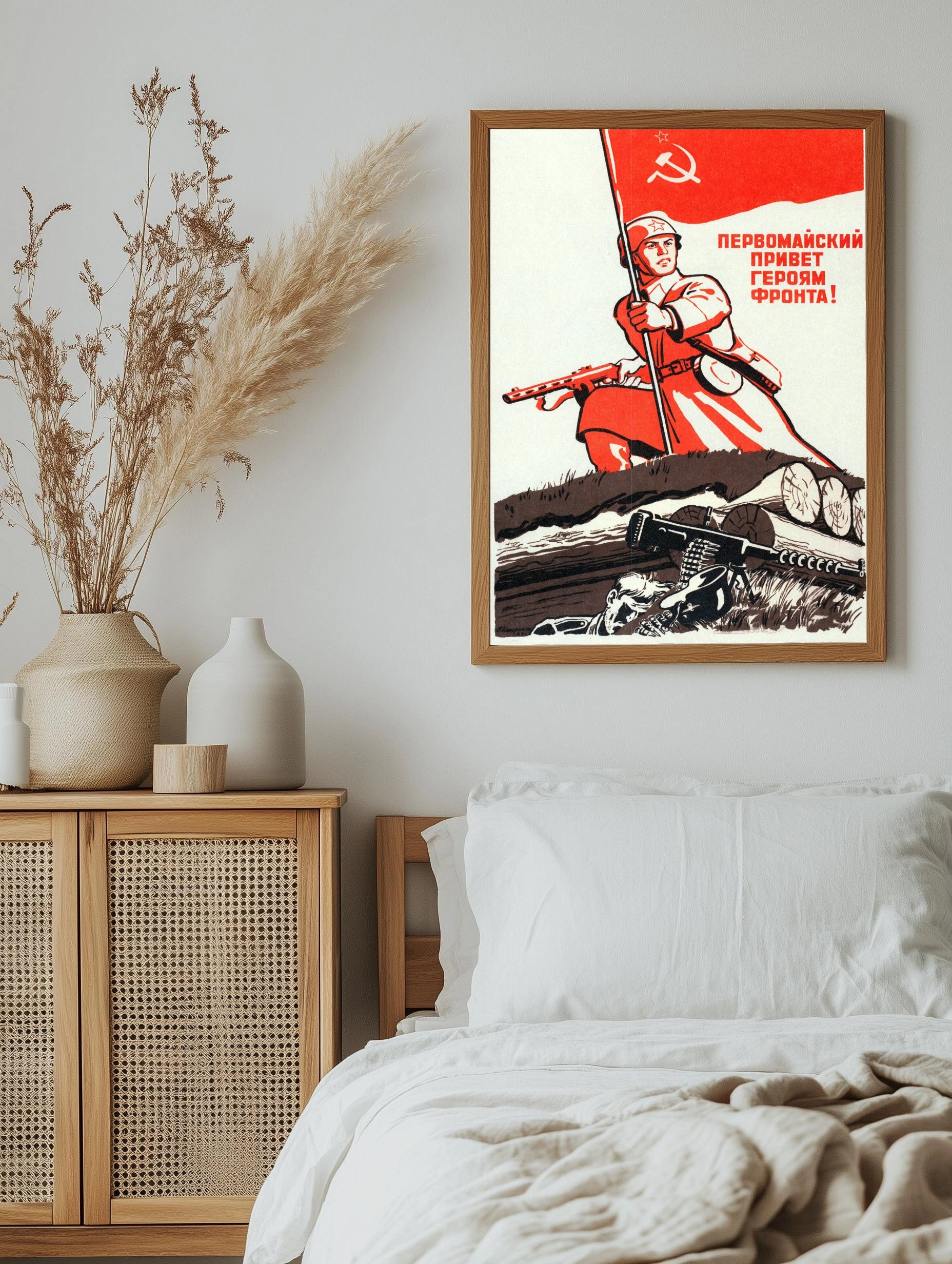 Советский интерьерный постер в стиле соцреализма с изображением солдата Красной армии, держащего флаг с серпом и молотом. Картина на холсте подчеркивает мужество и героизм, выполнена в классических красных, коричневых и белых тонах. Уникальный художественный плакат для гостиной или офиса с исторической тематикой.