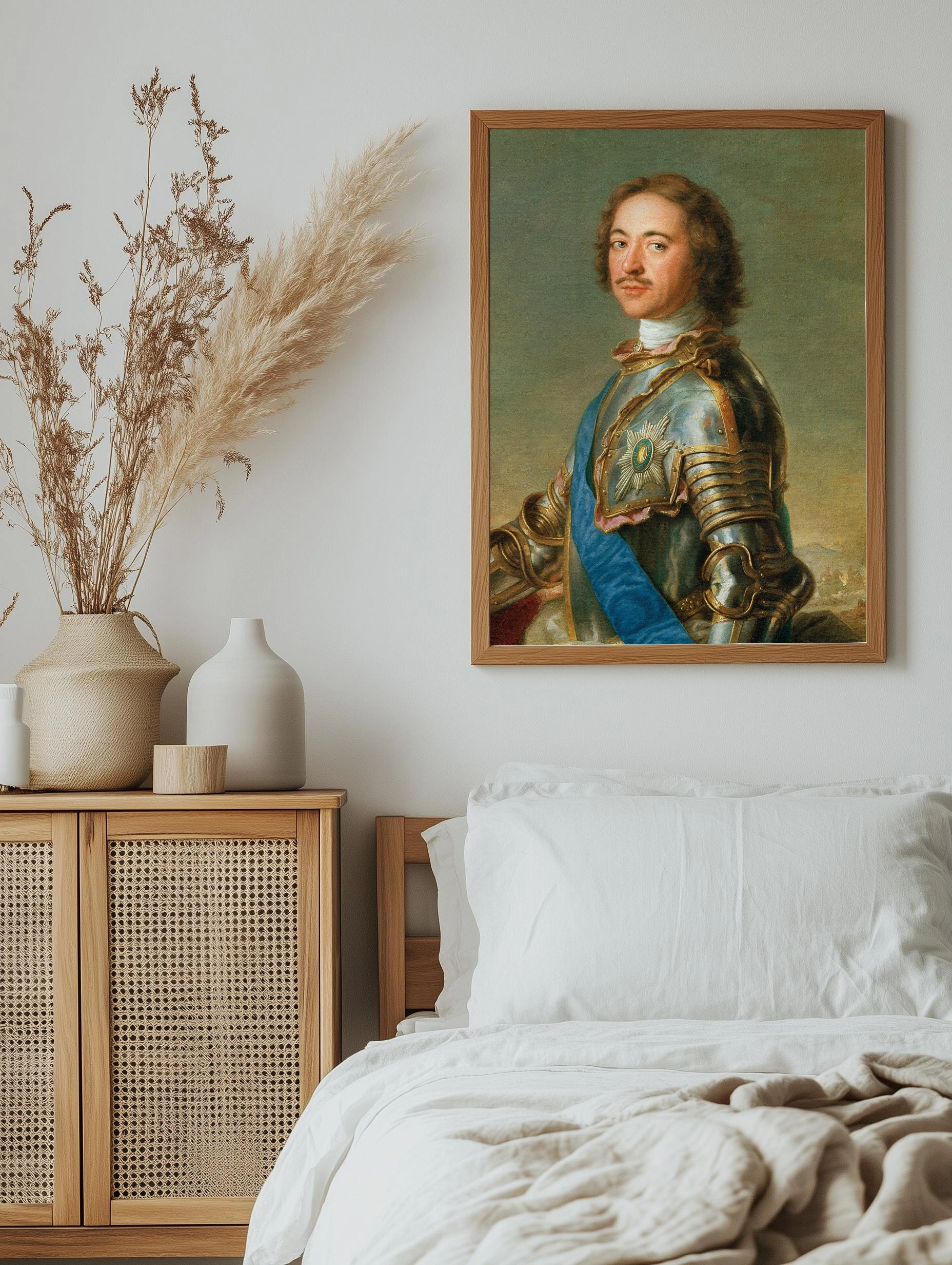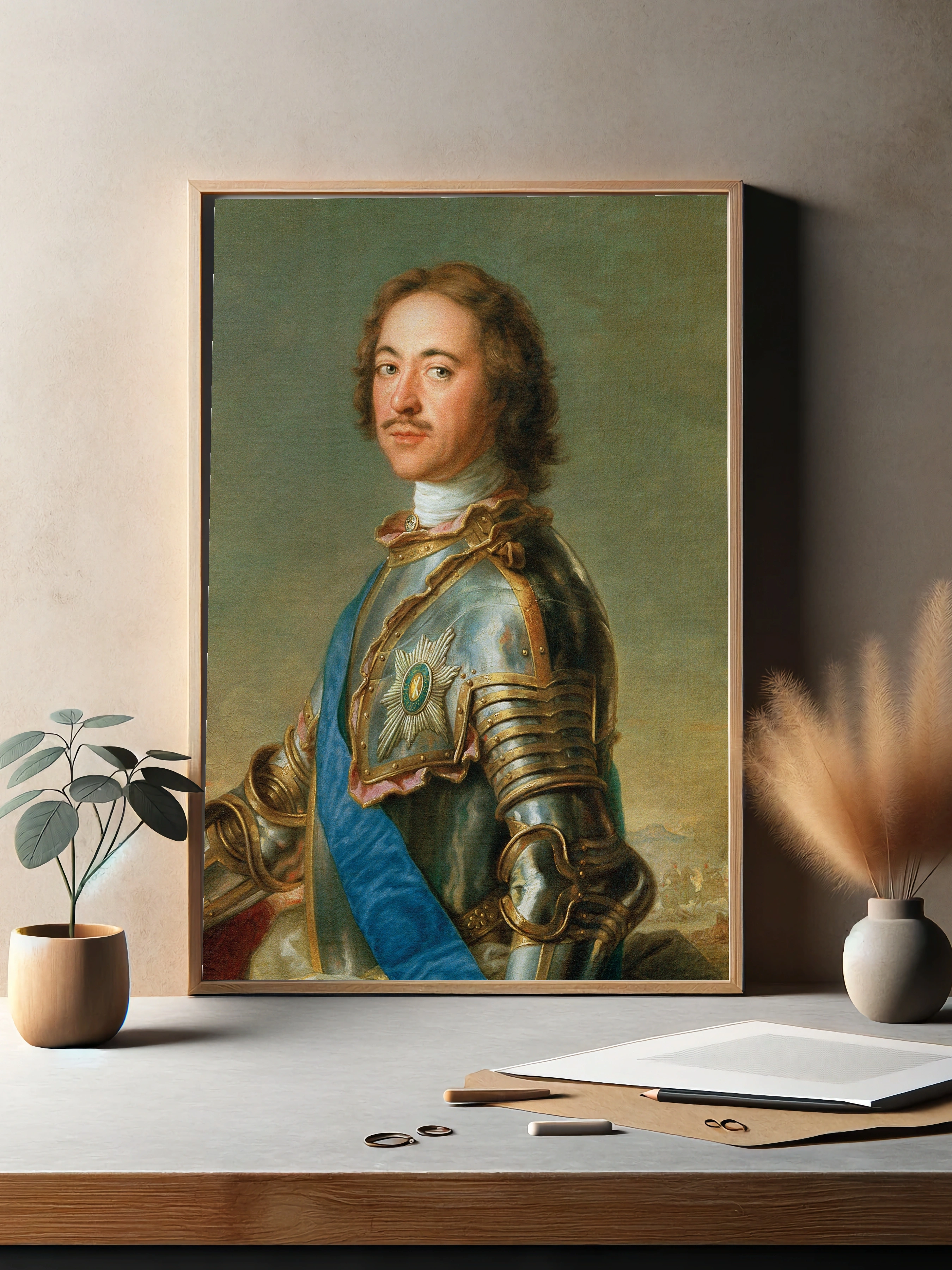 Данный интерьерный постер представляет собой высокохудожественный портрет Петра I — императора России. Одетый в сверкающие доспехи с синим шелковым орденом, он изображён в классическом реалистическом стиле. Картина отлично подойдёт для декоративного оформления гостиной или кабинета, отражая историческую глубину и утончённый стиль. Это современное искусство для стен с уникальным принтом, подчёркивающим царственную харизму и мощь великого государственного деятеля.
