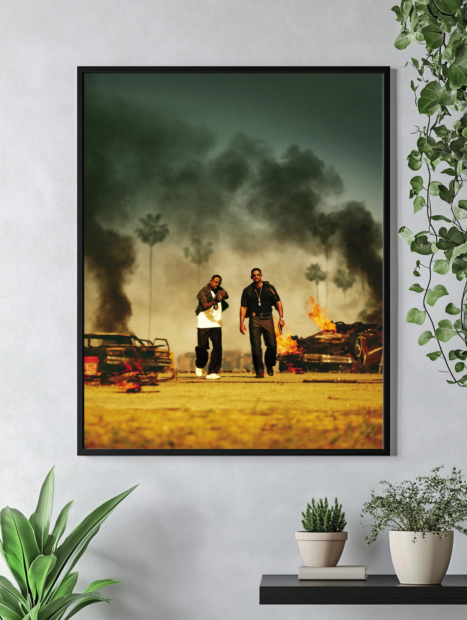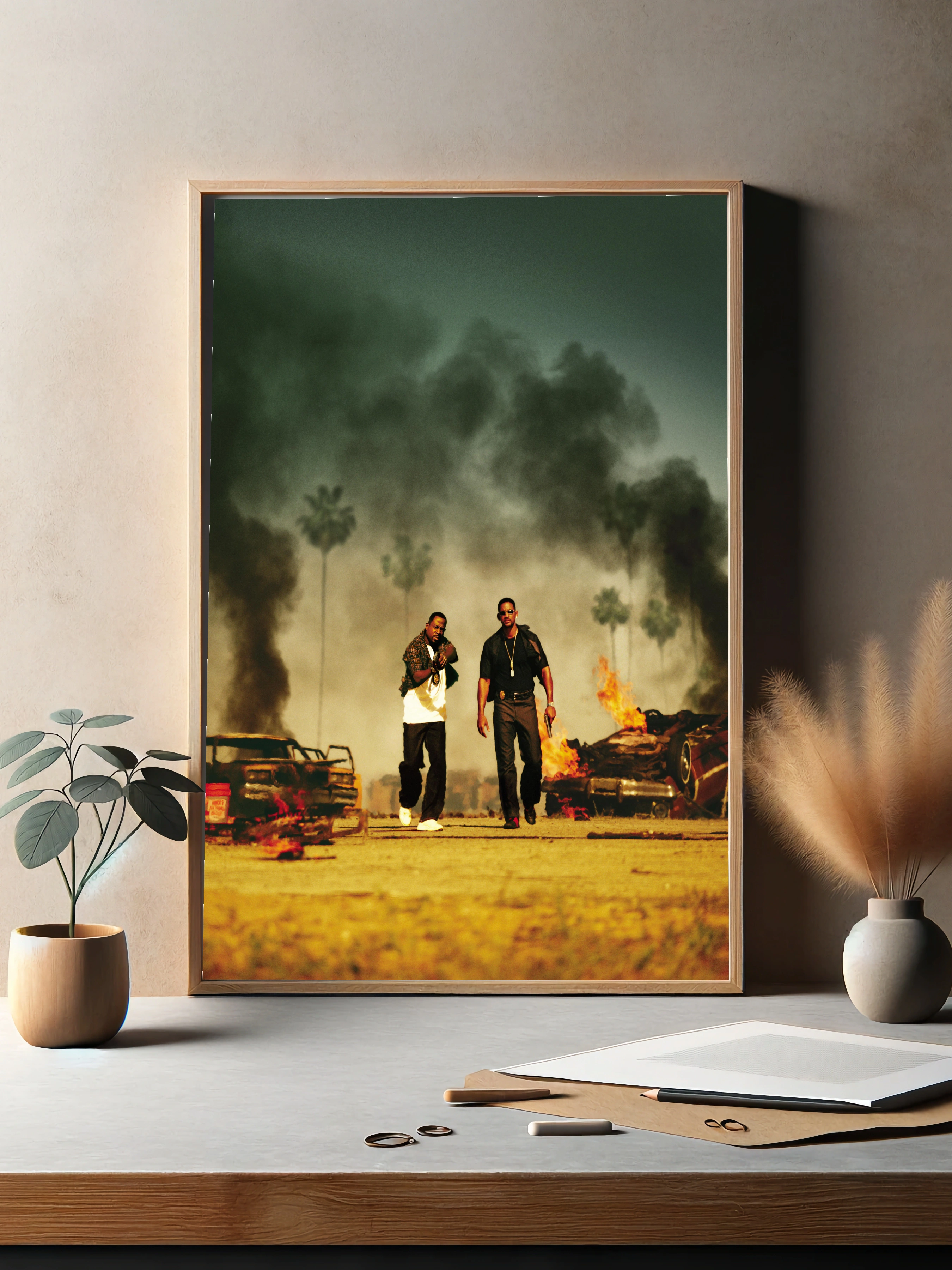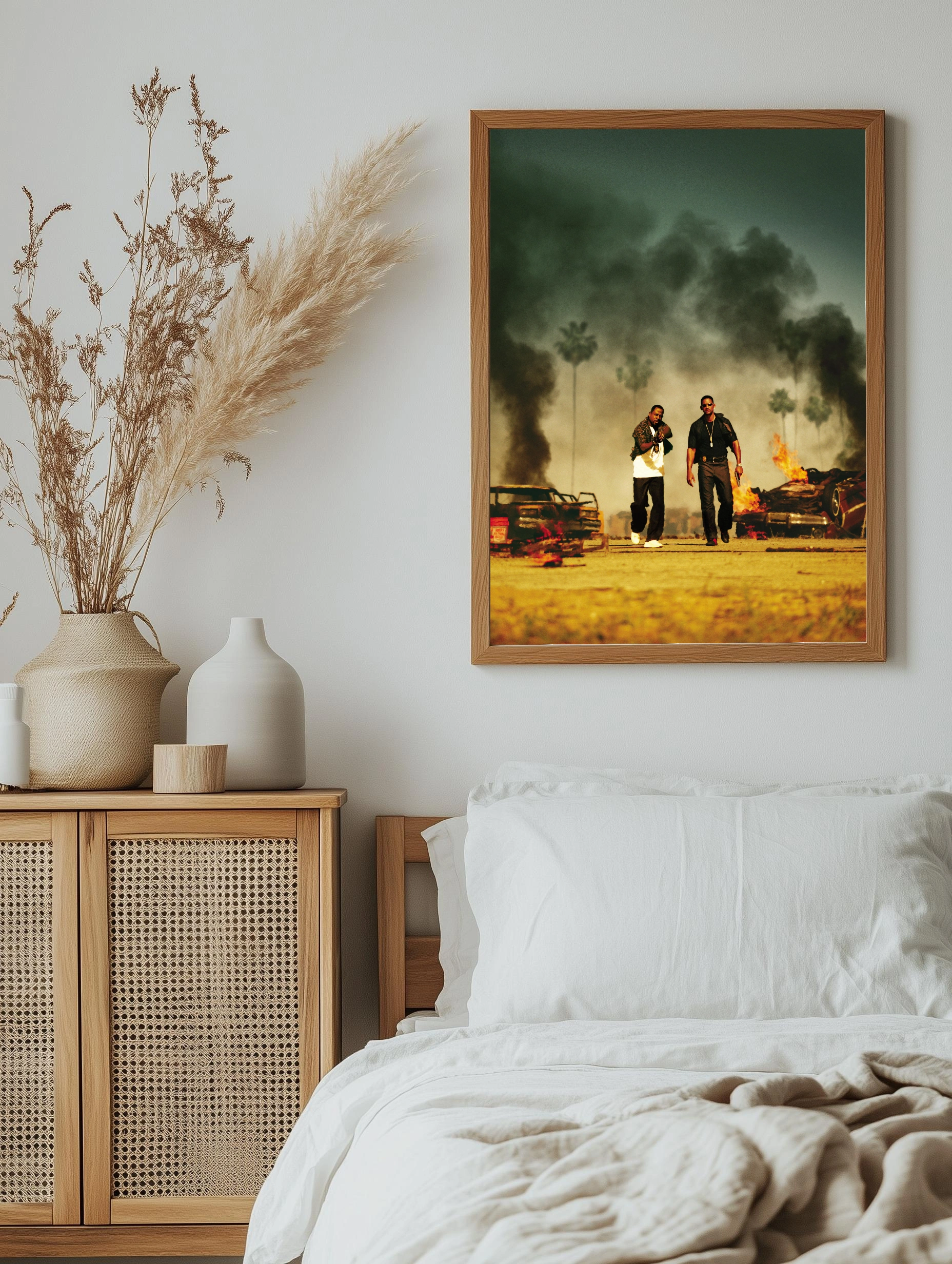 На изображении два мужчины, идущие впереди на фоне горящих автомобилей и клубов чёрного дыма. Атмосфера напряженная и драматичная, напоминающая сцену из криминального фильма или современного сериала. Цветовая гамма состоит из тёмных зеленых и желтых оттенков с яркими оранжево-красными пятнами огня. Идеально подходит для интерьера в стиле современного искусства, добавит динамики и уличного духа для гостиной или офиса.
