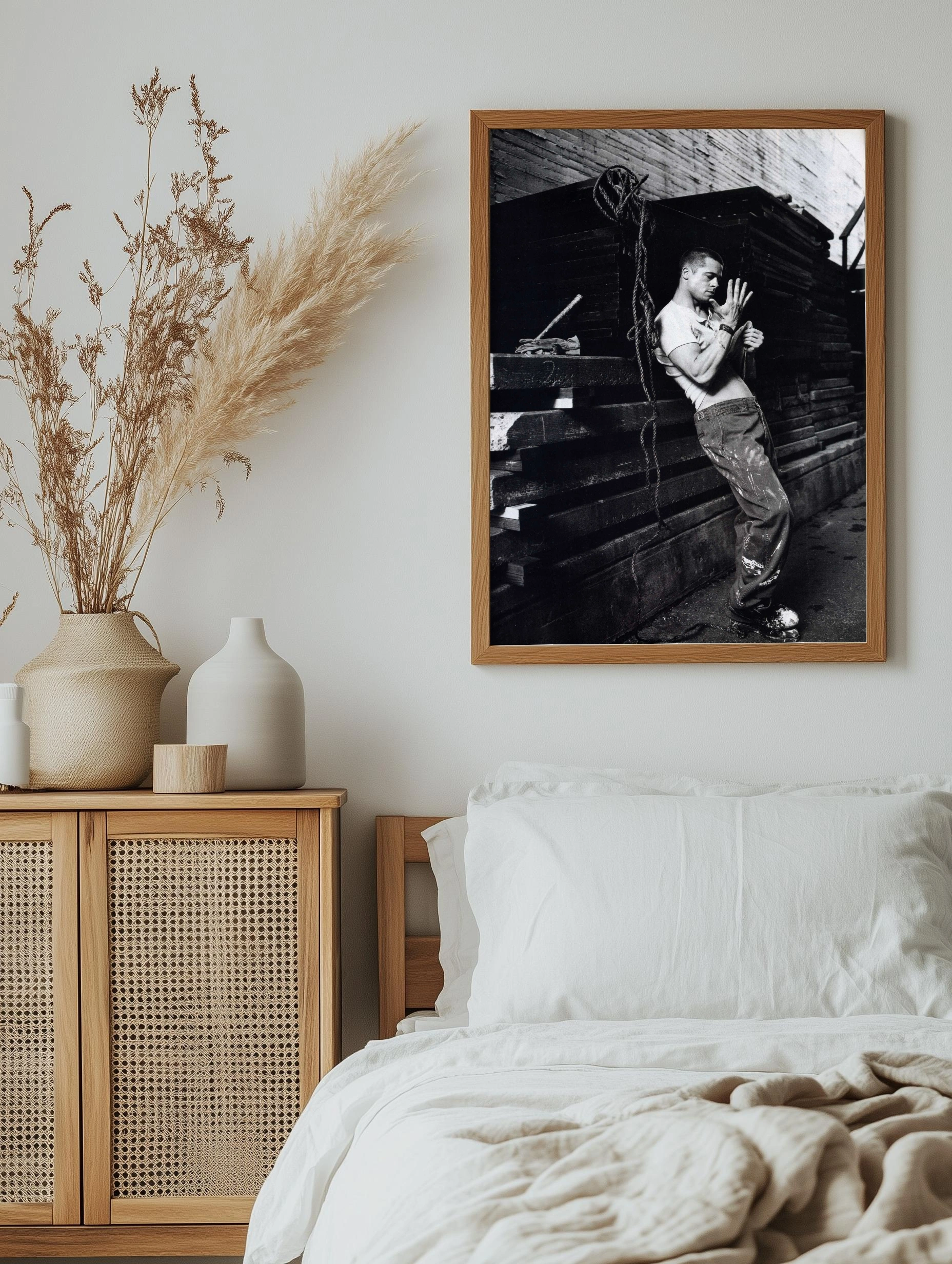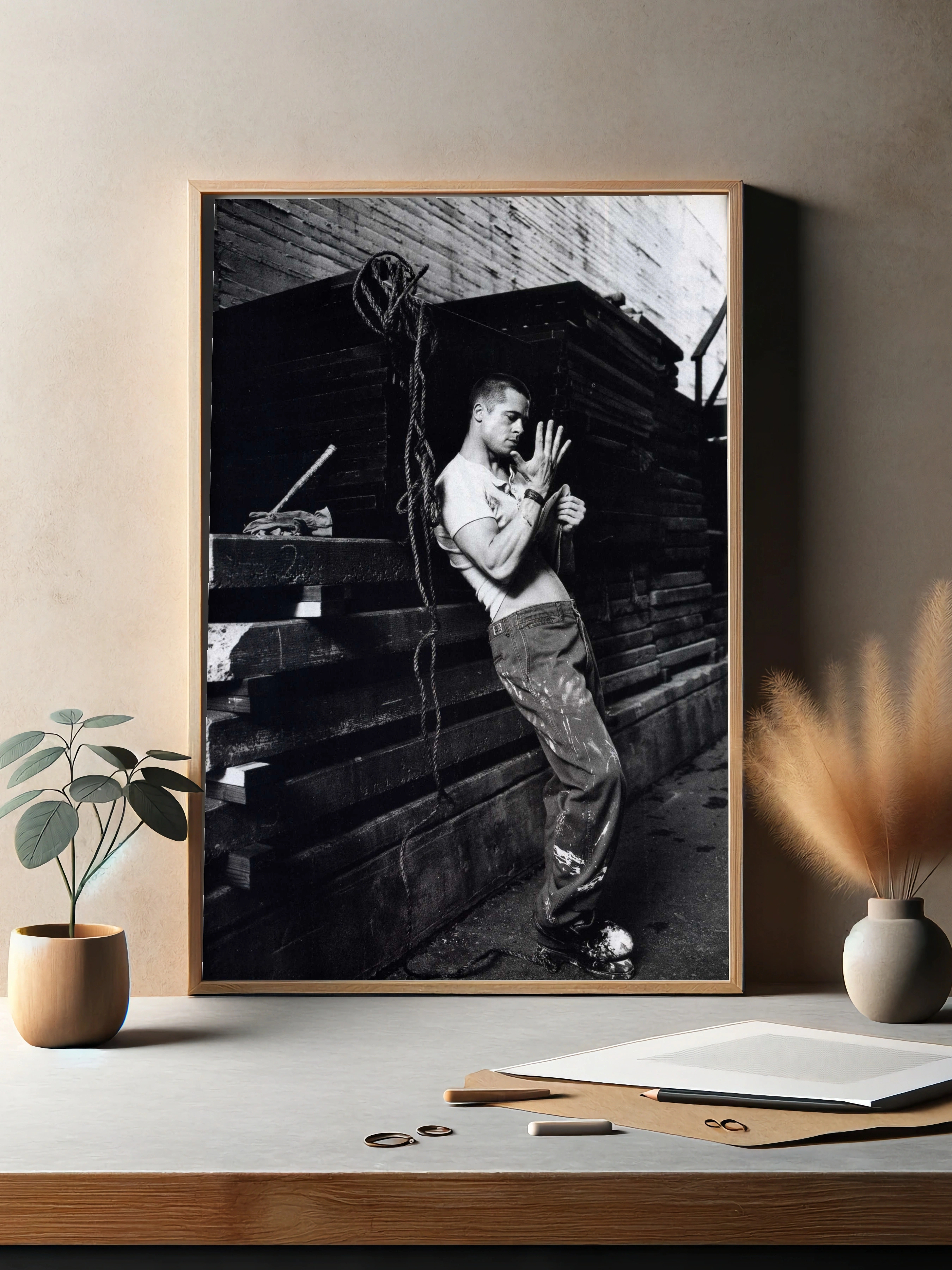 Декоративный плакат в чёрно-белой гамме с изображением мужчины, прислонившегося к груде строительных материалов. Высококонтрастное фото в стиле урбанистики и кинематографизма, подчёркивающее напряжённость и эмоциональность момента. Идеально подходит для современного интерьера и тематического офиса.