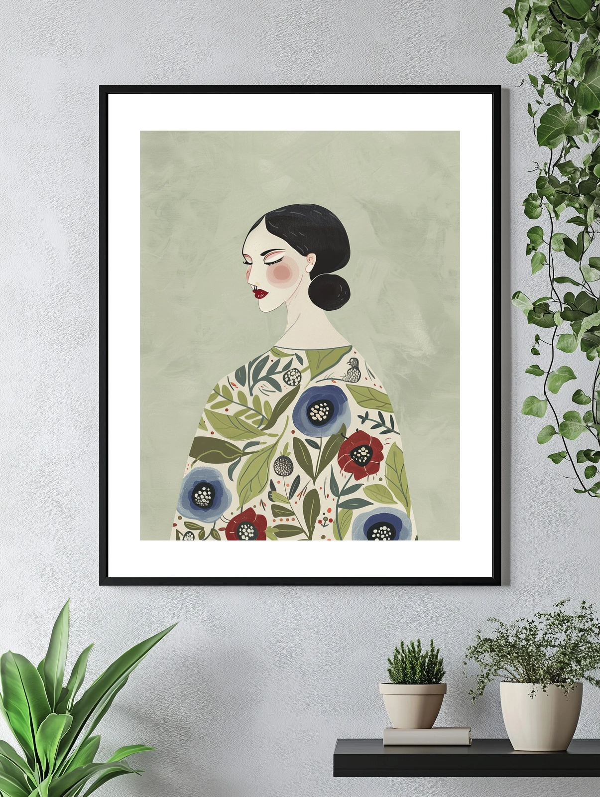 На изображении представлена девушка с черными гладкими волосами, собранными в аккуратный пучок. Её одежда украшена крупными яркими цветами в зелёных, синих и красных тонах. Фон изображения выполнен в пастельных зеленых оттенках, что создает мягкий и спокойный фон для яркого наряда девушки. Лицо героини слегка повернуто в профиль, добавляя изящество и загадочность её образу. Картина выполнена в стилистике минимализма с элементами художественного абстракционизма, что придаёт ей современный и стильный вид. Этот постер идеально впишется в интерьер в стиле модерн или скандинавский стиль, добавив в него нотки изысканности и искусства. Основные цвета изображения — зелёный и многоцветный узор одежды. Картина навевает атмосферу уюта и естественности, что прекрасно дополнит любое жилое пространство.