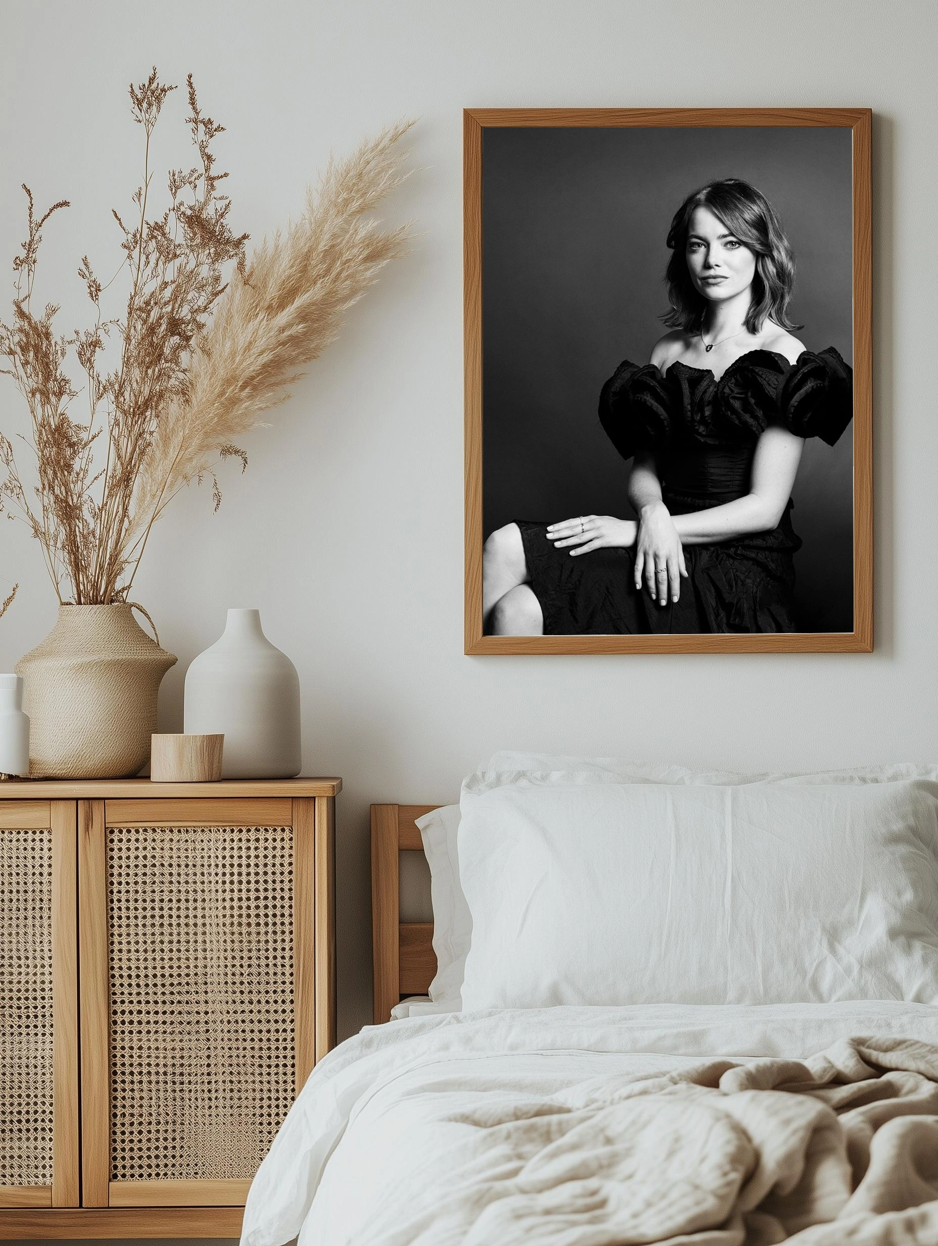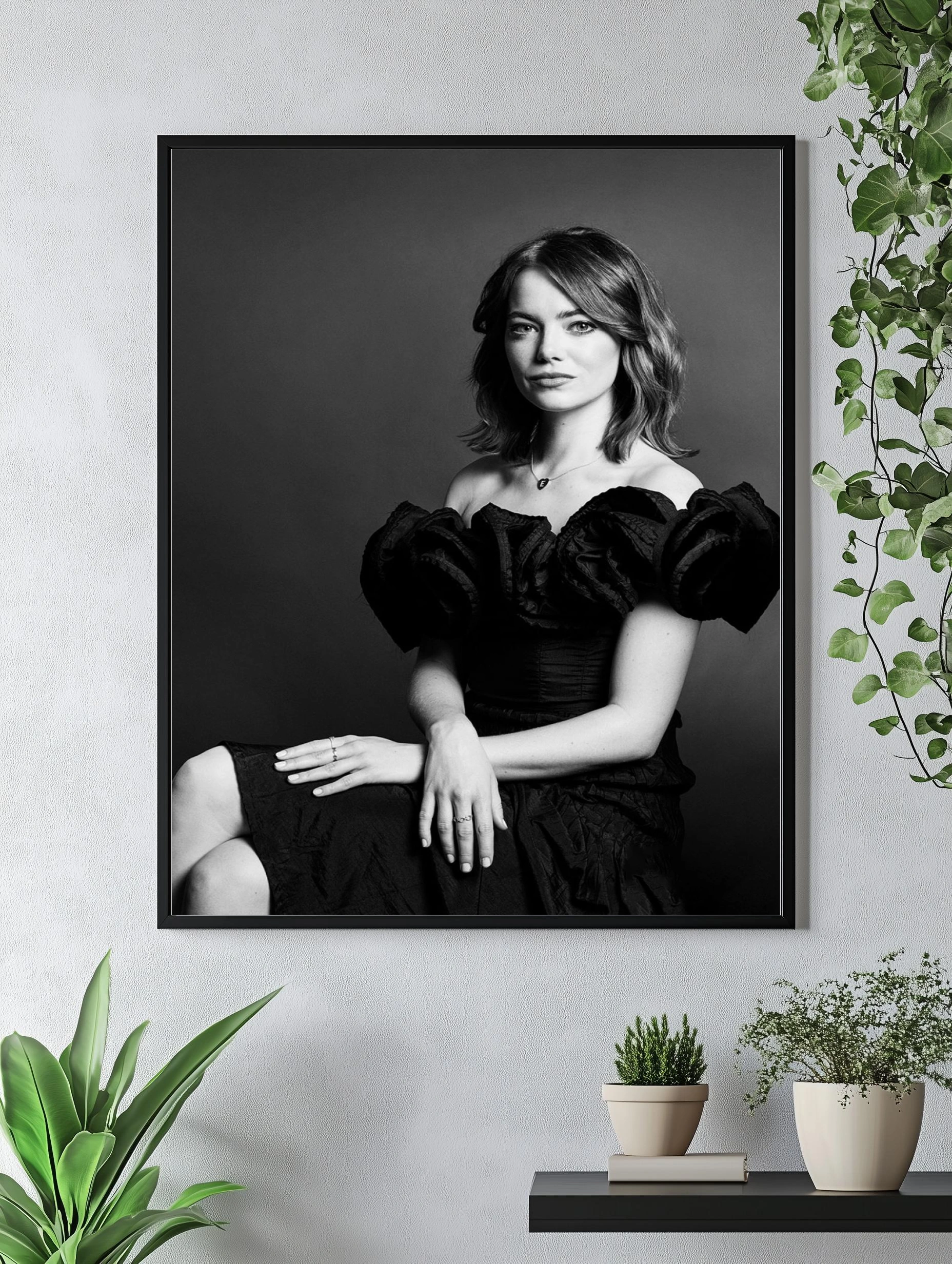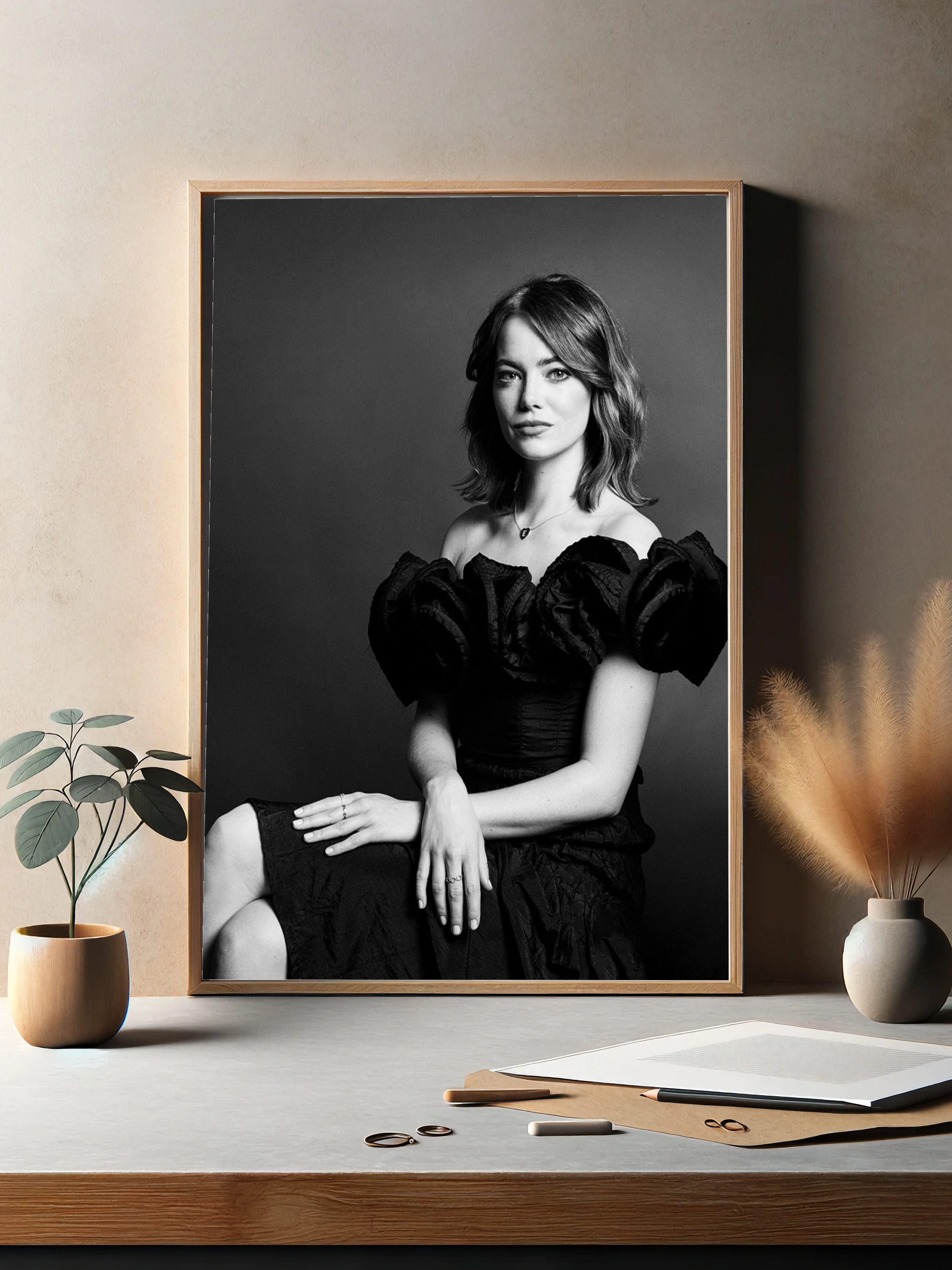 Черно-белое изображение женщины в элегантном платье с объемными рукавами создает атмосферу классической элегантности и утонченности. Это интерьерное искусство для стен, подходящее для спальни, гостиной или офиса, где важен стильный и выразительный настенный декор. Художественный плакат передает чувство сдержанной красоты и изящества.