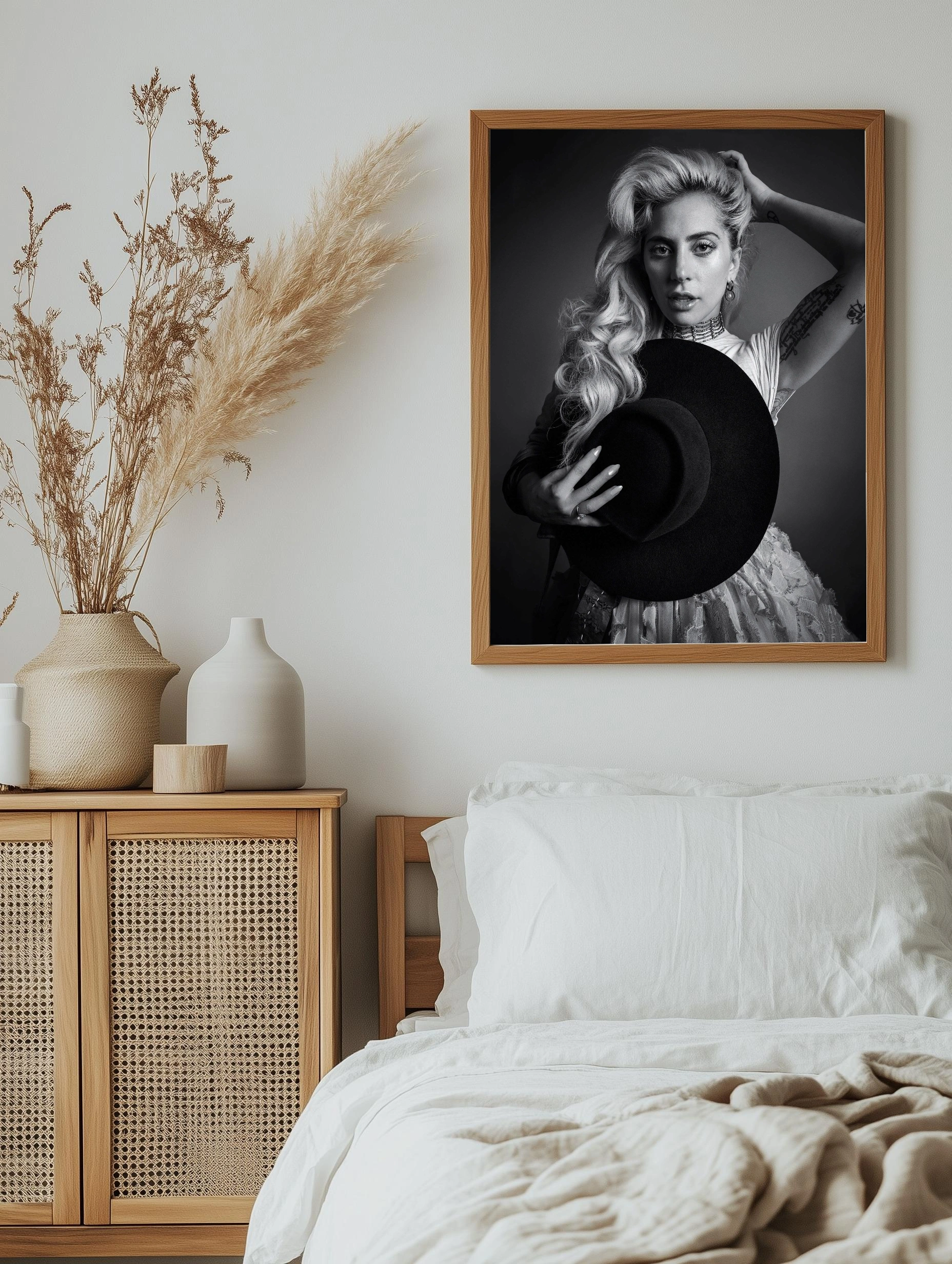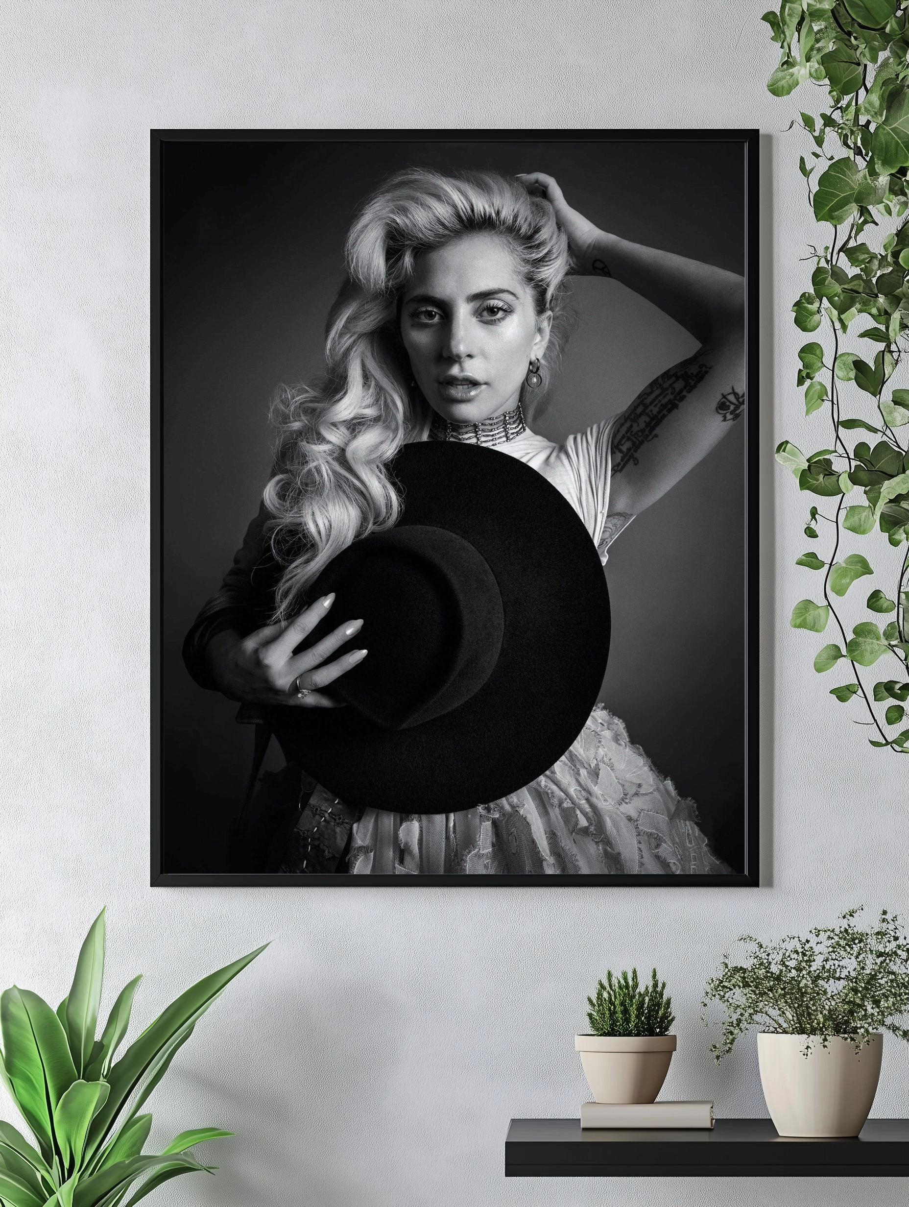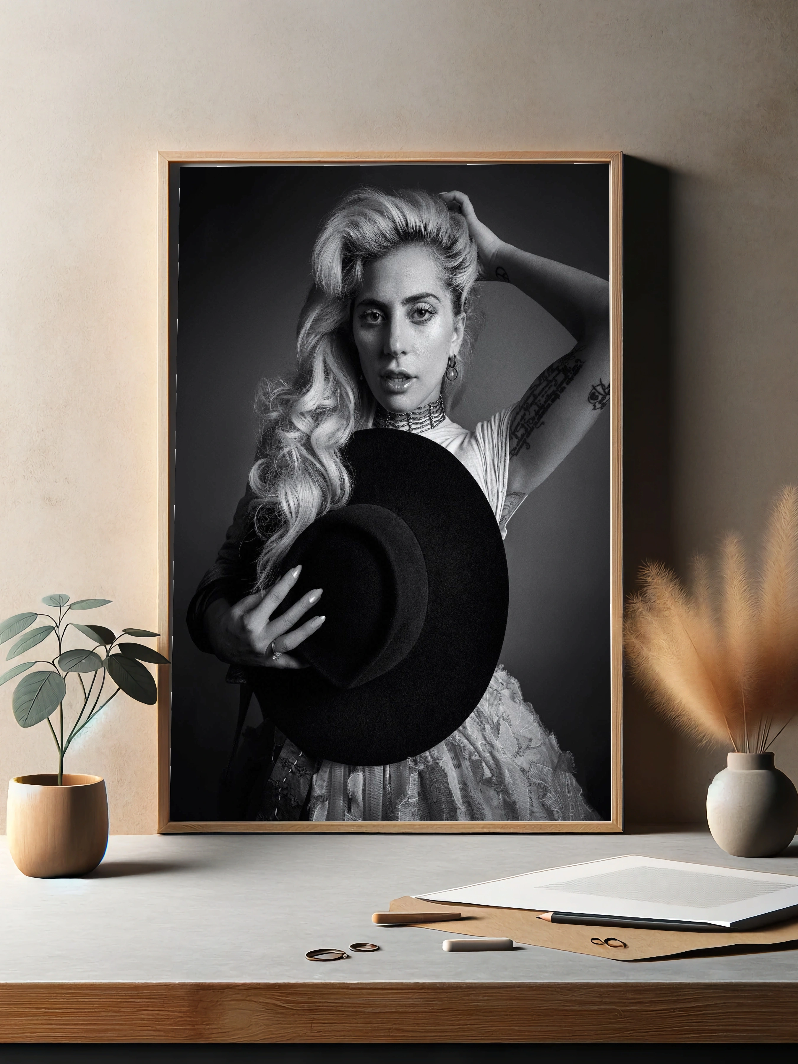Этот художественный плакат представляет собой чёрно-белую фотографию женщины с роскошными светлыми волосами, одетой в стильную одежду с крупной чёрной шляпой. Изображение выполнено в классическом стиле с элегантным освещением и чёткой детализацией, что создаёт атмосферу утончённости и современного искусства для стен. Идеально подходит для интерьерного декора гостиной, спальни или офиса, добавляя изысканный акцент и стильный декор стен.