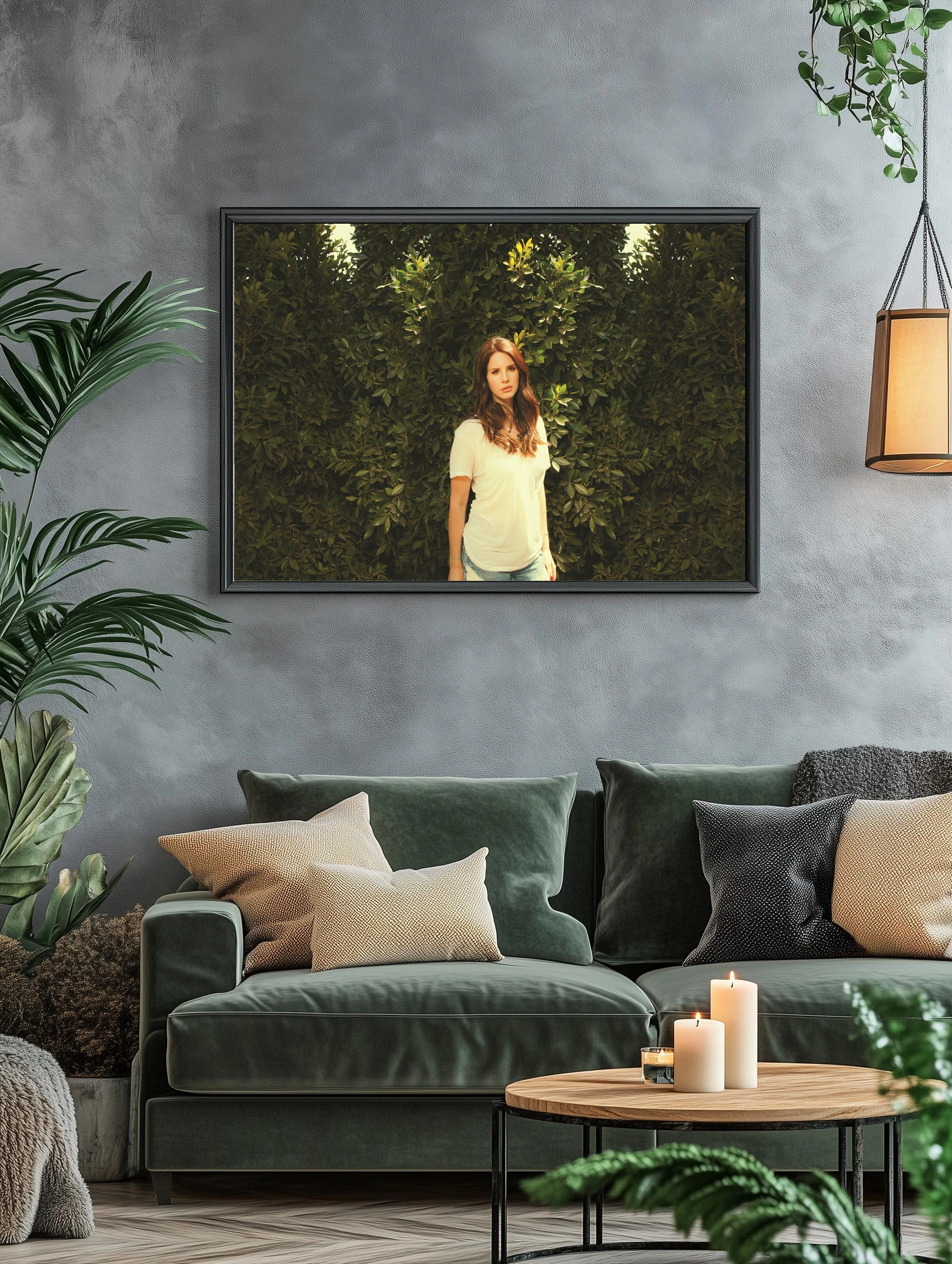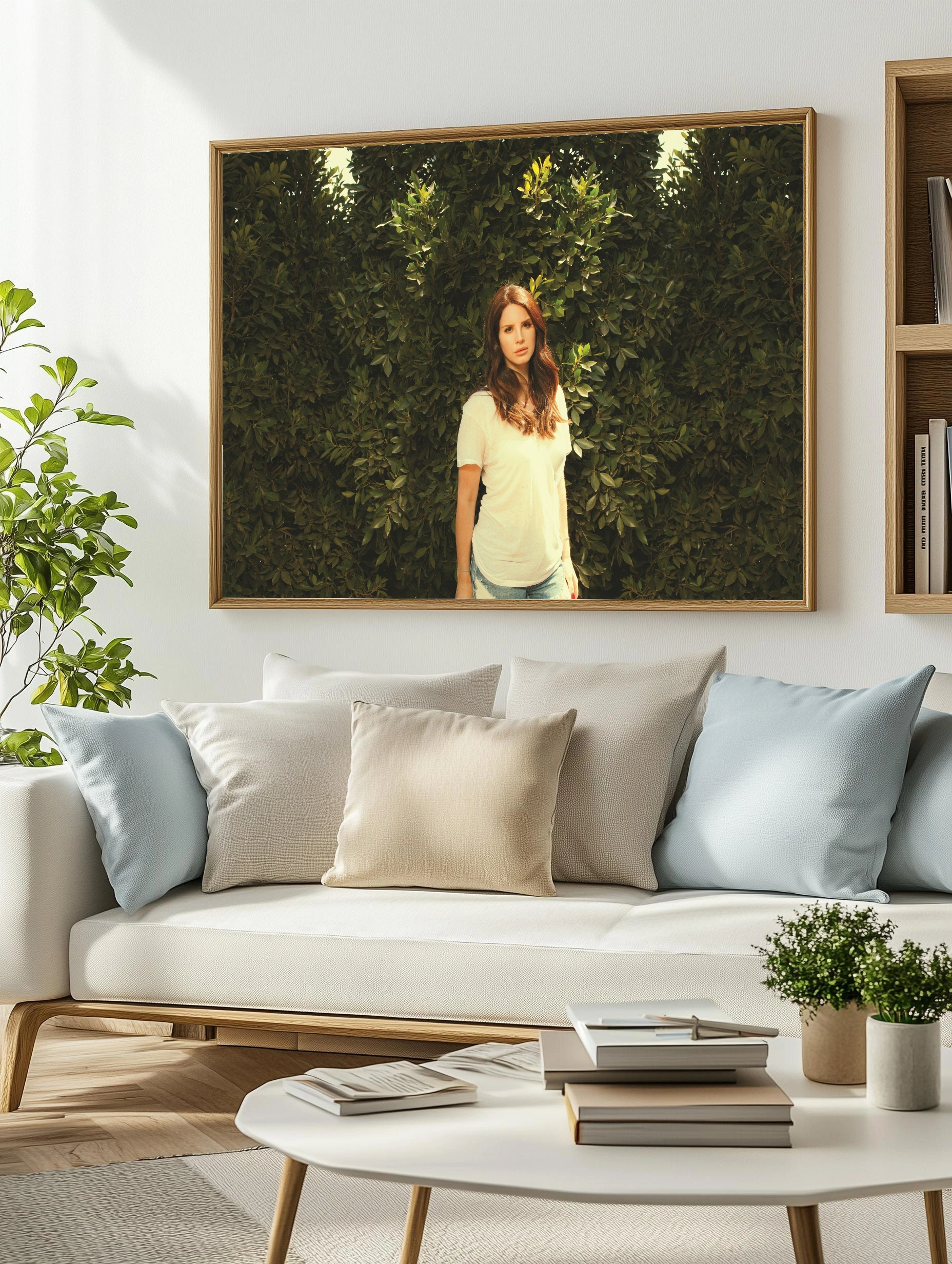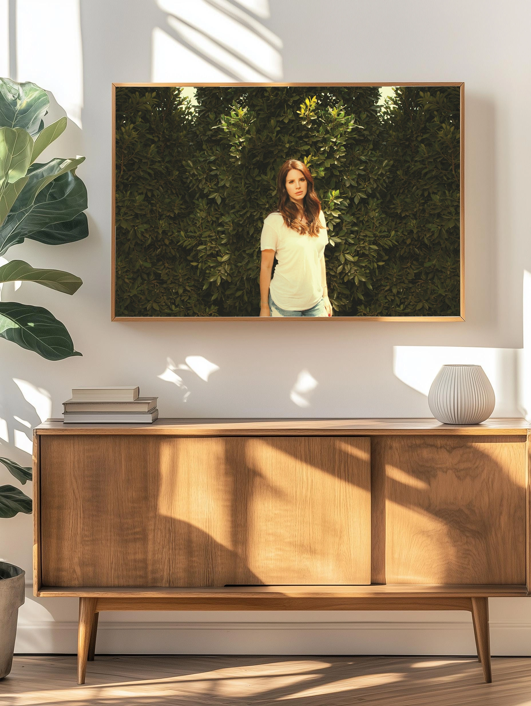 На изображении запечатлена молодая женщина с каштановыми волосами в белой футболке и голубых джинсах, стоящая на фоне густой зелёной листвы. Фотография передаёт атмосферу естественной красоты и спокойствия, идеально подходит для интерьерного декора, дома или офиса. Стиль подчёркивает природную гармонию и светлое настроение. Уникальный художественный плакат для современного искусства стен.