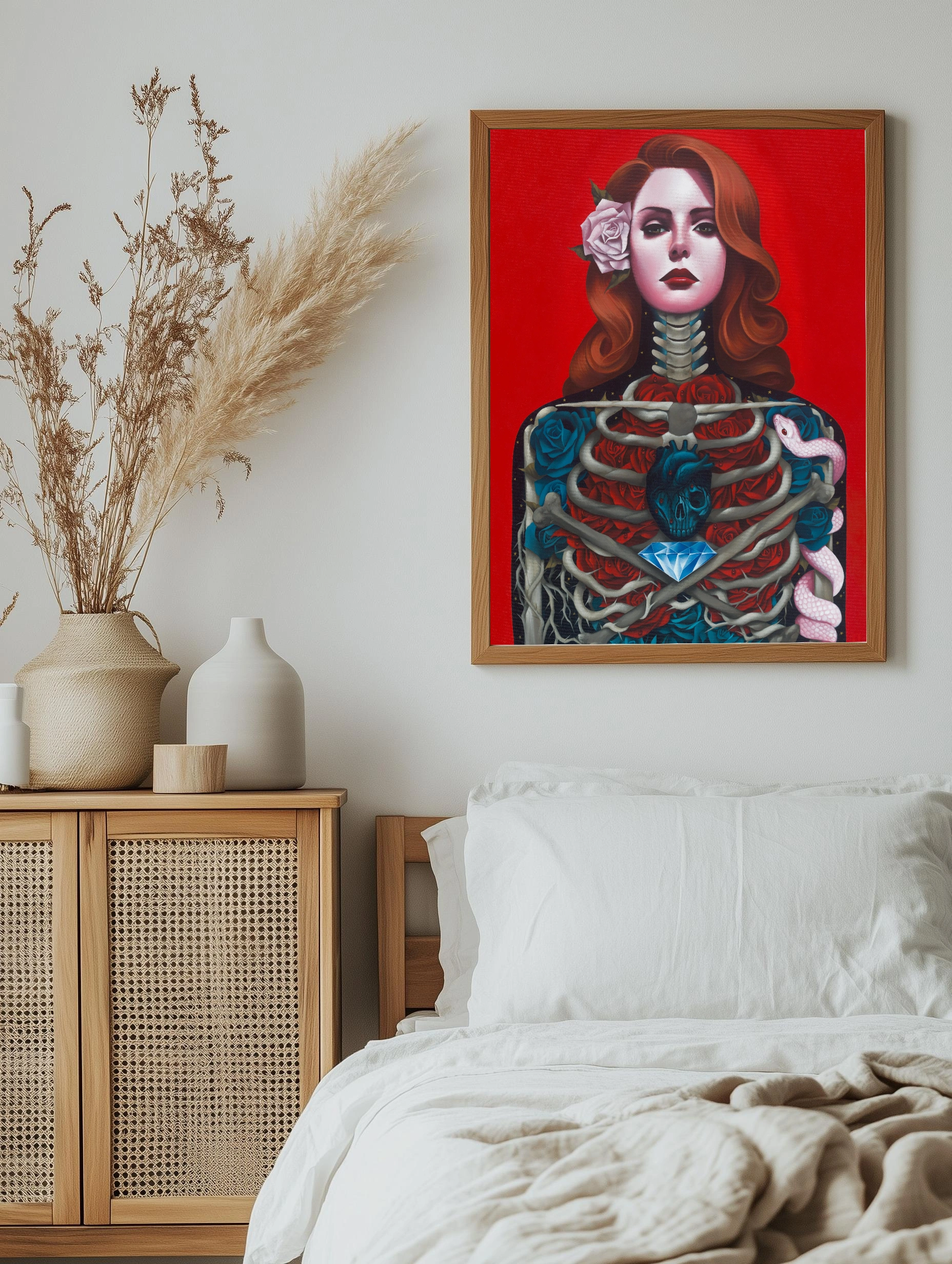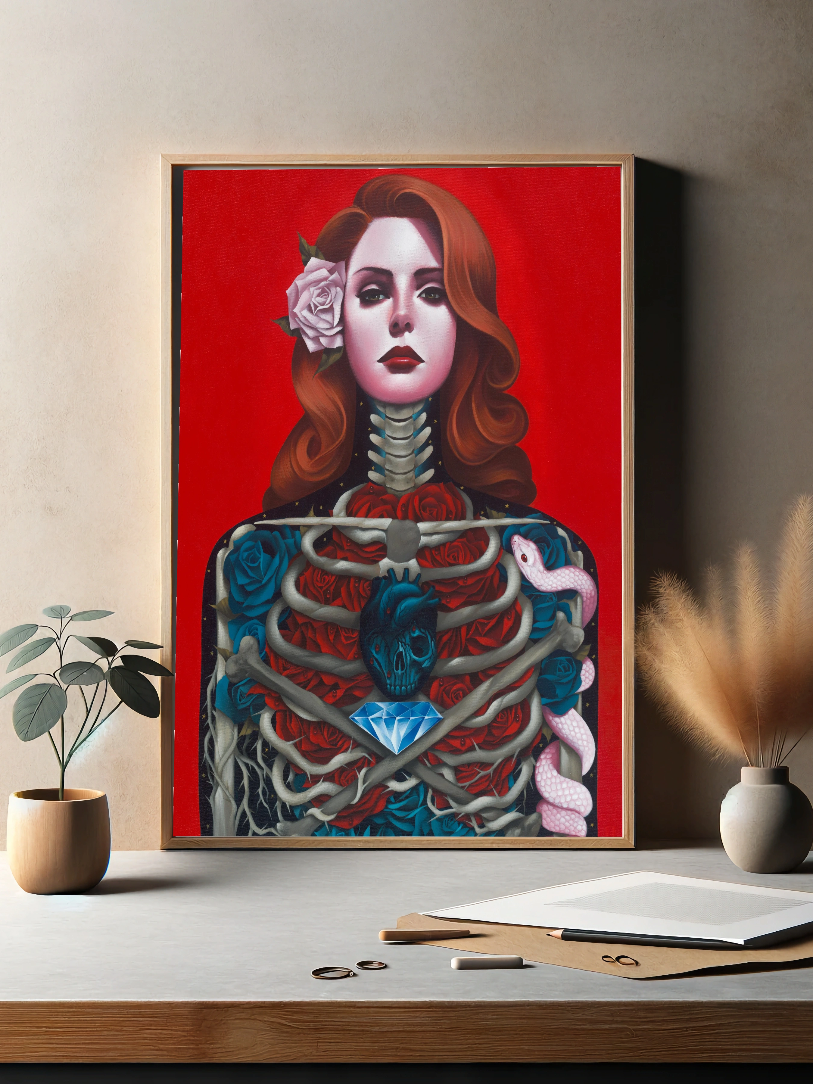 Изображение представляет собой художественный портрет женщины с рыжими волосами на ярко-красном фоне. Внутри её прозрачного торса виднеются кости скелета, синие и красные цветы, тёмное сердце в виде черепа и крупный синий алмаз. Справа ползёт розовая змея, добавляя мистичности. Этот интерьерный постер сочетает современное искусство для стен и стильный декор, идеально подходящий для гостиной или офиса.