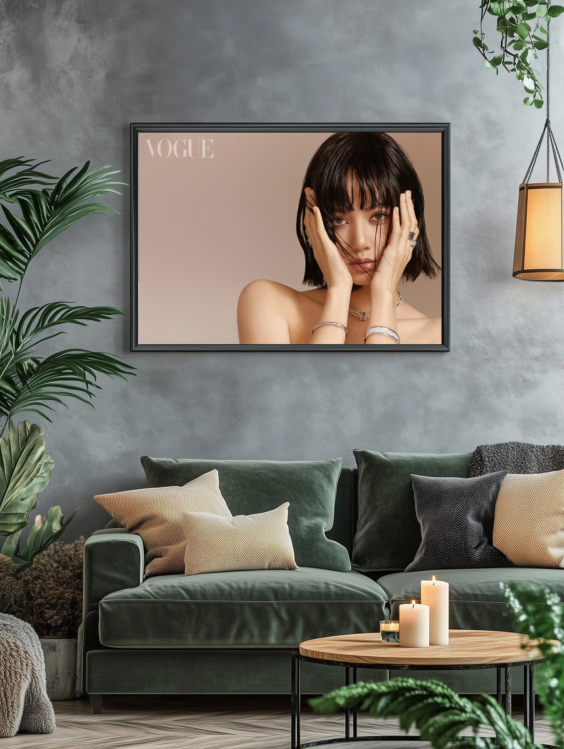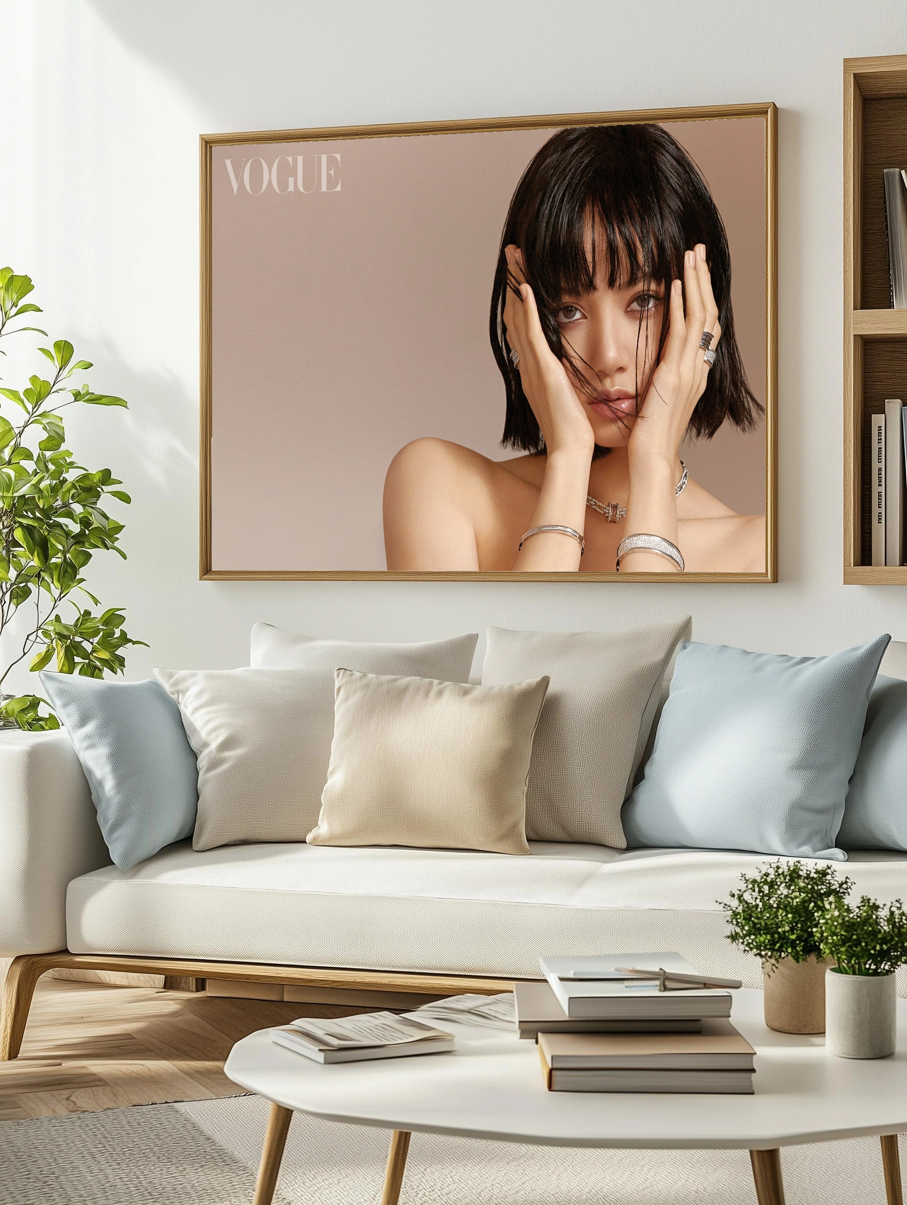 Это интерьерное искусство представляет элегантный портрет женщины с короткими темными волосами и нежным макияжем, выполненный в теплых бежевых тонах. Акцент на украшениях из серебра и бриллиантов подчёркивает изящество и современный стиль, подходящий для гостиной или офиса. Уникальная картина для стильного декора стен.