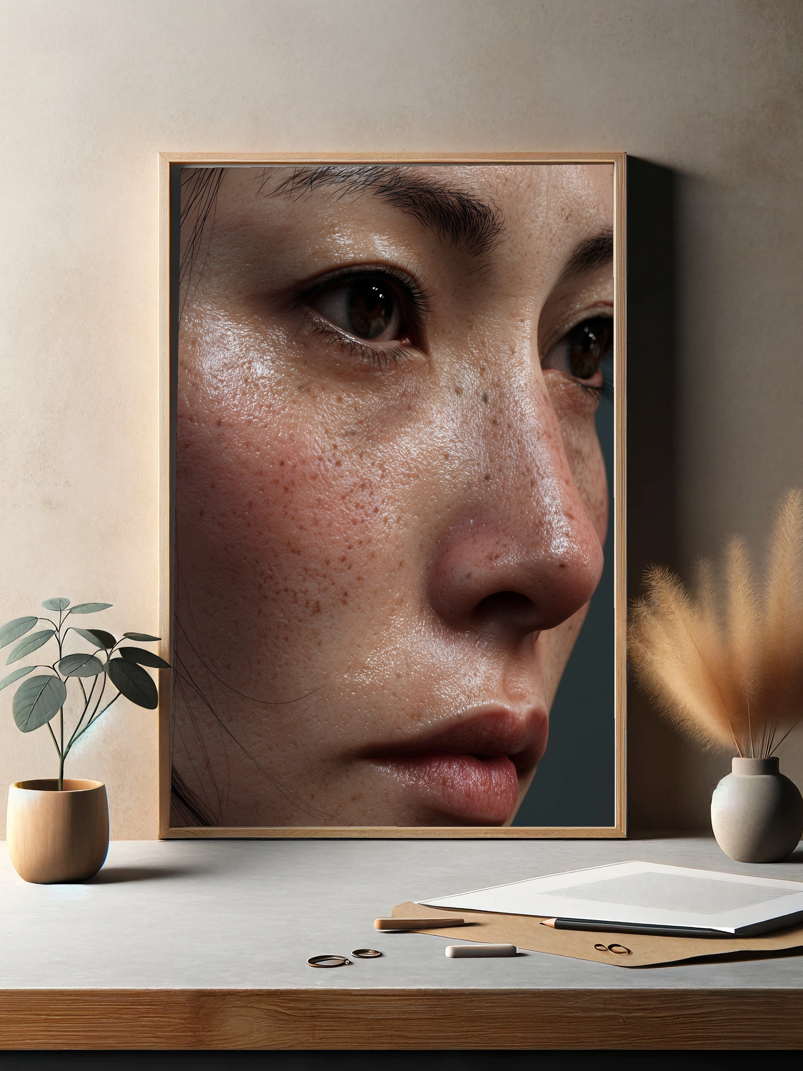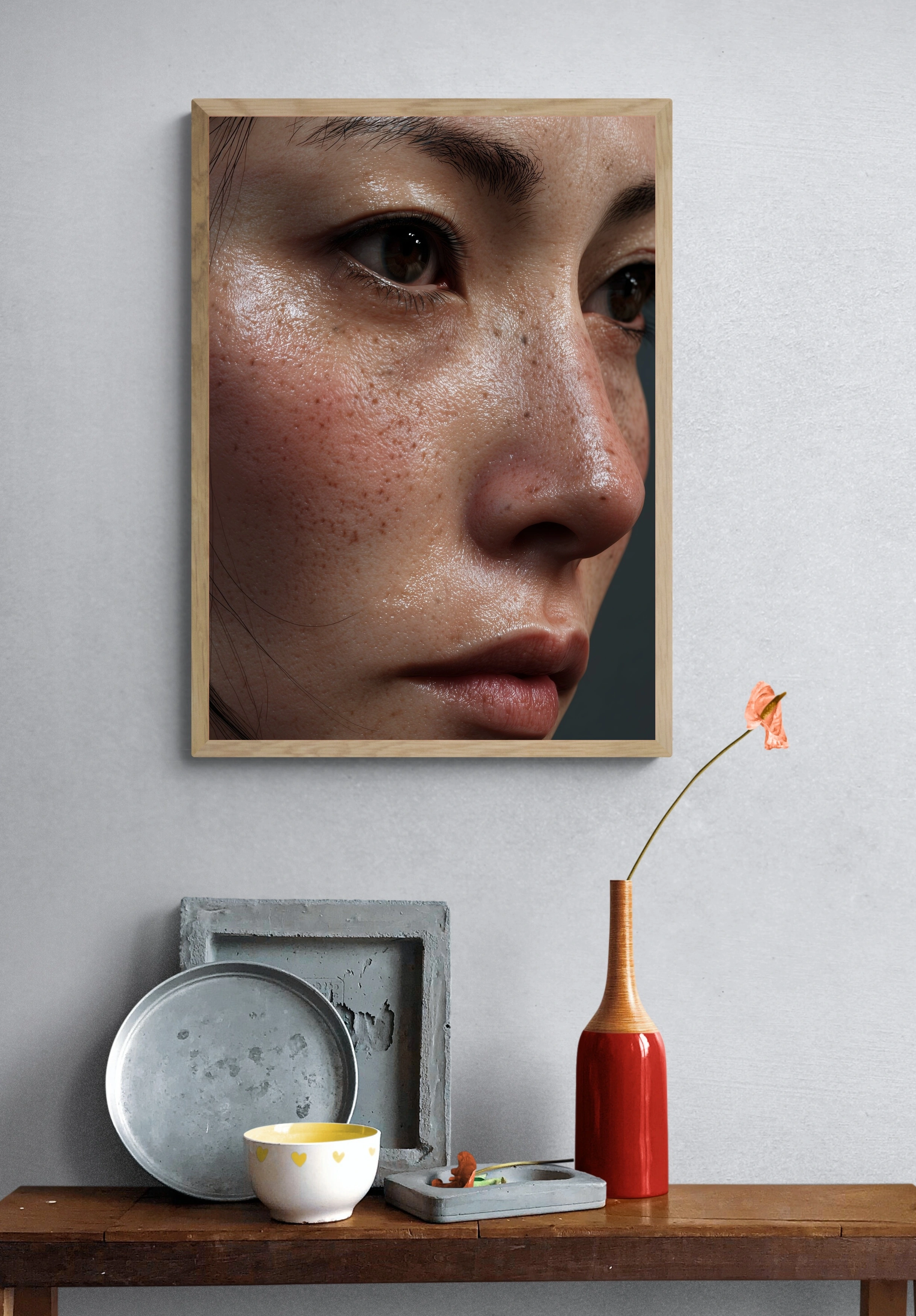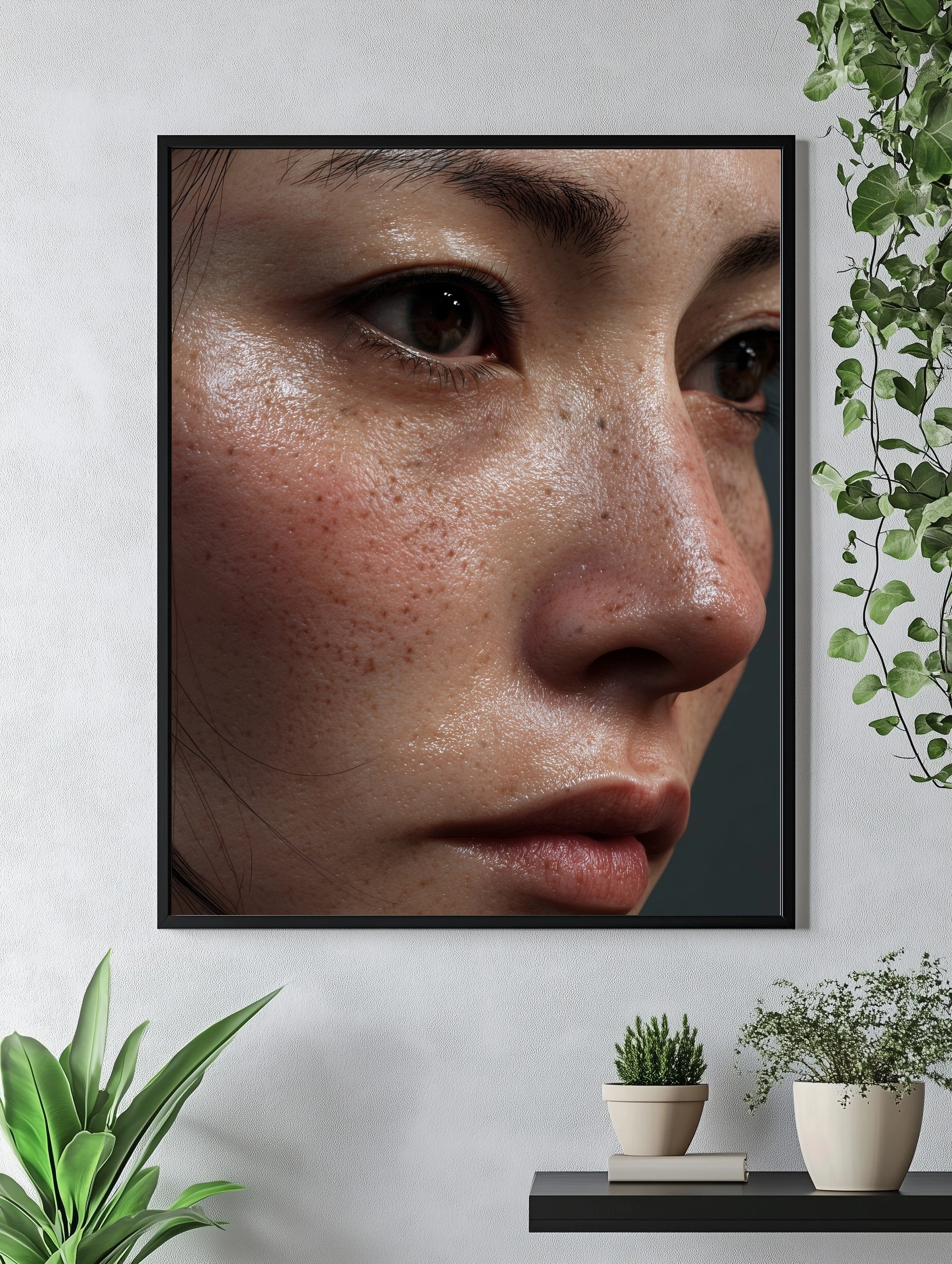 Этот постер представляет собой детализированный портрет женщины, акцентирующий внимание на естественной текстуре кожи. Внимание привлекает выразительный взгляд с глубокими карими глазами, которые отражают свет, создавая эффект живости. Легкий блеск на коже подчеркивает её здоровье и естественность, а веснушки добавляют индивидуальности и шарма. Композиция выполнена в реалистичном стиле, что создает атмосферу близости и искренности. Цветовая гамма включает теплые бежевые и коричневые оттенки, что делает изображение особенно уютным. Этот постер идеально подойдет для оформления спальни или гостиной, добавляя в интерьер нотки естественности и уюта. Целевая аудитория — молодые люди и семьи, ценящие натуральность и индивидуальность в искусстве.