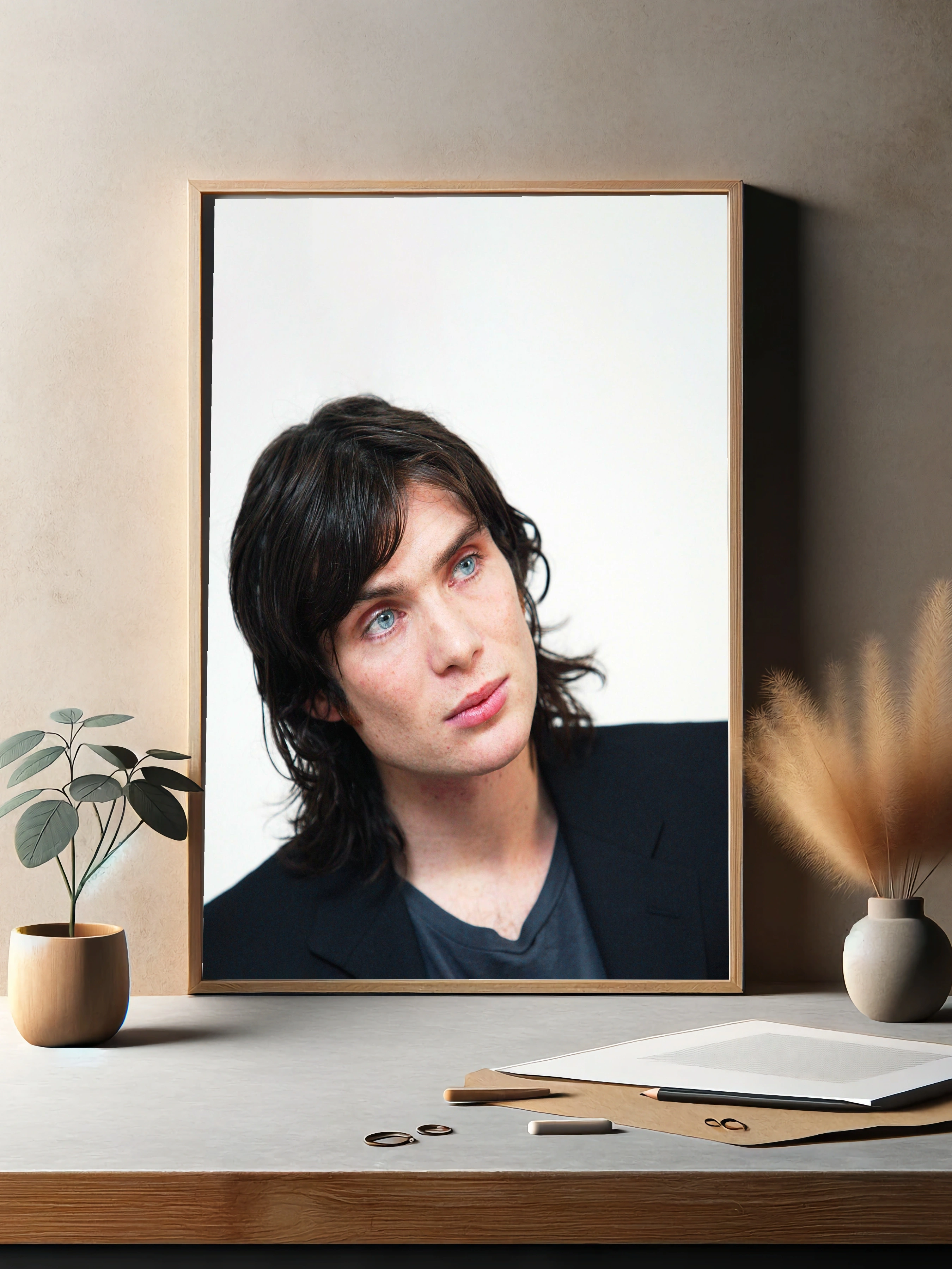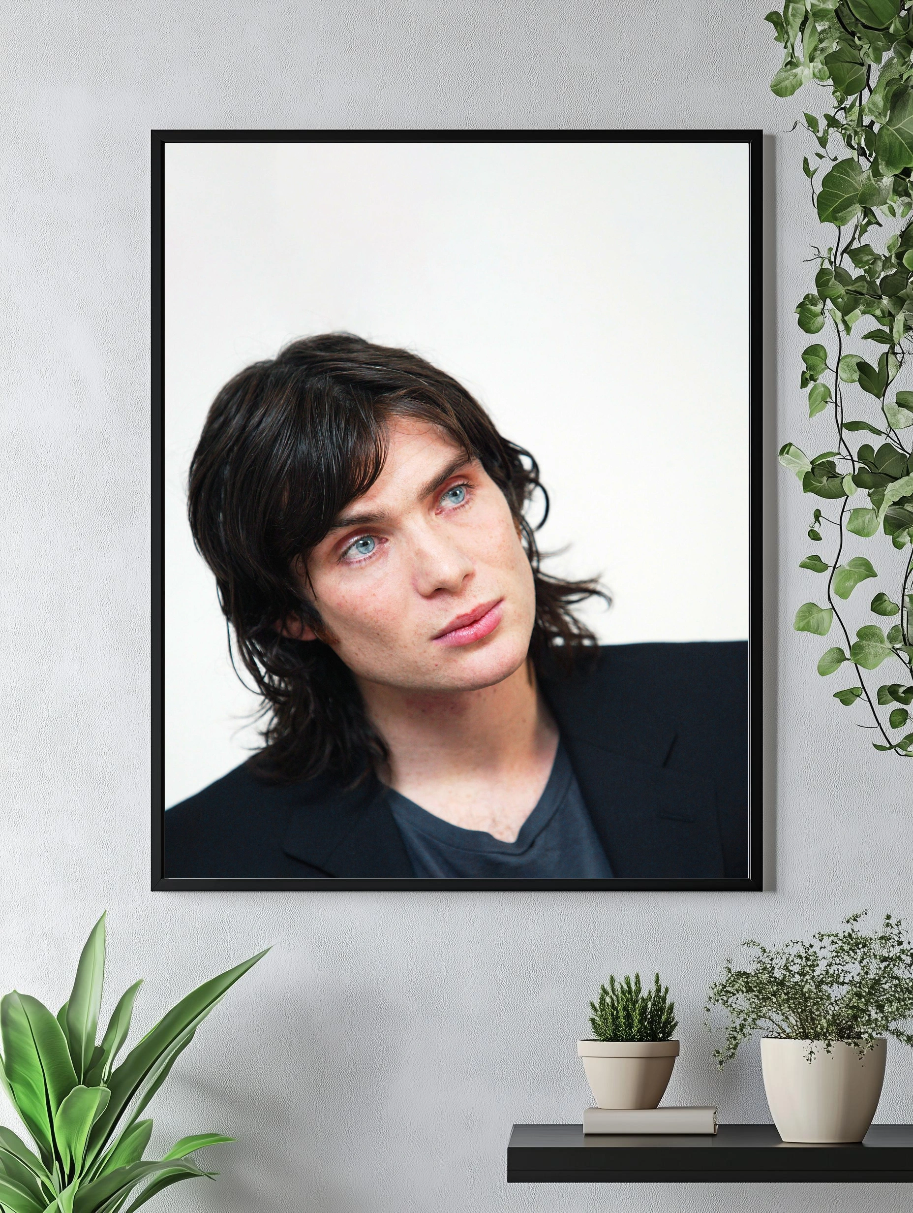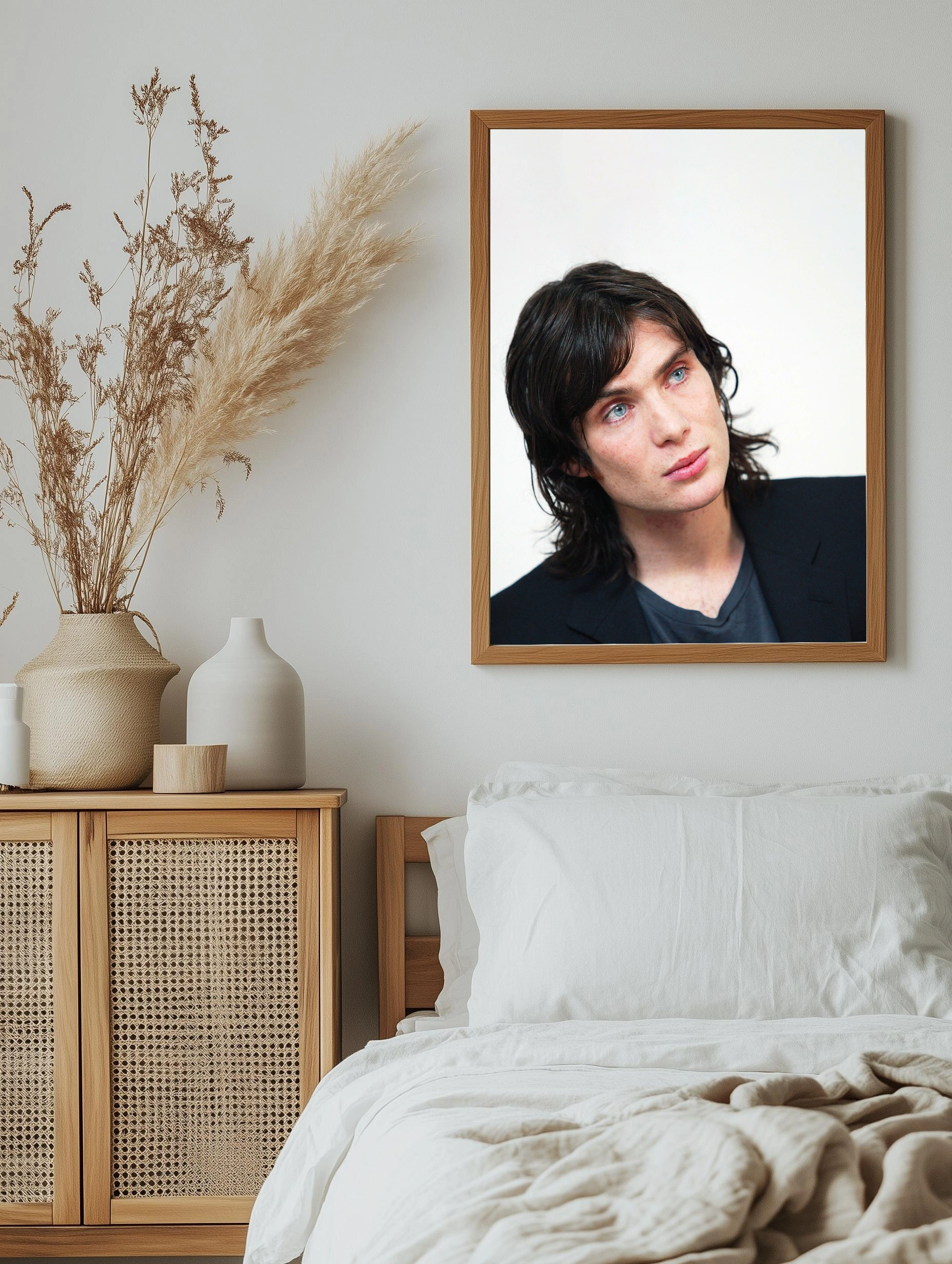 Изображение представляет собой детальный портрет молодого человека с голубыми глазами и тёмными волосами, одетого в чёрный пиджак на фоне светлой стены. Фото передаёт утончённое настроение и глубину взгляда, идеально подходит для стильного декора интерьера, современного искусства для стен и уникальных картин для дома.