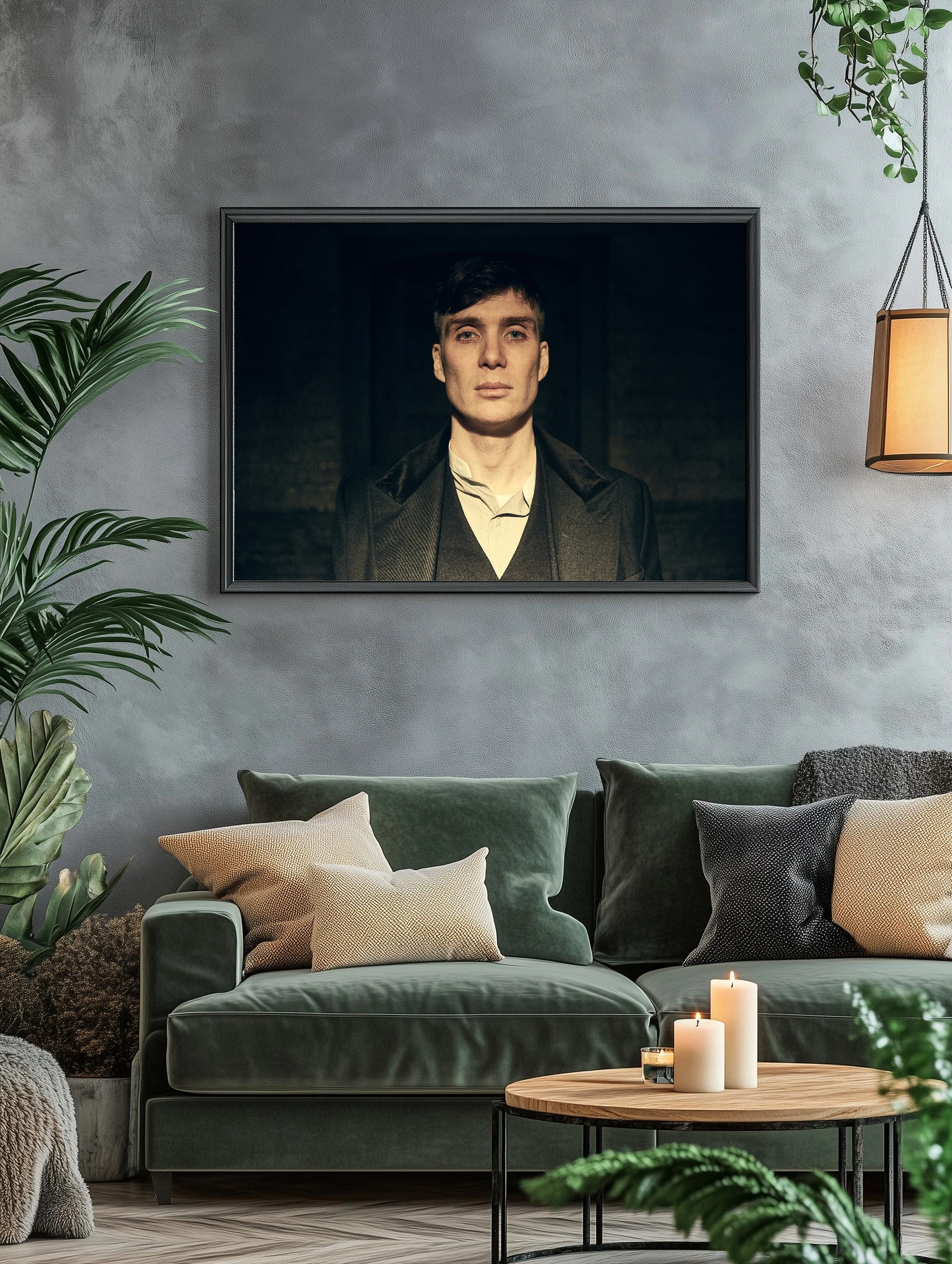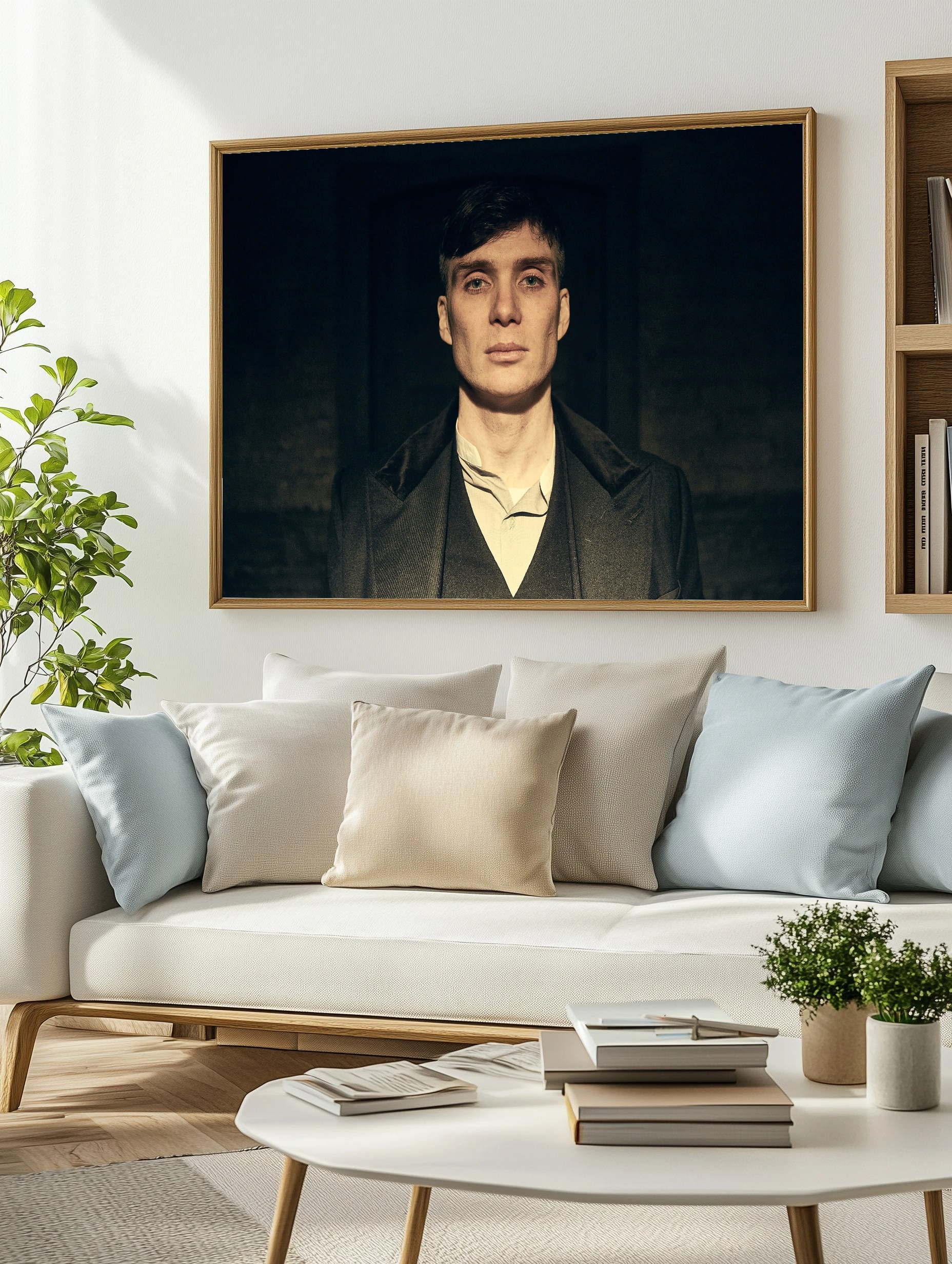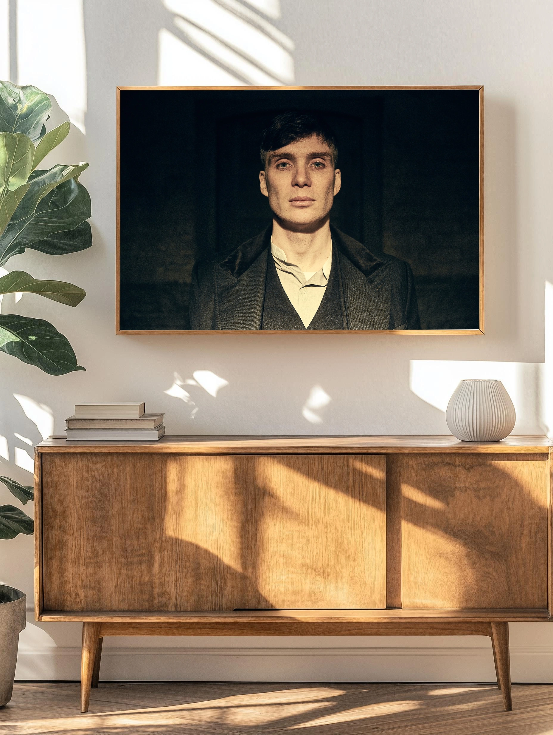 На изображении крупным планом представлен Томас Шелби — главный персонаж из популярного сериала «Острые козырьки». Это художественный портрет с акцентом на выразительные черты лица и мужественность героя в тёмной стилизованной одежде. Идеально подходит как интерьерное искусство для стен, создающее атмосферу силы и решимости.