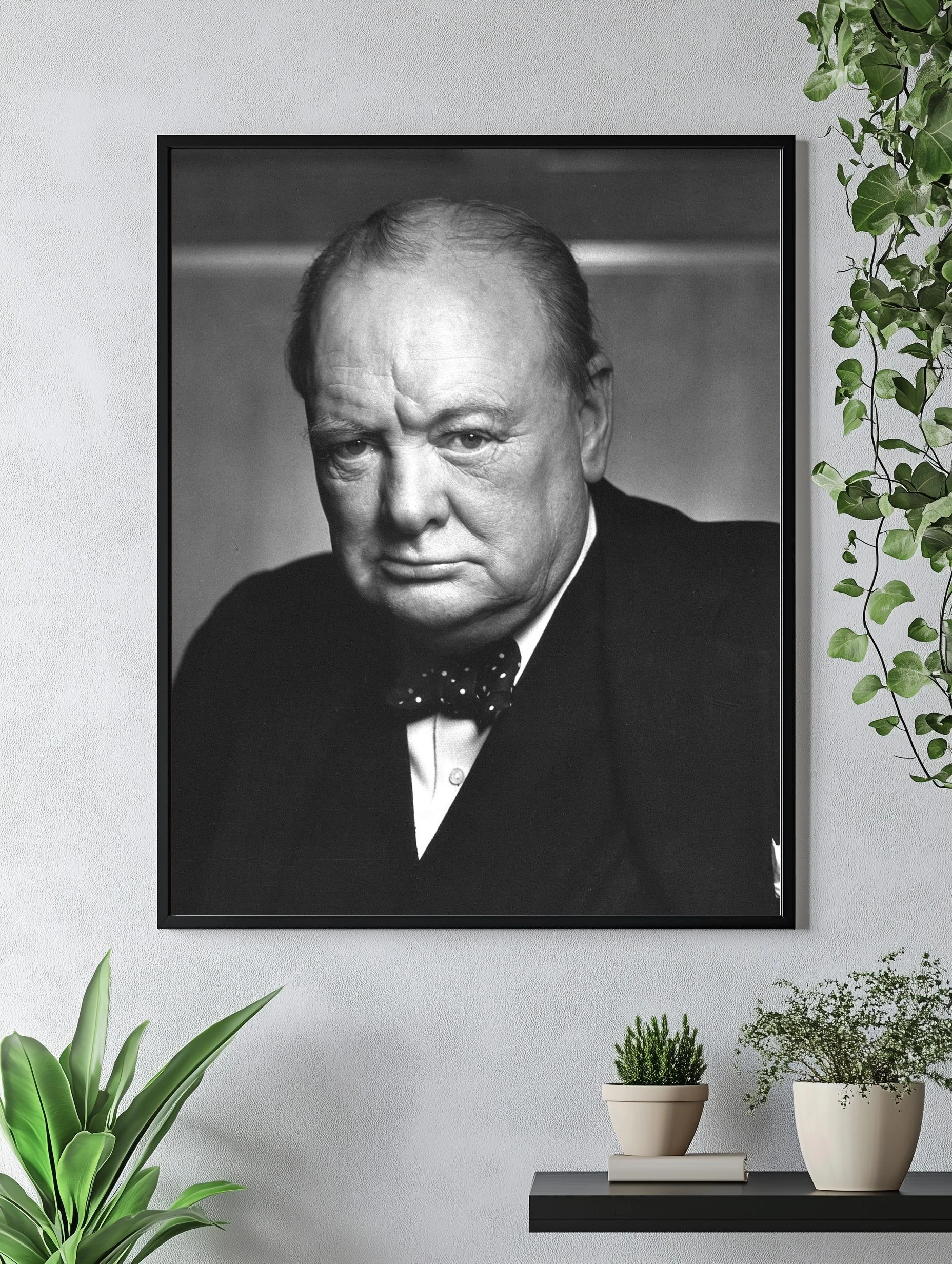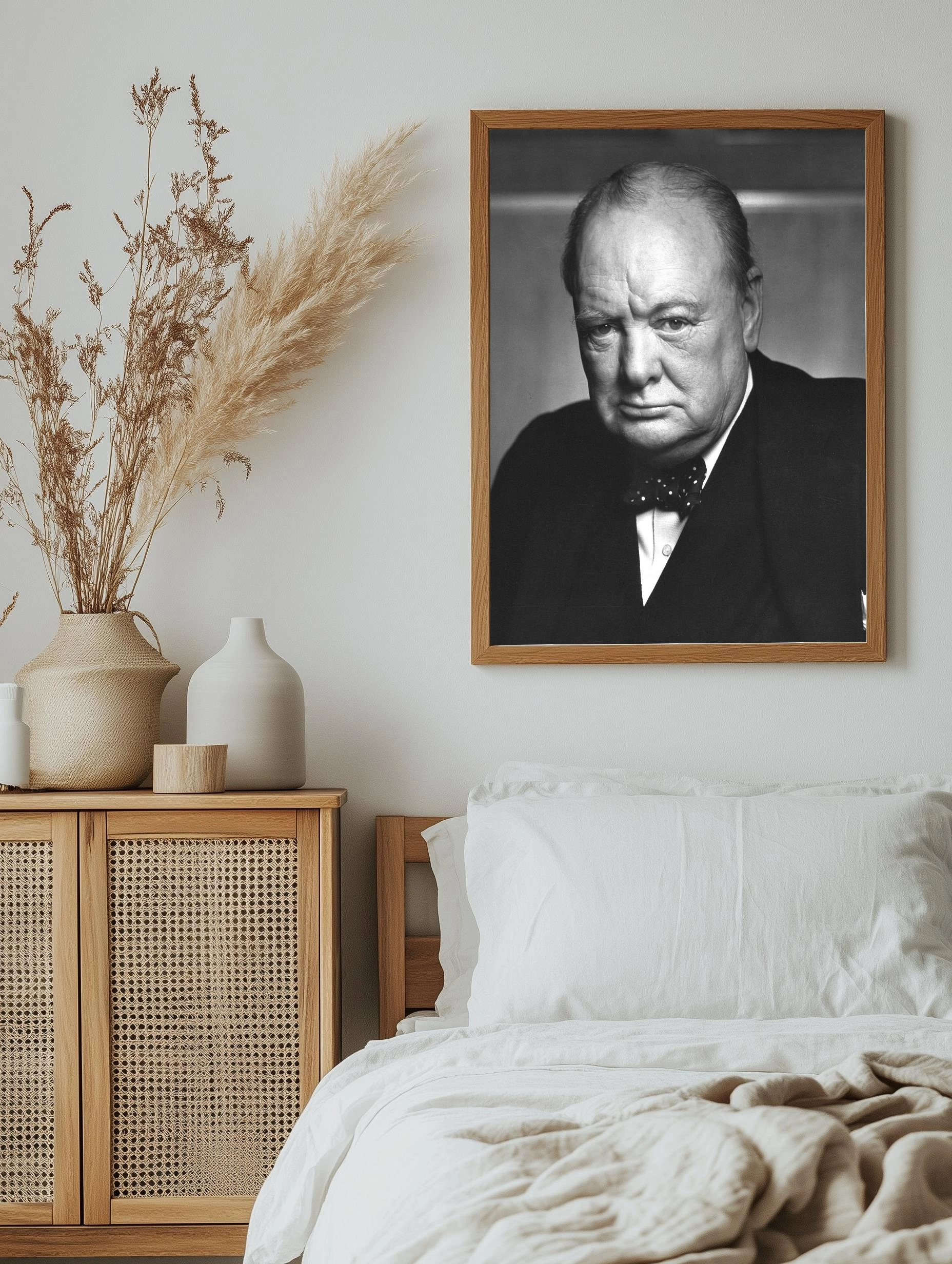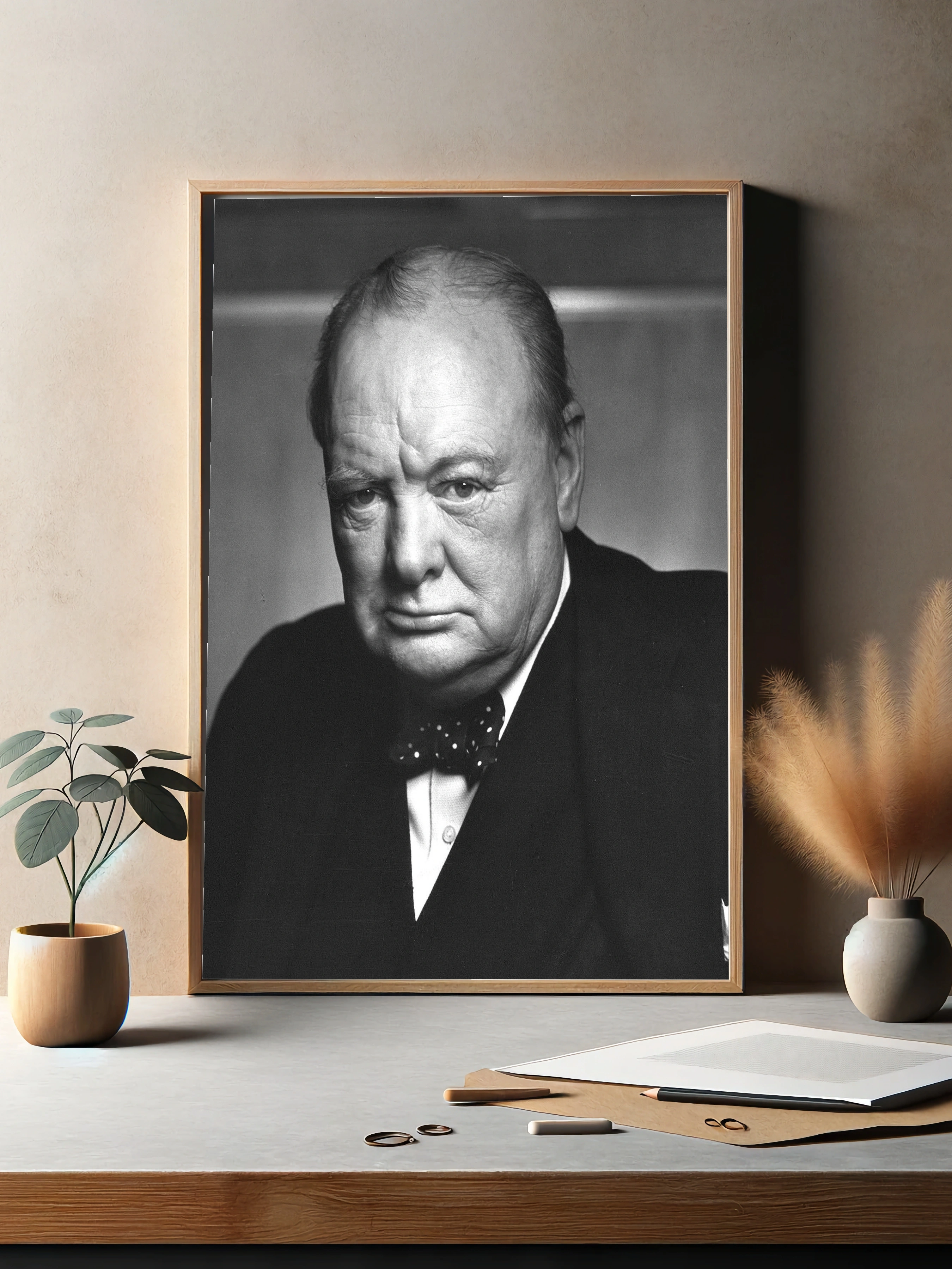 На изображении представлен черно-белый портрет Уинстона Черчилля — одного из самых знаменитых британских политиков XX века. Фотография выполнена в классическом стиле с акцентом на выразительные черты лица и характерную бабочку. Такое художественное изображение идеально подходит для интерьерного декора в офисе или гостиной, создавая атмосферу силы и решимости.