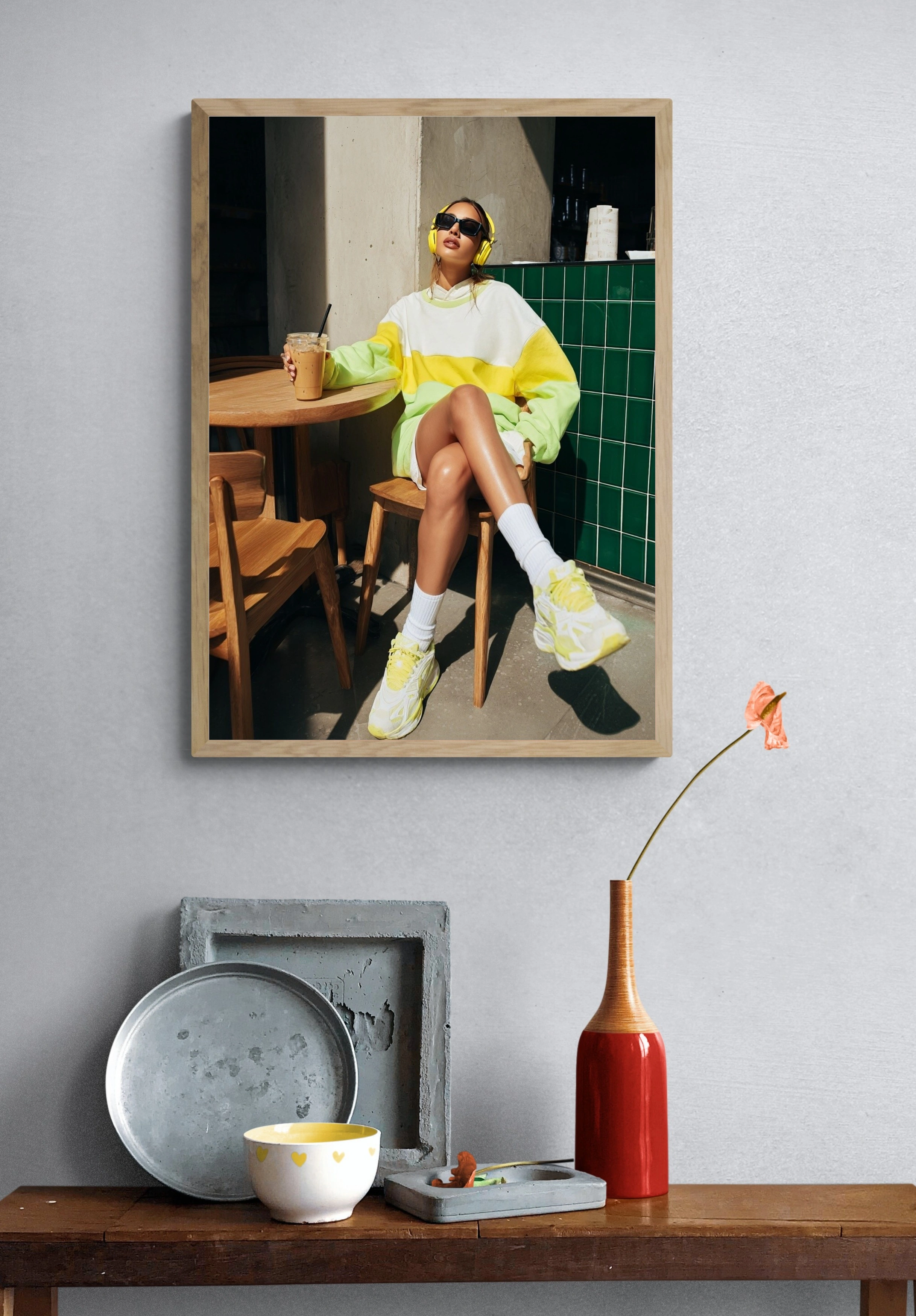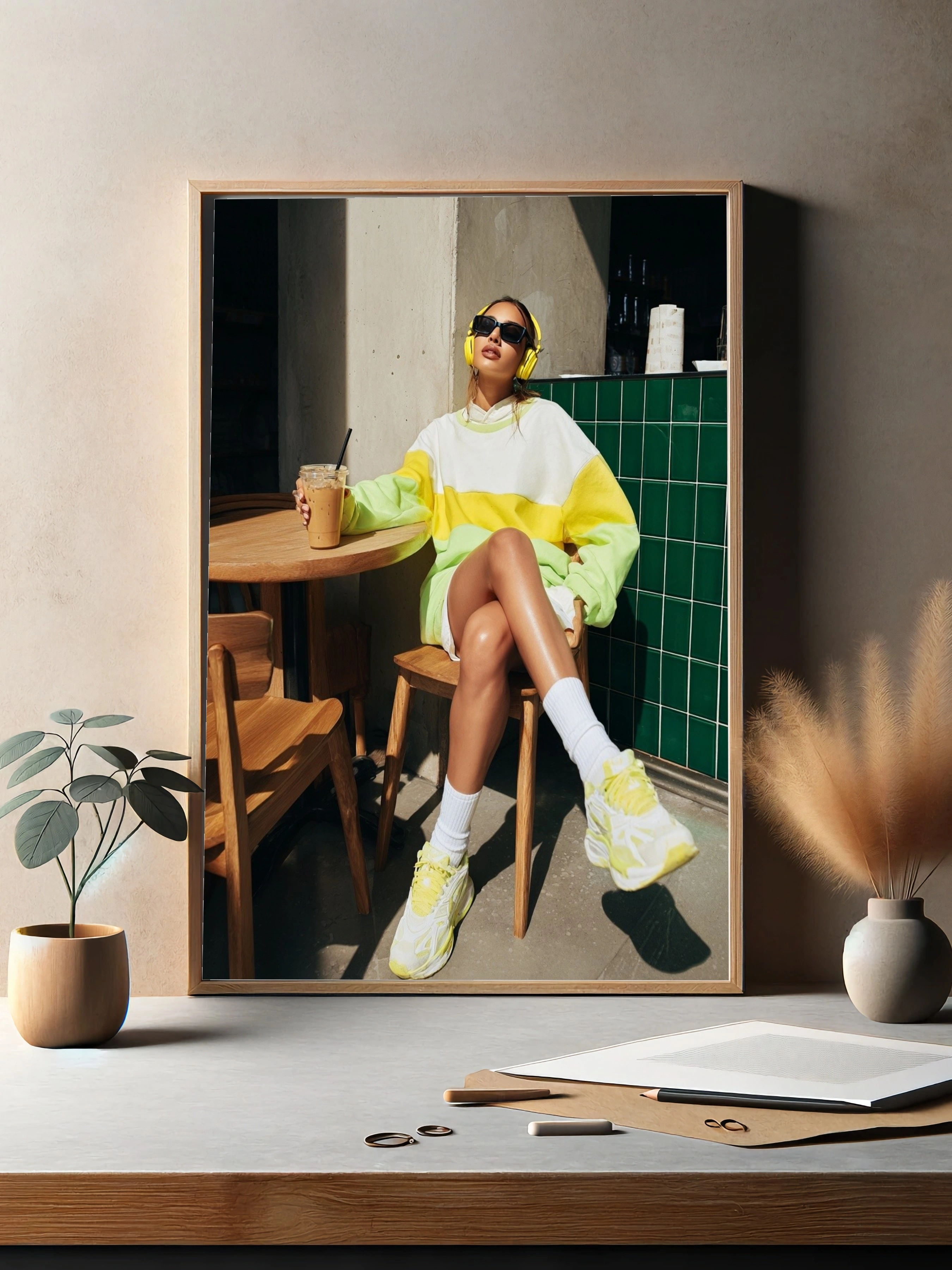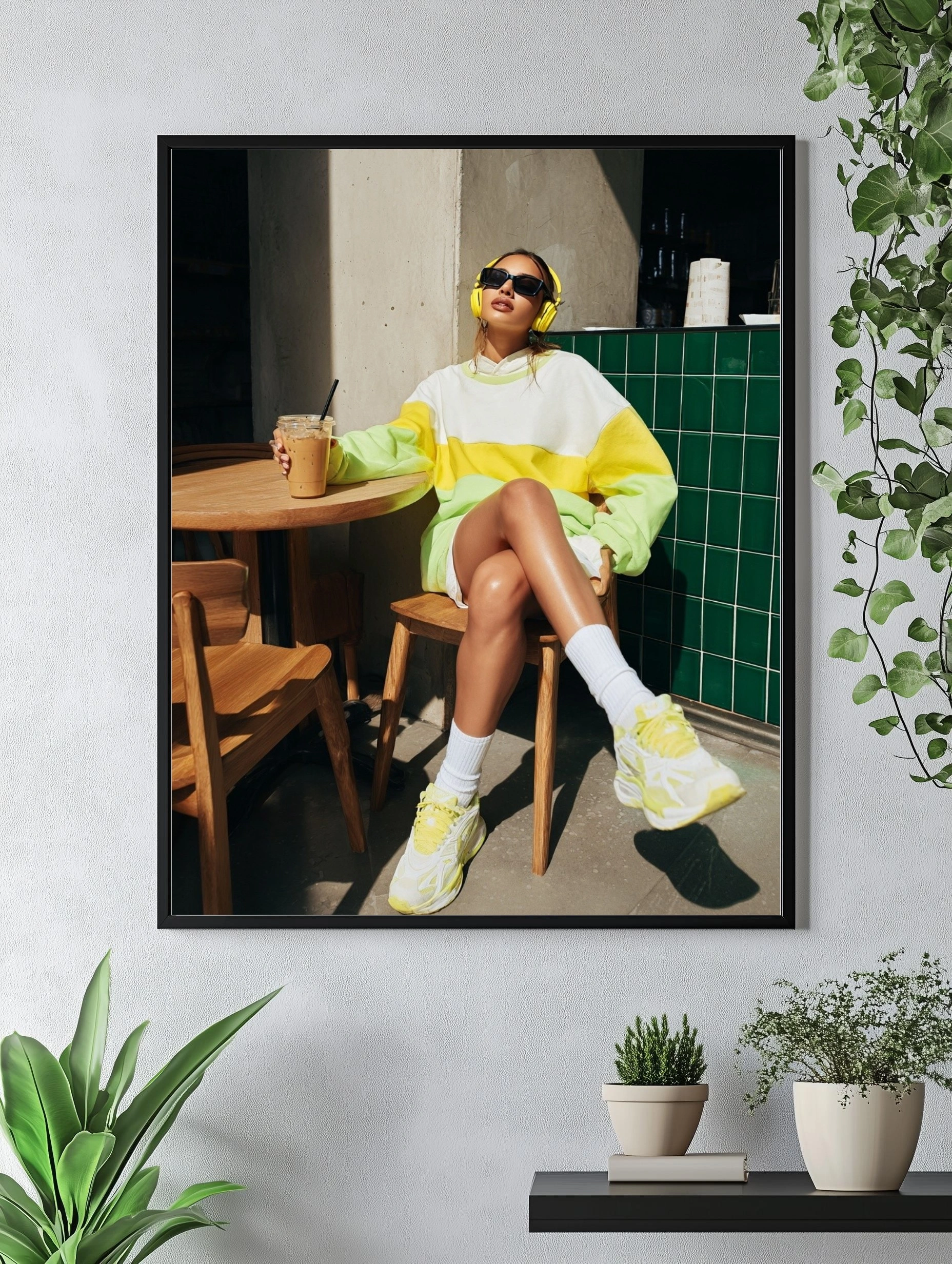 Погрузитесь в атмосферу уюта и стиля с этим постером, на котором изображена молодая женщина, наслаждающаяся своим временем в кафе. Она одета в яркий свитер с зелеными и желтыми полосами, который идеально подчеркивает ее индивидуальность. На ней стильные черные очки и желтые наушники, создающие модный акцент. В одной руке она держит стакан с холодным кофе, а другая расслабленно покоится на столе. Фон постера украшен зелеными плитками, что добавляет свежести и контраста. Этот постер станет отличным дополнением для гостиной, спальни или креативного пространства, привнося в интерьер яркие эмоции и стиль. Идеально подходит для молодежи и креативщиков, стремящихся к самовыражению и уникальности.