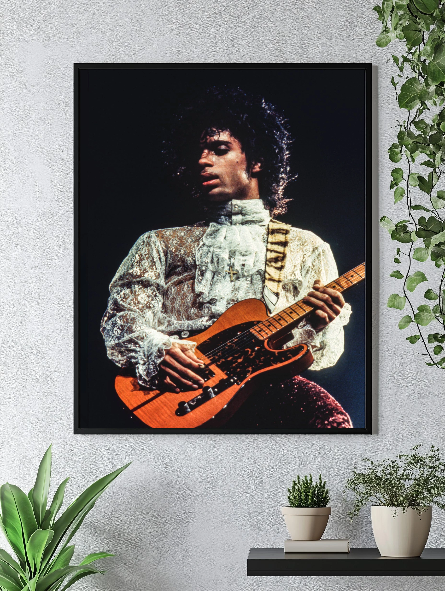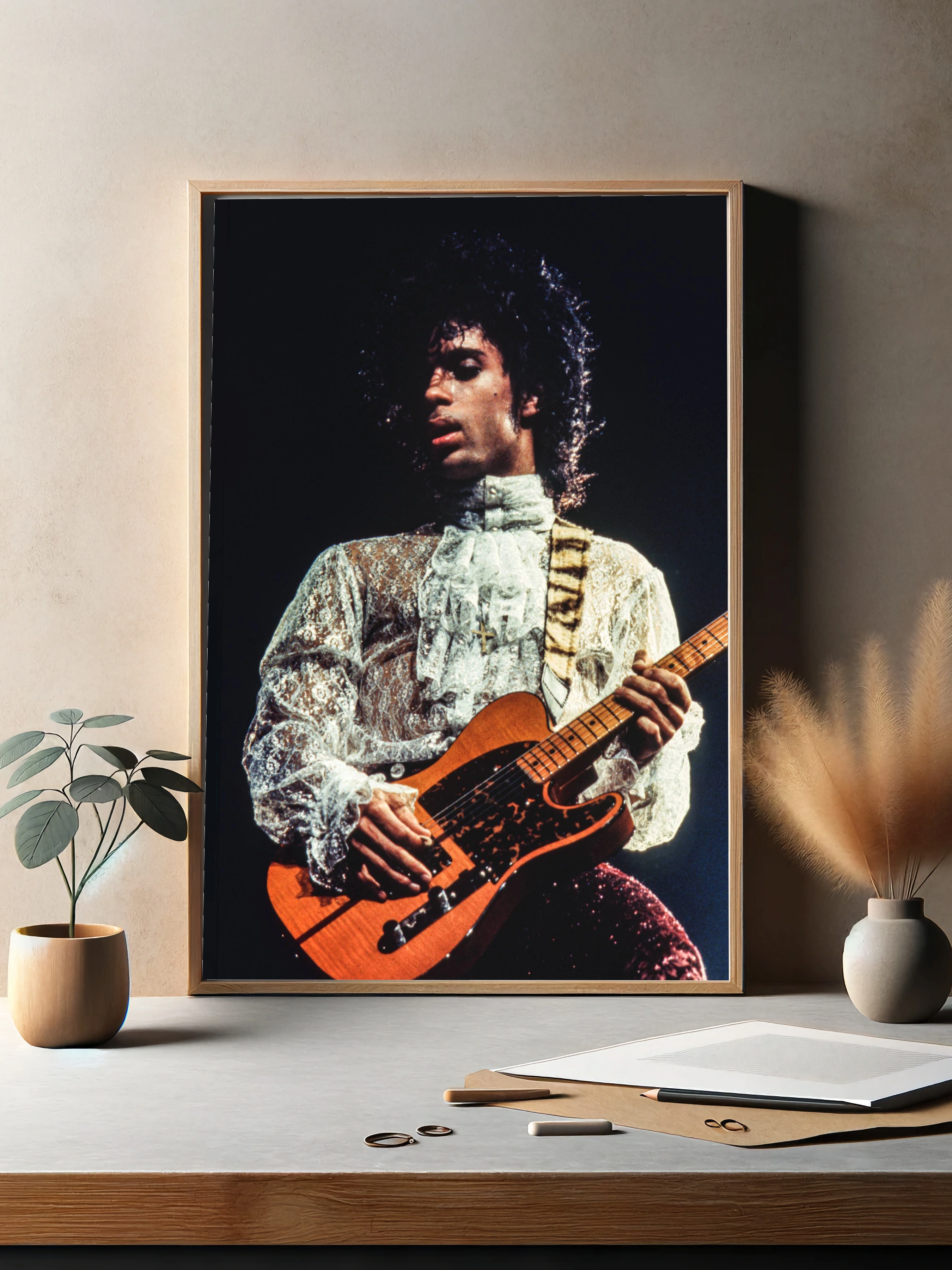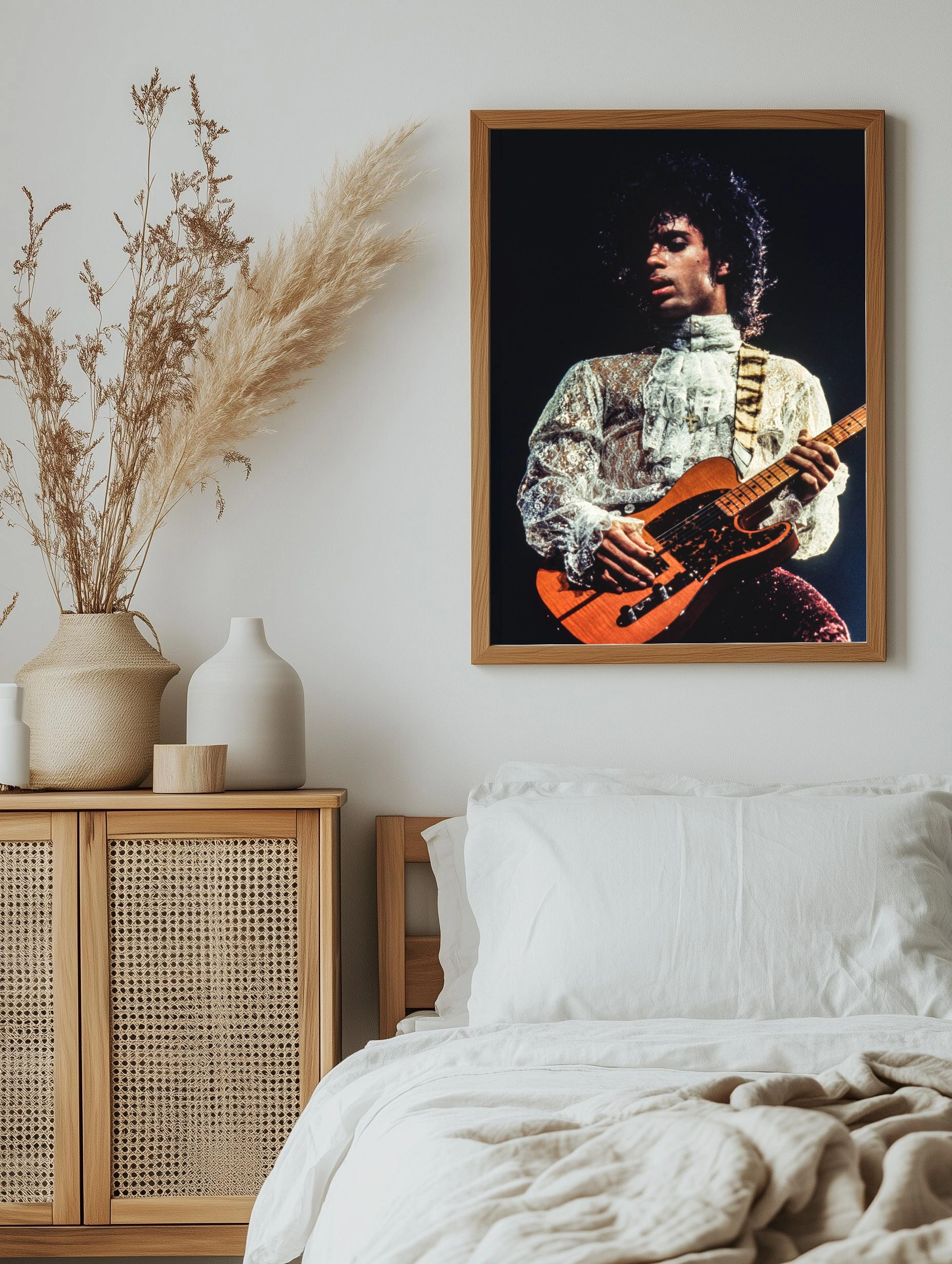 Эта художественная картина изображает культового музыканта Принса с электрогитарой в руках. В интерьере она станет стильным декором стены, идеально впишется в гостиную или музыкальную студию. Комбинация винтажного образа и современной фотографии создаёт уникальный интерьерный арт с принтом для дома и офиса.
