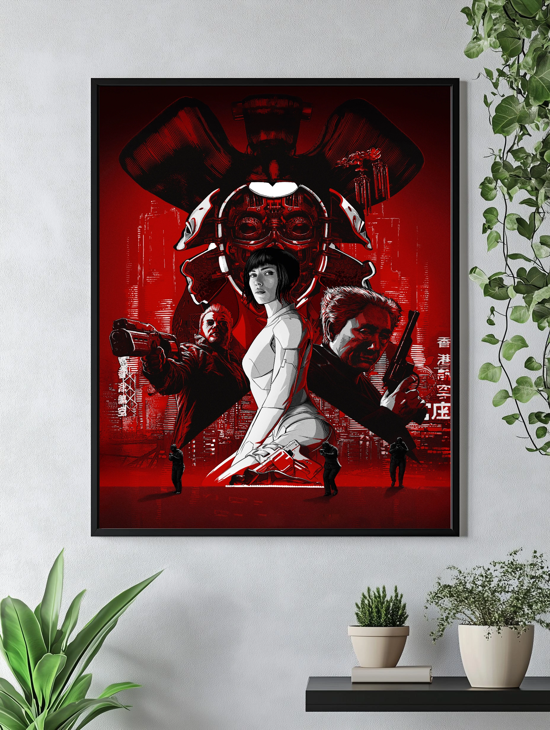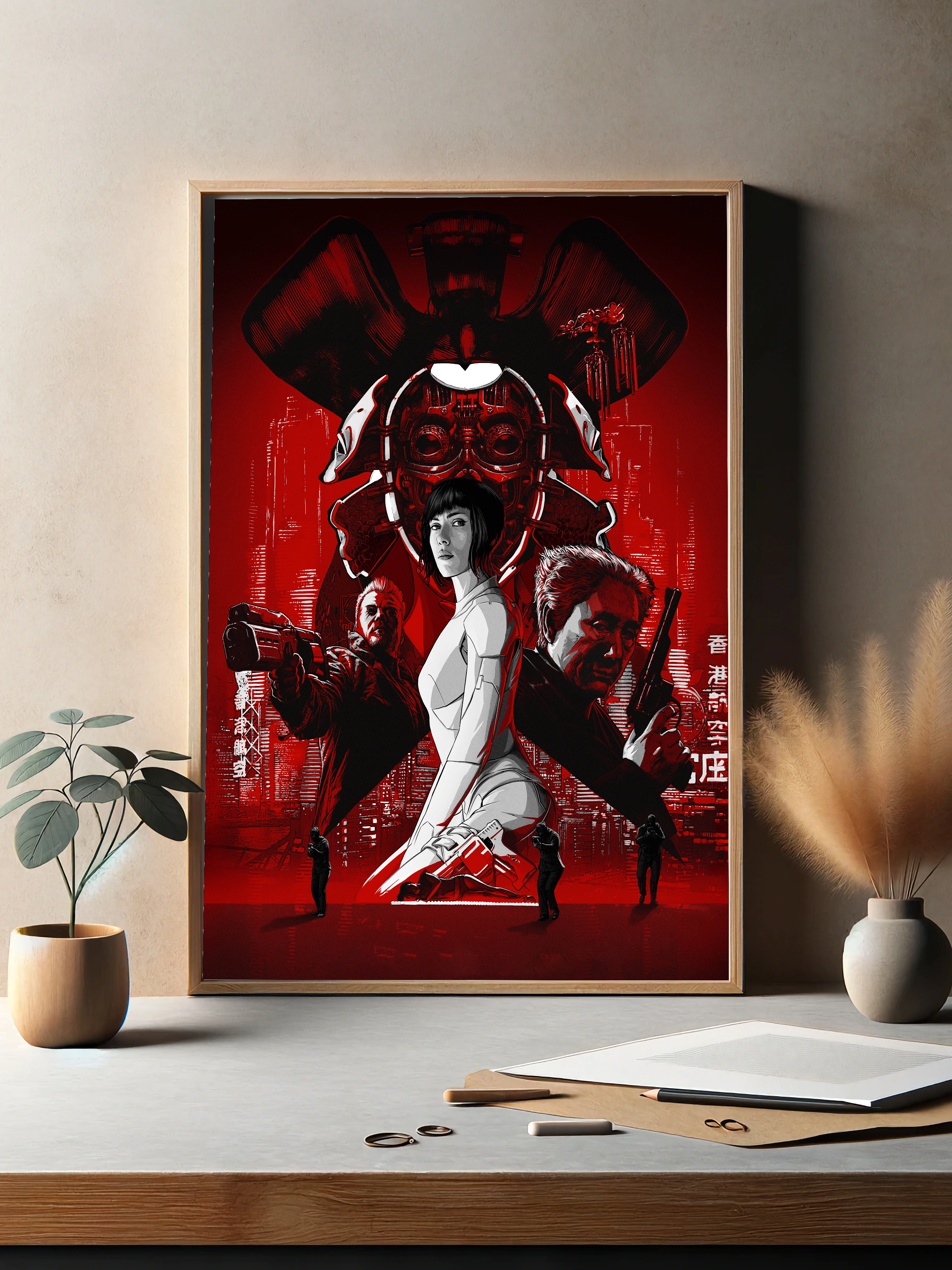 Яркий интерьерный постер в стиле киберпанк с изображением известного персонажа Мотокроссера из культового аниме и манги «Призрак в доспехах». Центральная фигура — девушка в белом механическом костюме, окружённая тенями и футуристическими элементами с городским пейзажем на фоне. Красный и чёрный цвета подчеркивают динамизм и напряжённую атмосферу постапокалиптического мира. Отличный художественный плакат для декора офиса или гостиной.