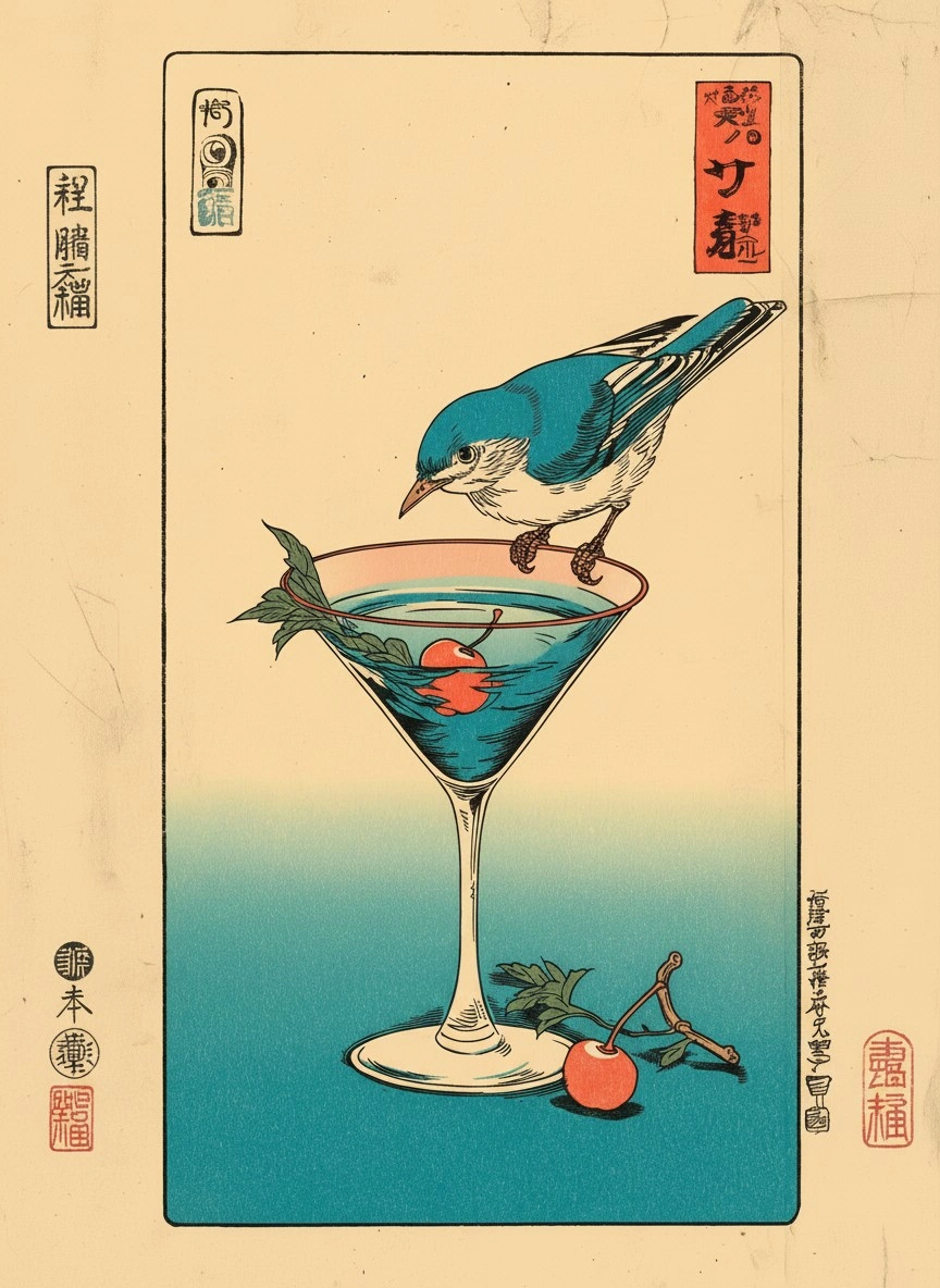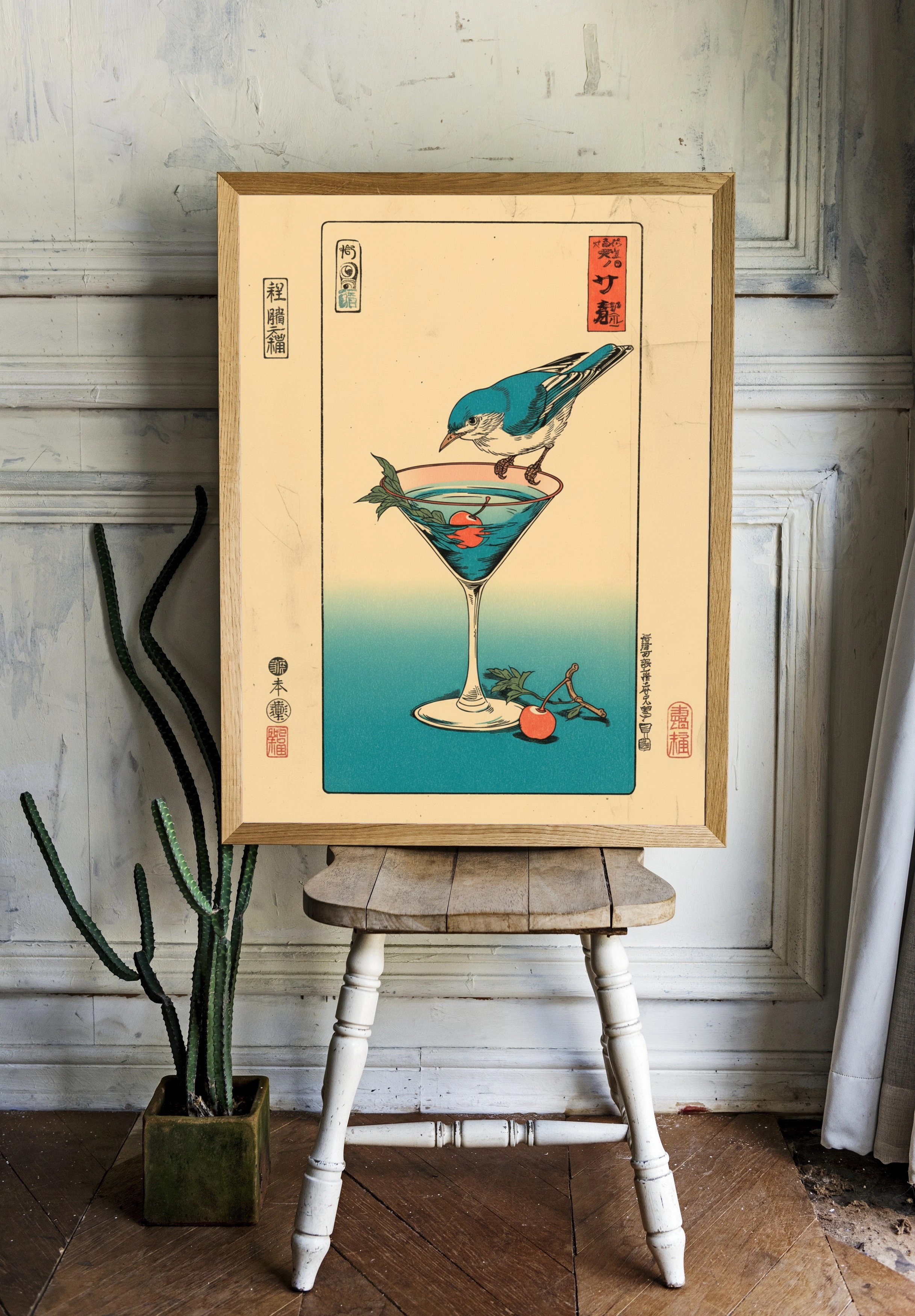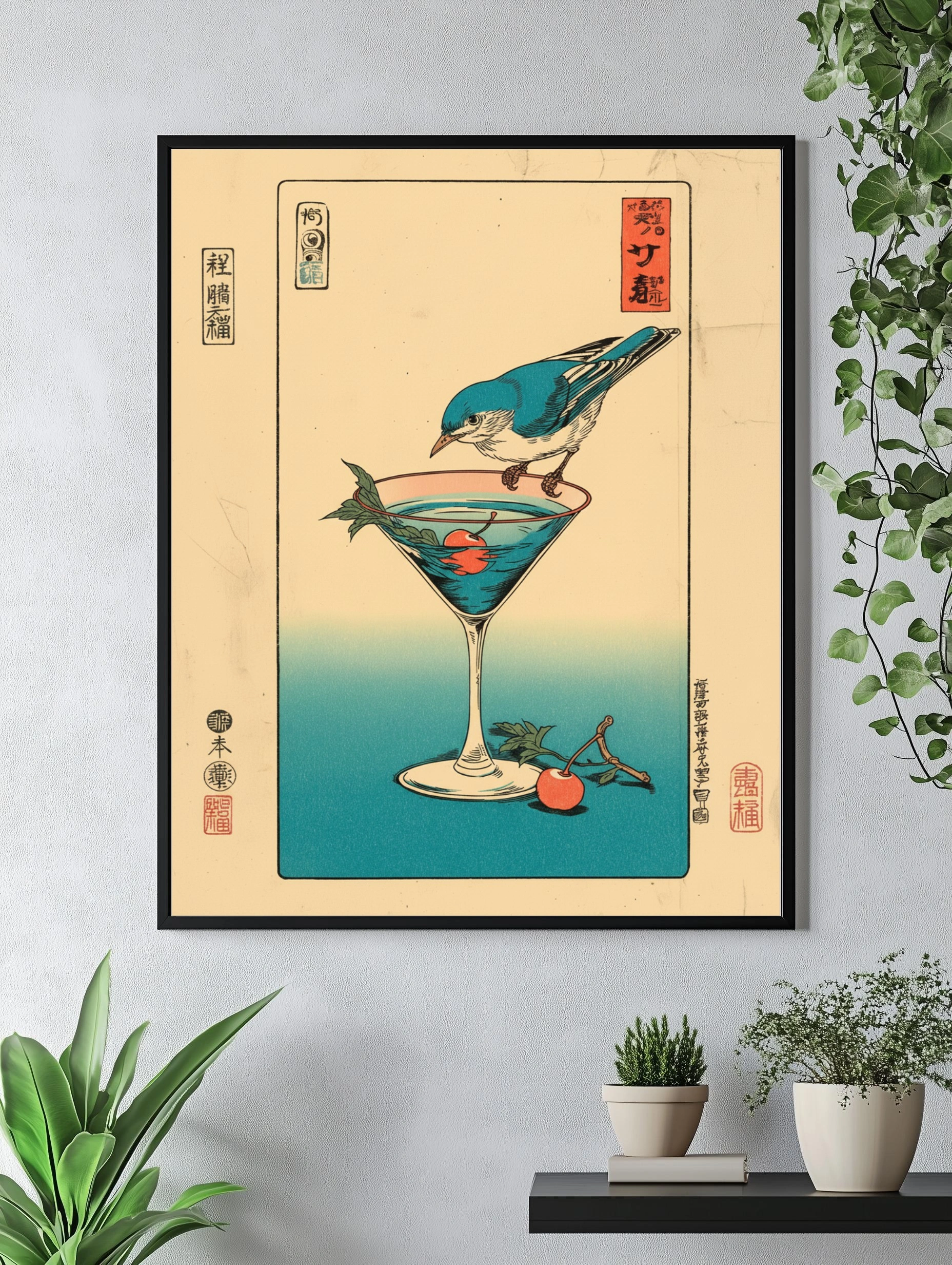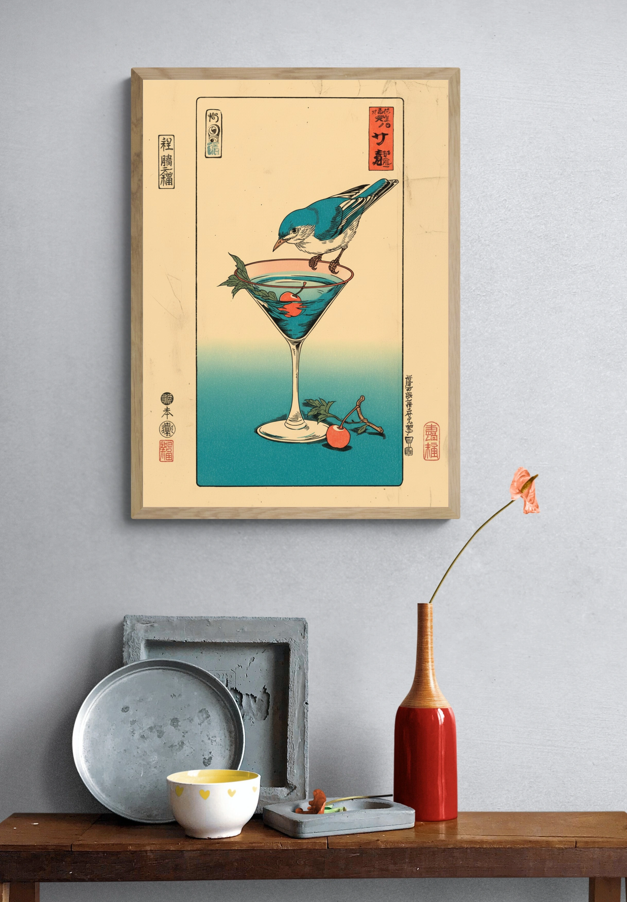 Этот уникальный постер привлекает внимание своим ярким сюжетом, на котором изображена изящная синяя птица, сидящая на краю коктейльного бокала. Бокал наполнен прозрачным голубым напитком, в котором плавает яркая вишенка и зелёная веточка. Фон плавно переходит от светло-бежевого к насыщенному голубому, создавая эффект глубины и легкости. Стиль постера напоминает японскую гравюру, что придаёт ему особую атмосферу и шарм. Этот арт-объект станет отличным акцентом в интерьере, добавляя нотку креативности и оригинальности в вашу гостиную, кухню или офис. Идеально подходит для молодежной аудитории и креативщиков, которые ценят уникальный дизайн и яркие цвета.