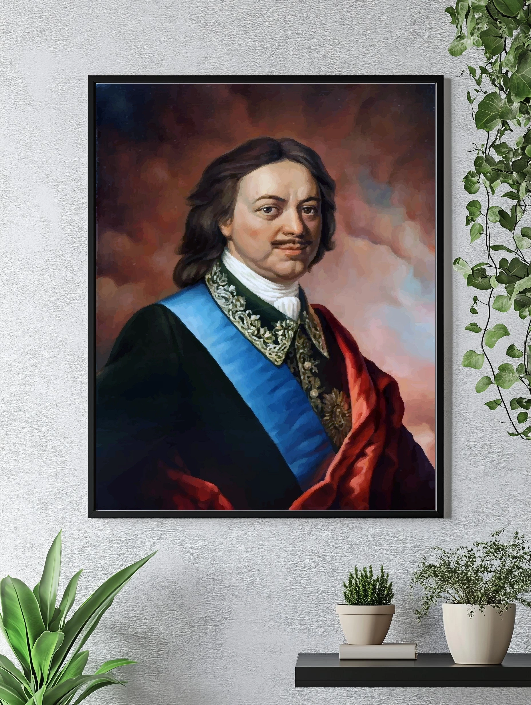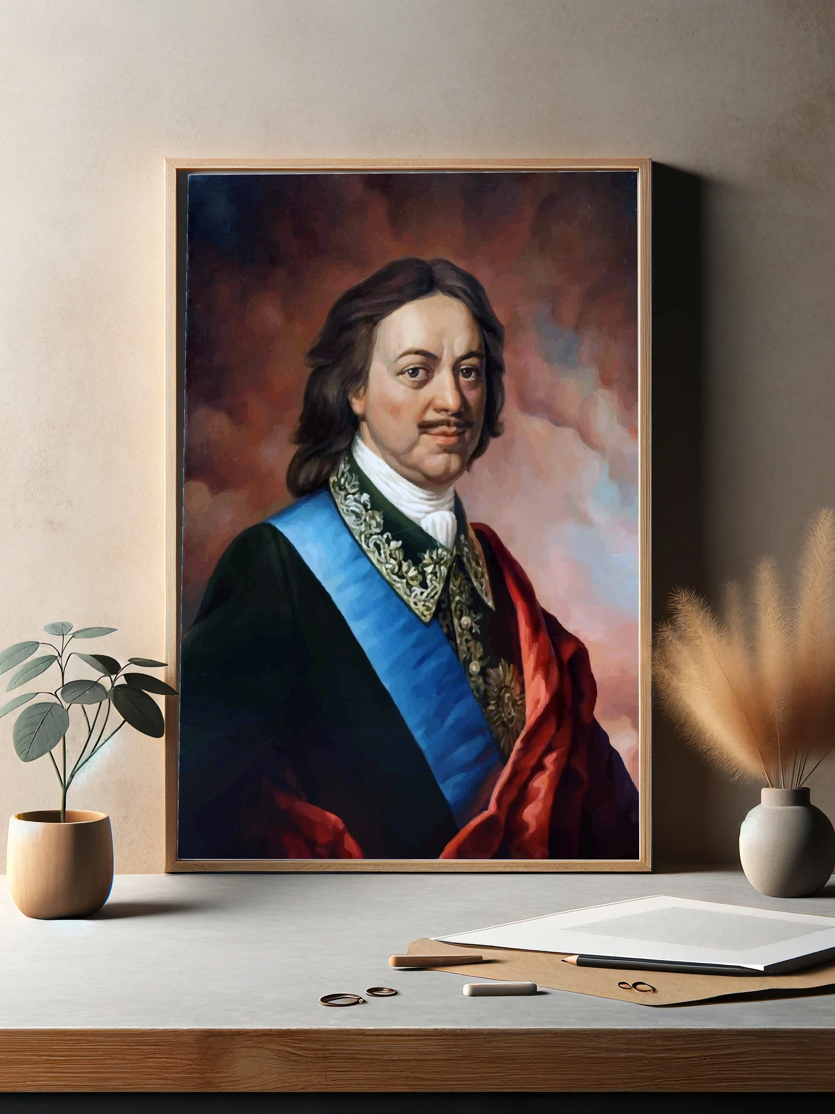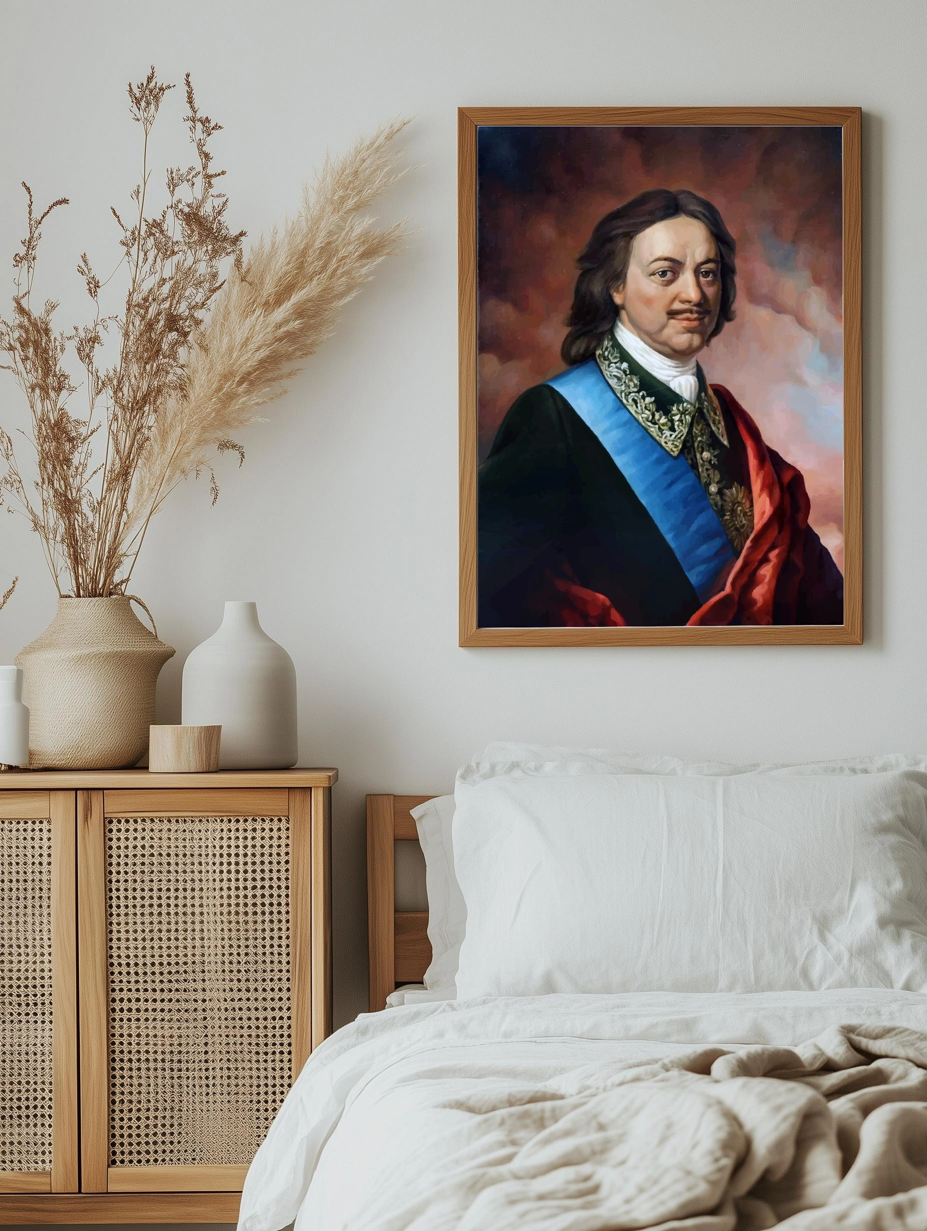 Художественный портрет Петра Великого в классическом европейском стиле, выполненный в тёплых коричневых, красных и синих тонах. На изображении император в парадной военной форме с синей лентой и золотыми орнаментами, что придаёт произведению выразительность и величественность. Этот интерьерный декоративный плакат прекрасно подойдёт для гостиной или кабинета, добавляя атмосферу исторической значимости и художественного изящества.
