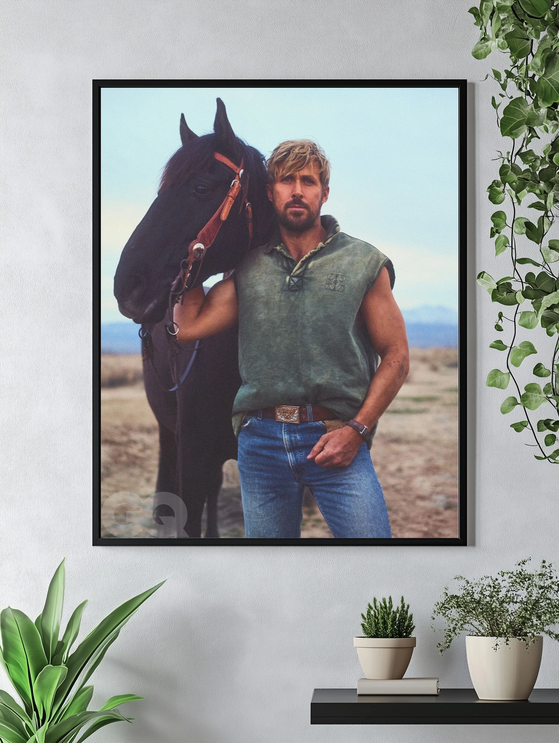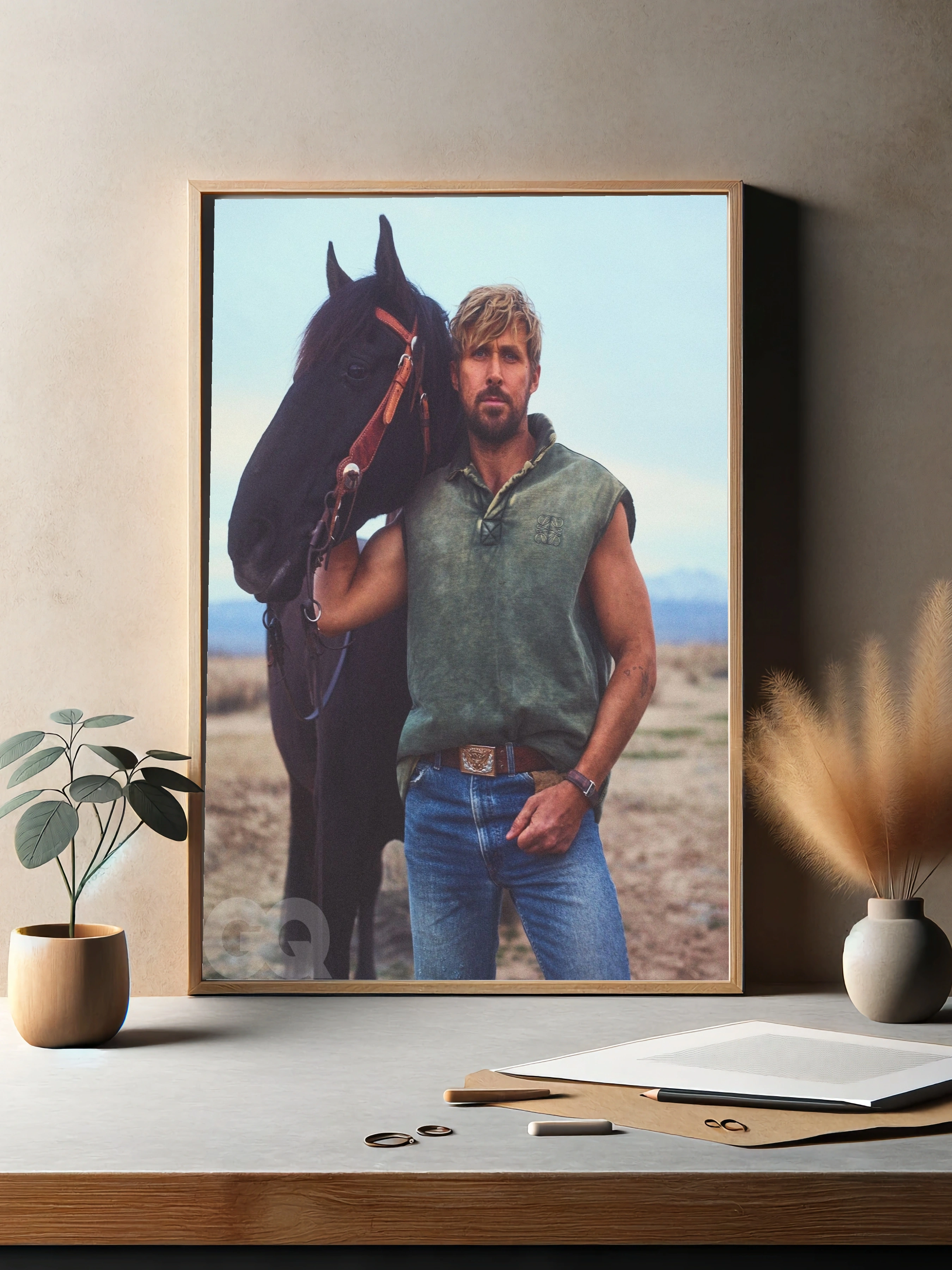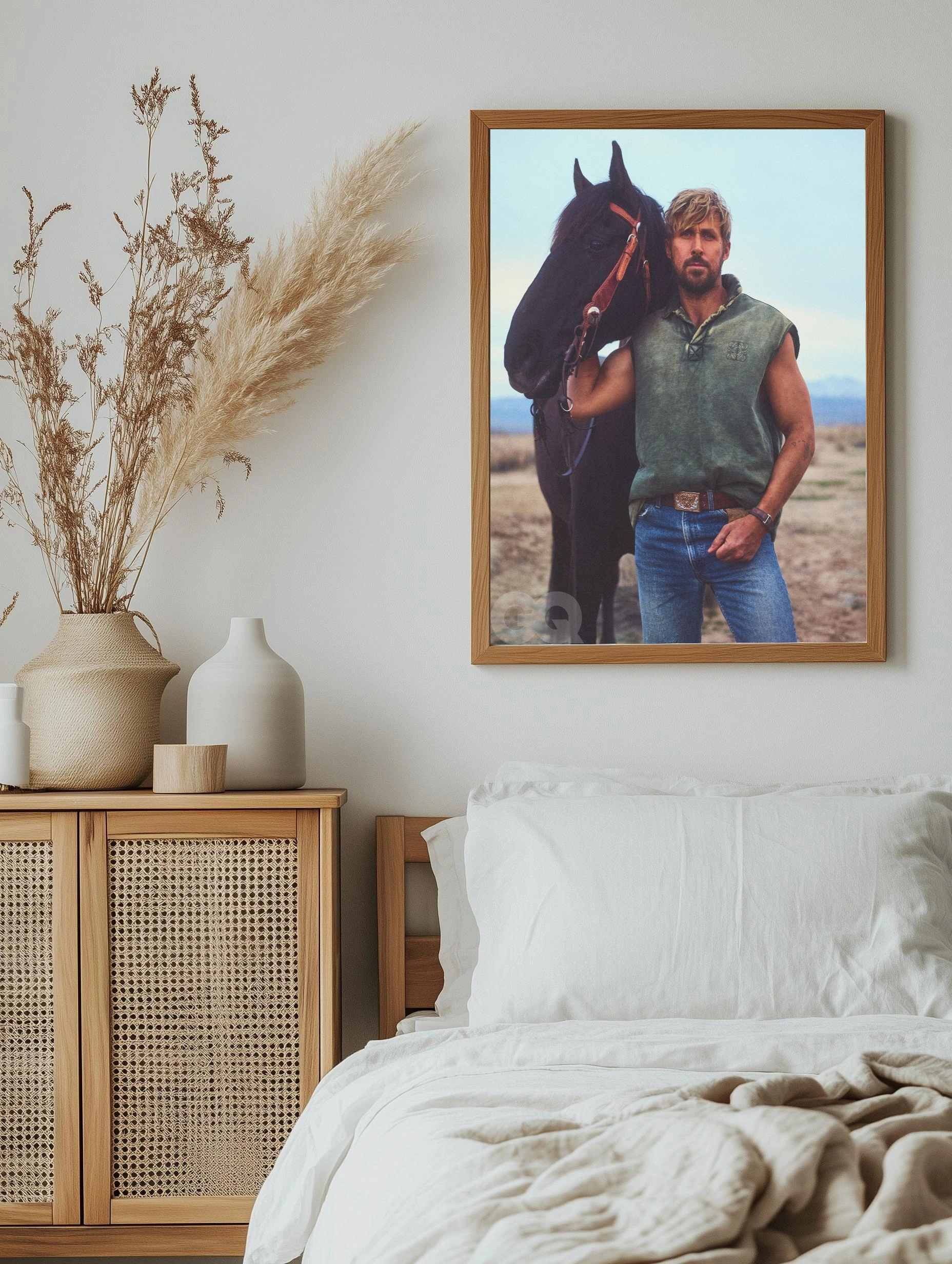 На изображении представлен мужественный мужчина в повседневной одежде — зеленой безрукавке и синих джинсах, стоящий рядом с черной лошадью. Фон — природный пейзаж с мягким естественным освещением, создающим атмосферу спокойствия и связи с природой. Это современное искусство для стен, стильный декор для дома и уникальные картины для спальни или гостиной.