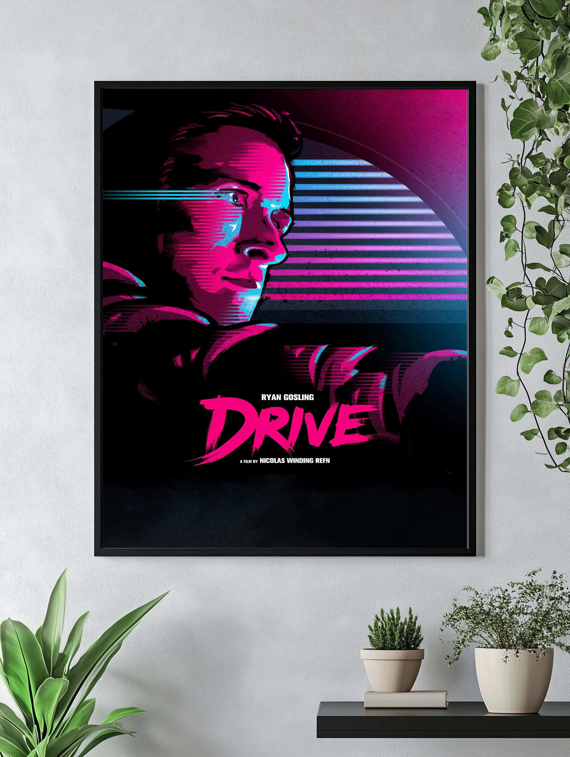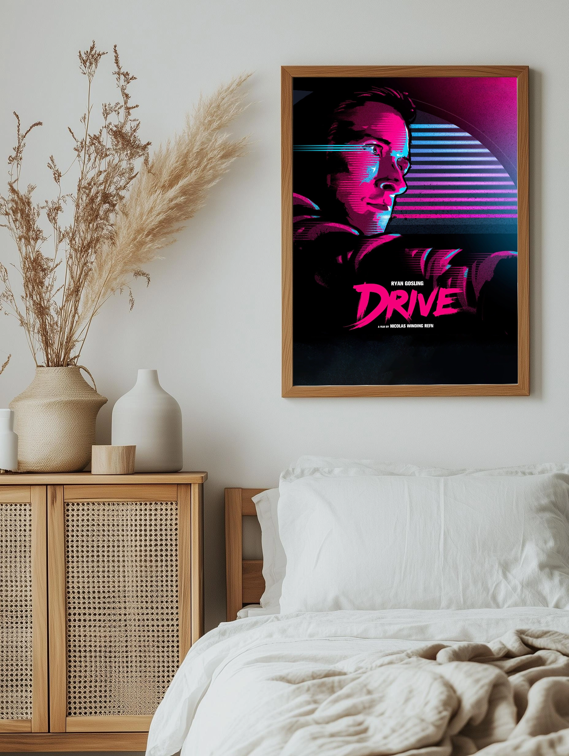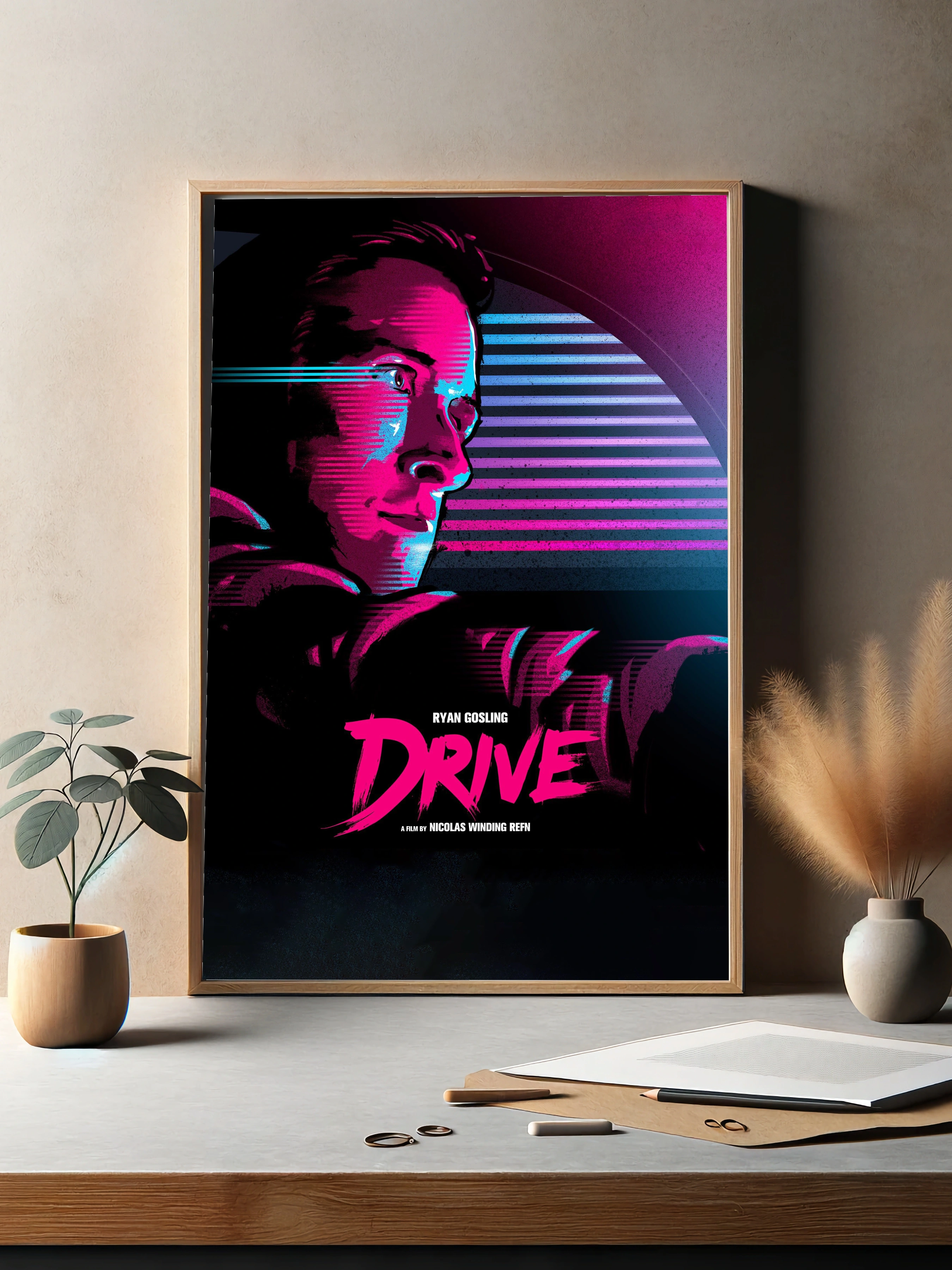 Декоративный плакат с изображением героя Райана Гослинга из фильма «Drive» от режиссёра Николаса Виндинга Рефна. Современное искусство в стиле неонового ретро с акцентом на розовые и синие оттенки, подчёркивающие напряжённый и загадочный настрой. Идеальная картина для спальни, гостиной или офиса, привносит в интерьер стильный и динамичный декор.