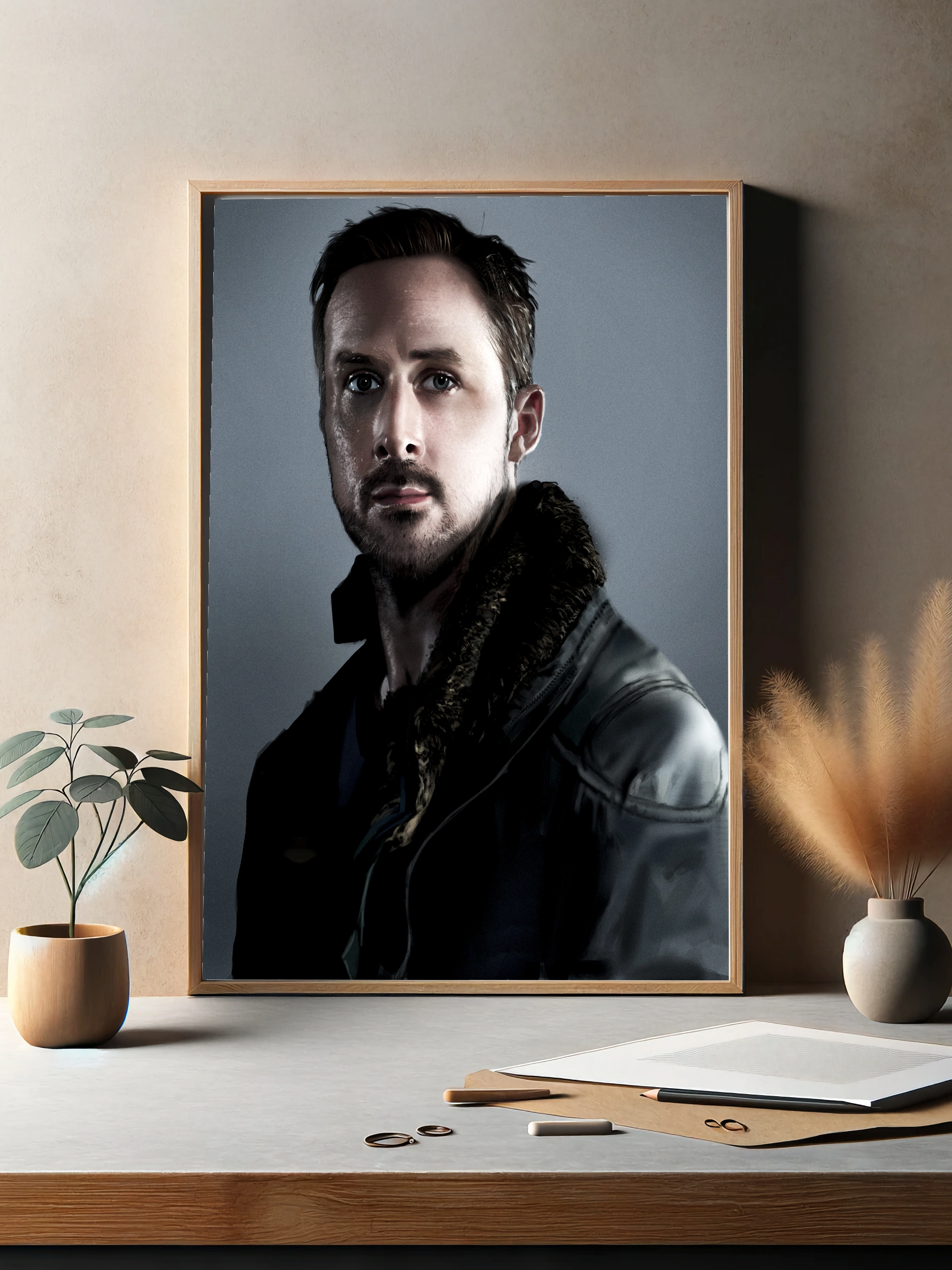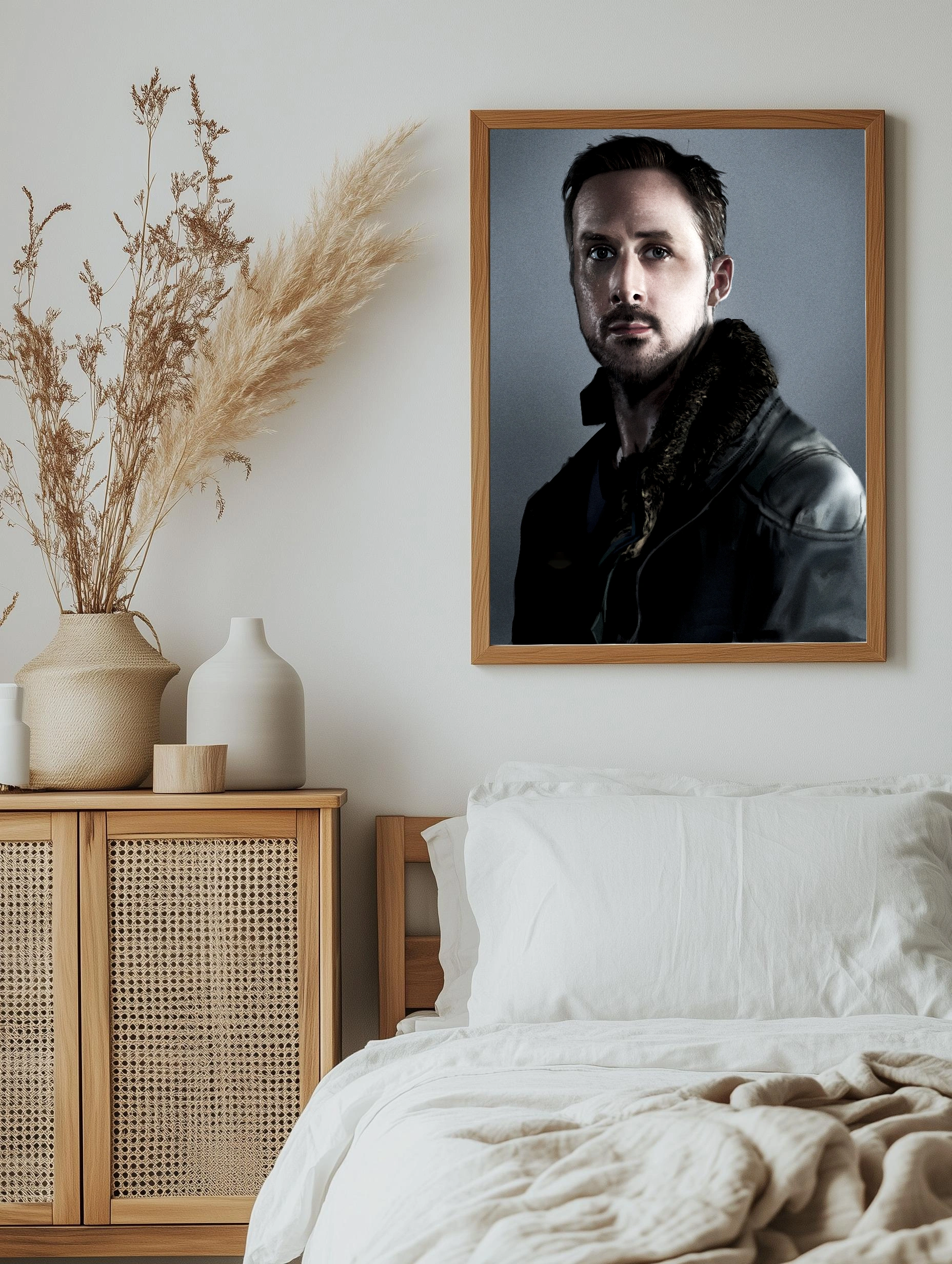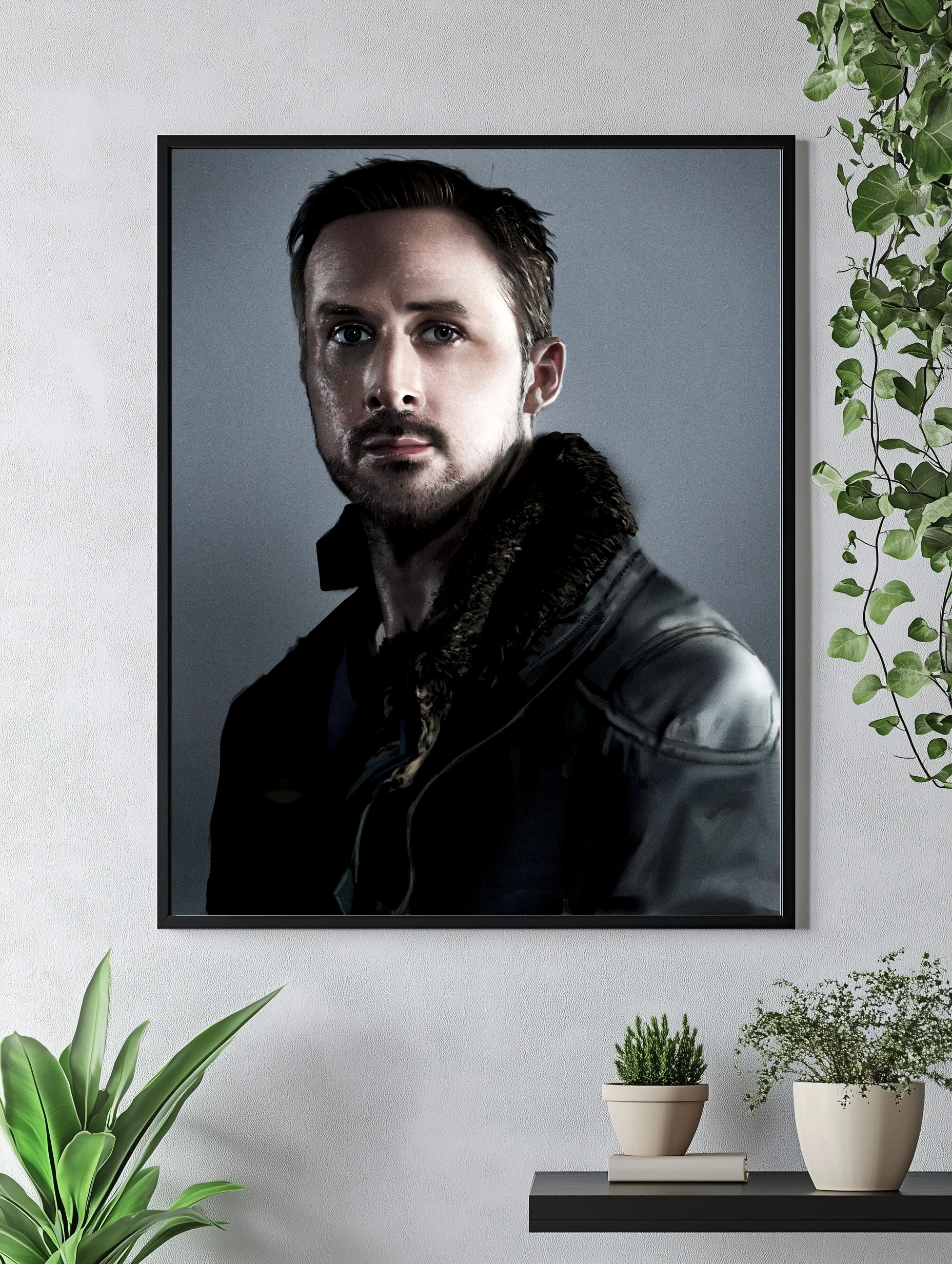 Изображён известный актёр Райан Гослинг в портретном стиле с напряжённым и задумчивым выражением лица. На фоне серого цвета подчёркивается контраст и глубина образа. Этот интерьерный декоративный плакат отлично впишется в современный дизайн гостиной, спальни или офиса, добавляя уникальный акцент и стильный декор стен.
