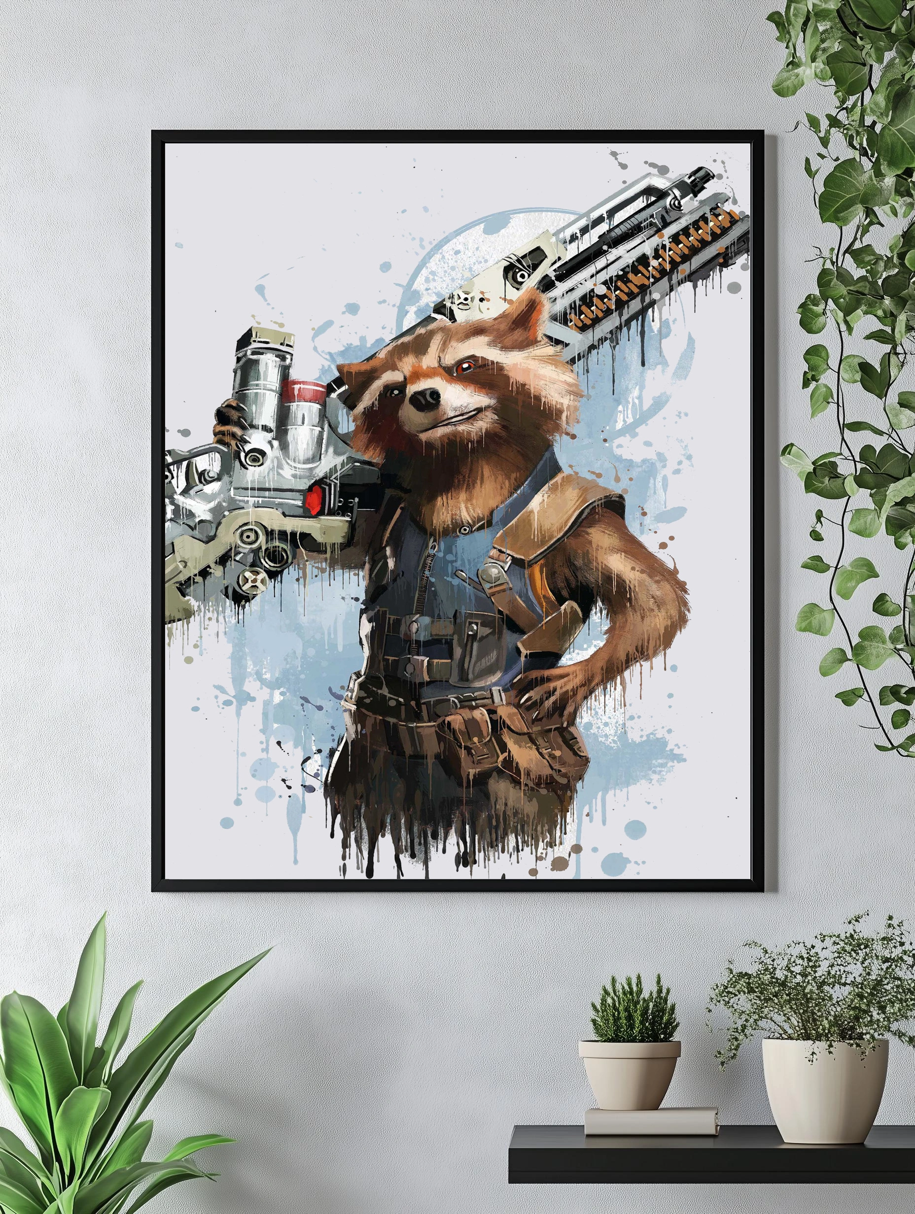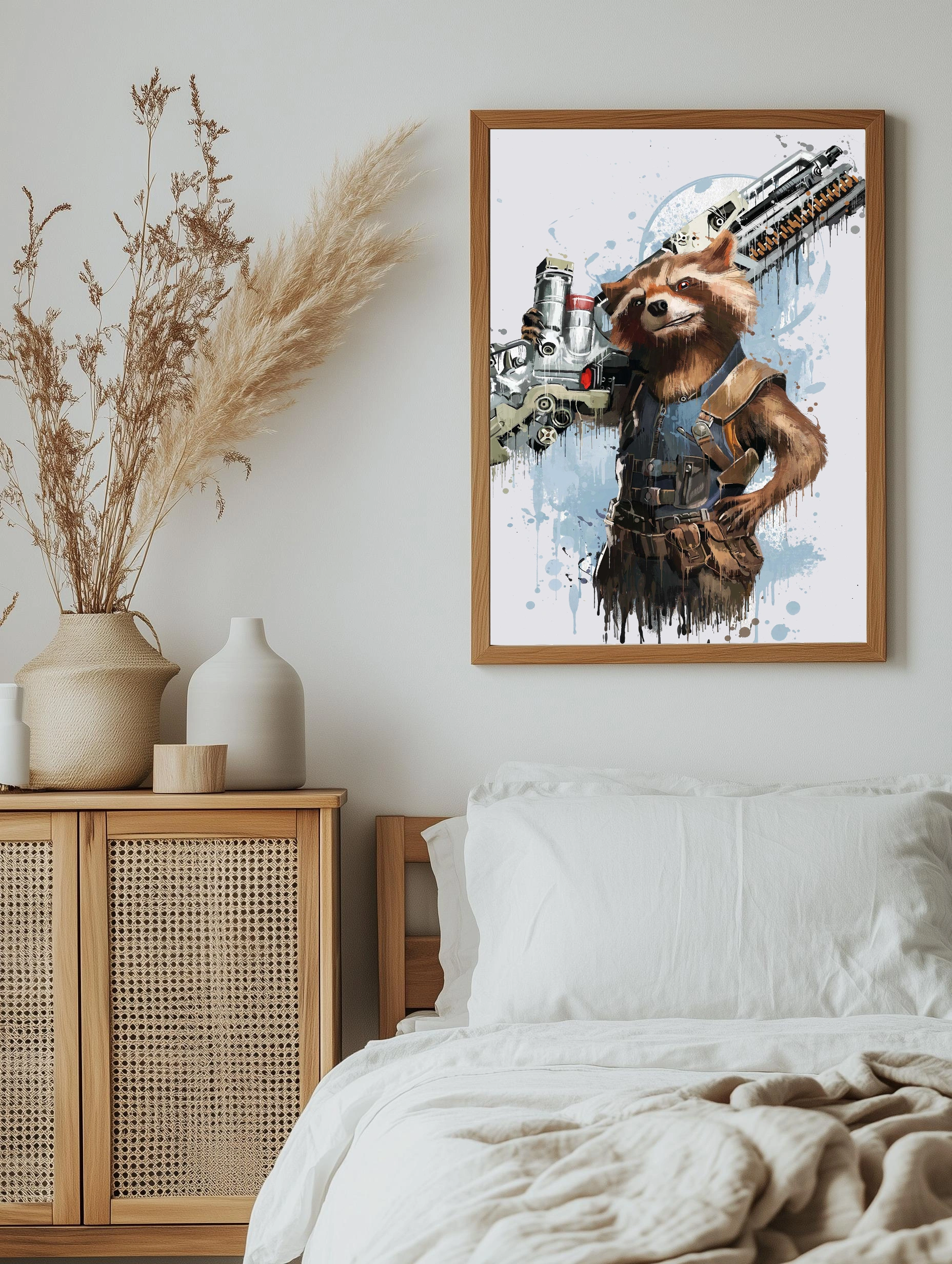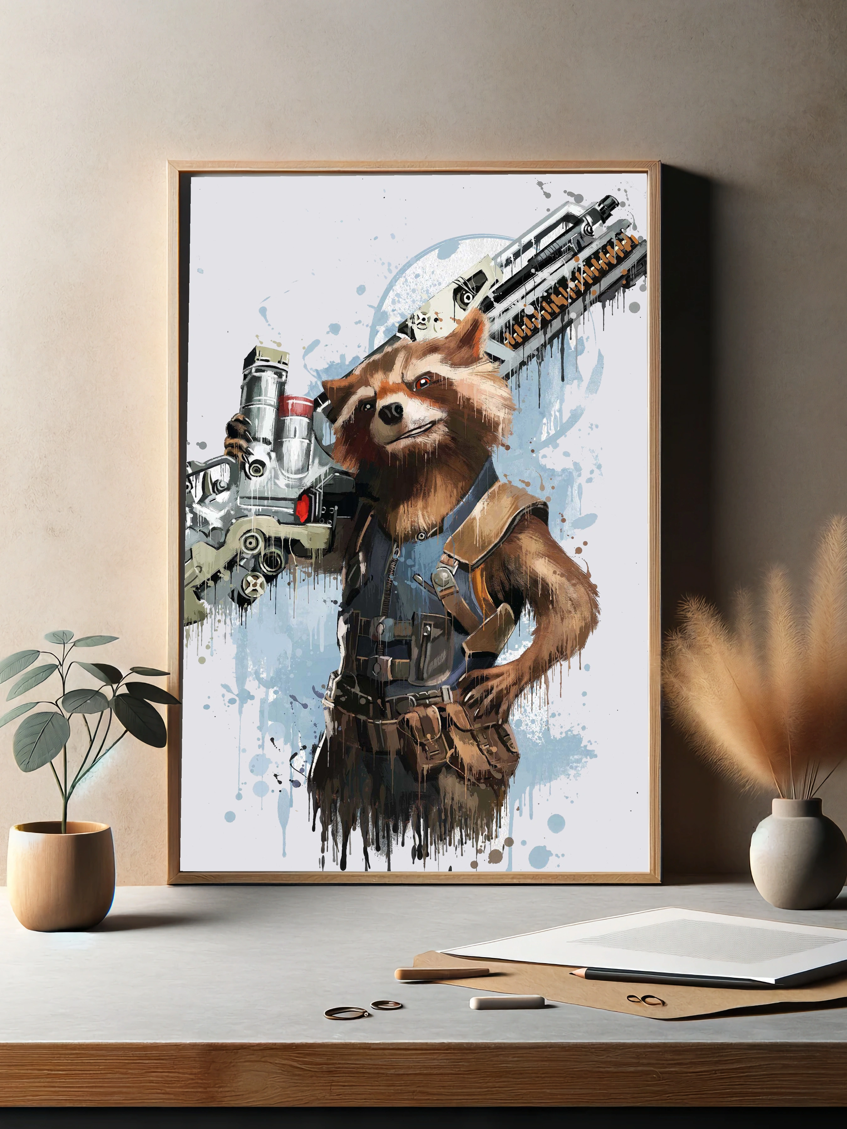 На изображении представлен Реактивный Енот, известный персонаж из комиксов и кино. Он изображён в ярком стильном цифровом исполнении с элементами граффити — с оружием на плече и уверенной позой. Доминирующие цвета — коричневый, серый и голубой. Картина идеально подойдёт для интерьера фанатов современного искусства, декоративного плаката и уникального настенного декора.