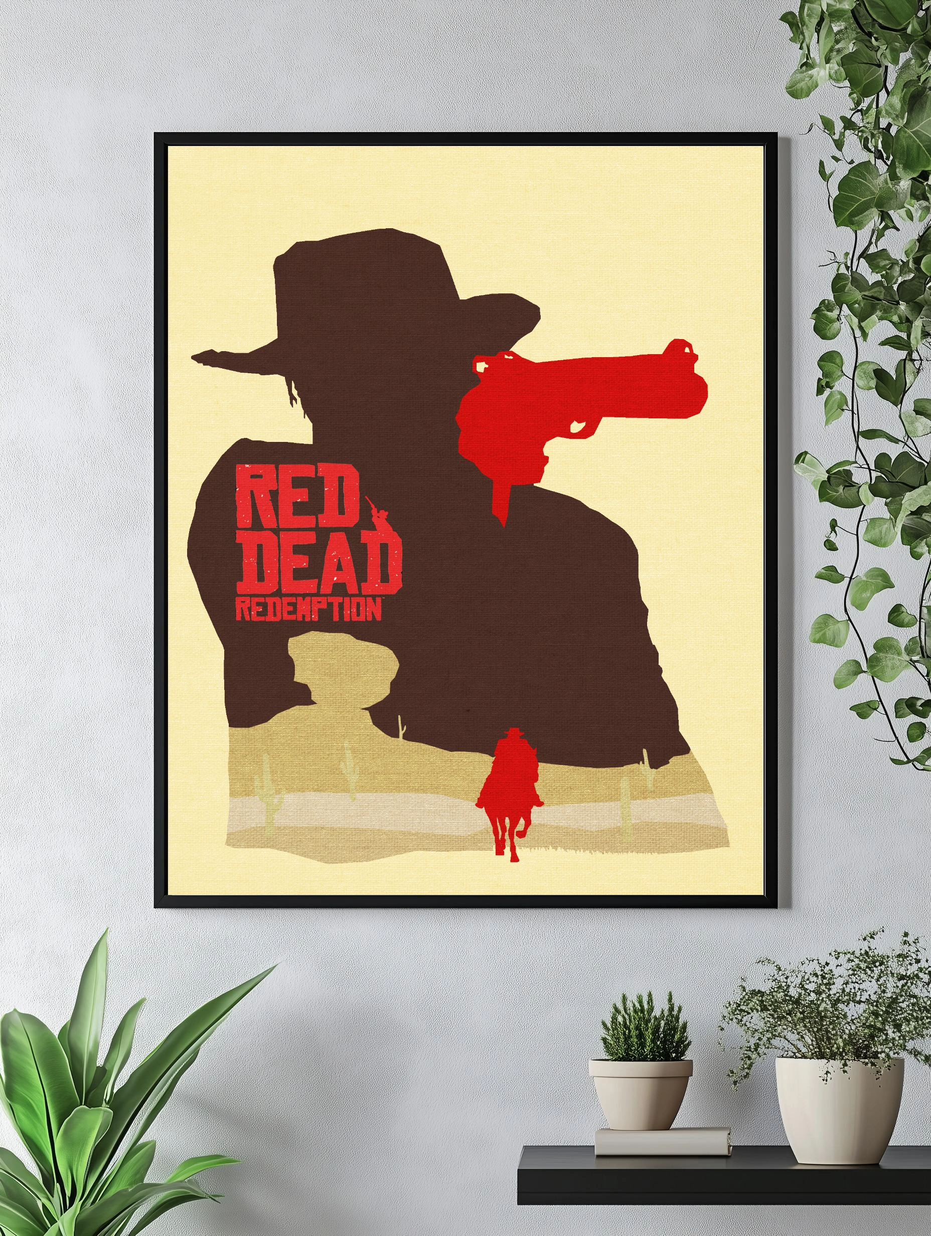 Это интерьерное искусство на холсте в стиле минимализма и силуэта, посвящённое культовой видеоигре Red Dead Redemption. Постер показывает фигуру ковбоя с крупным револьвером, тёмно-коричневый силуэт на бежевом фоне, а также красные акценты в виде оружия и всадника внизу. Уникальный художественный плакат для стильного декора стен гостиной или спальни.