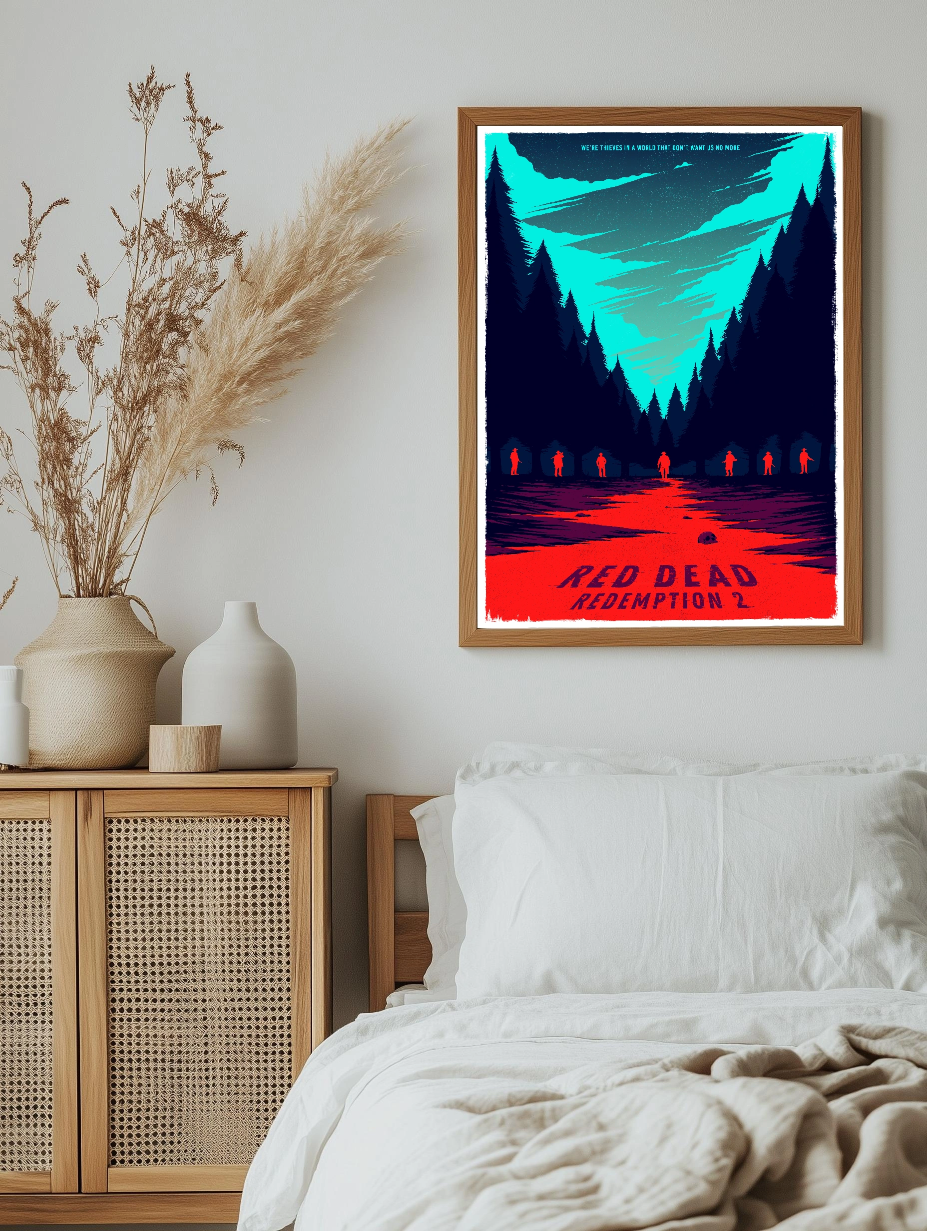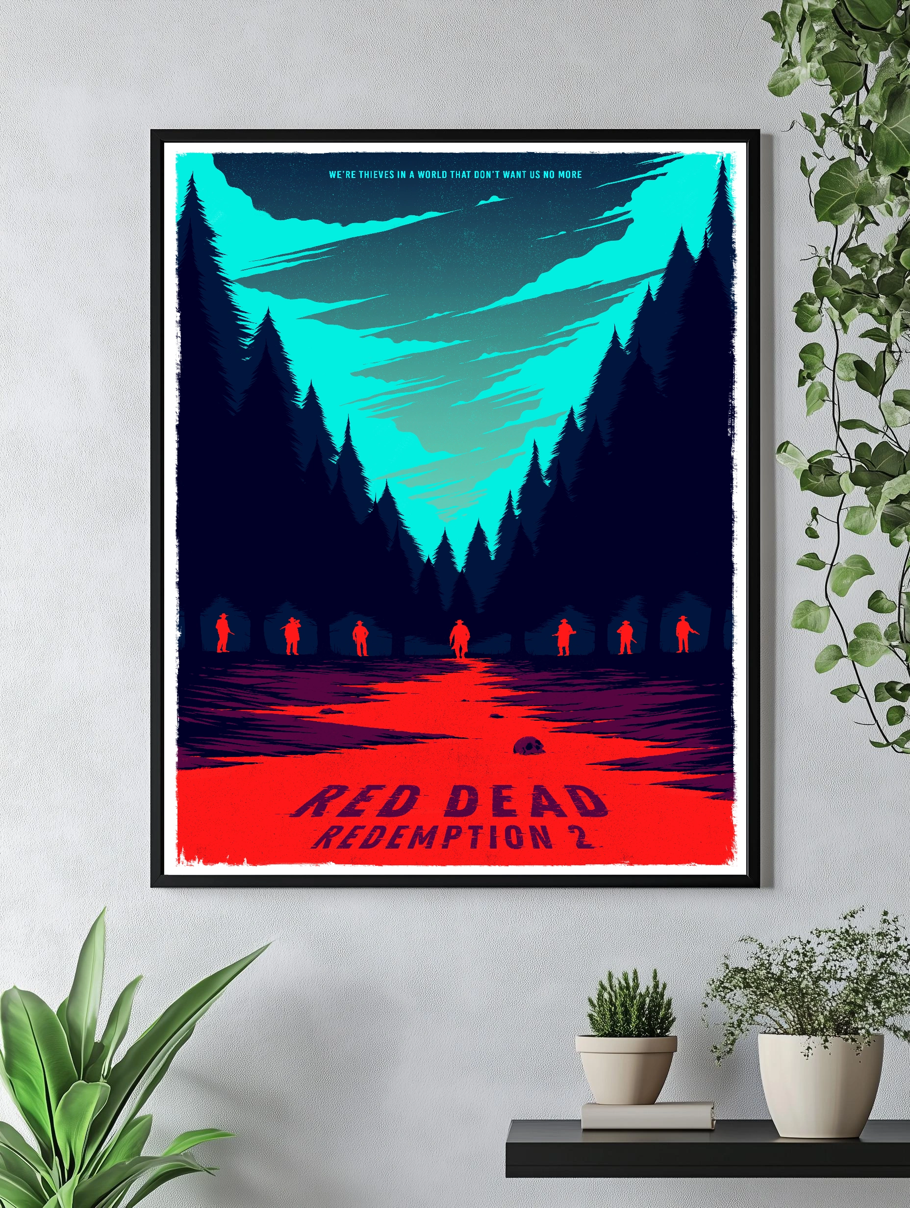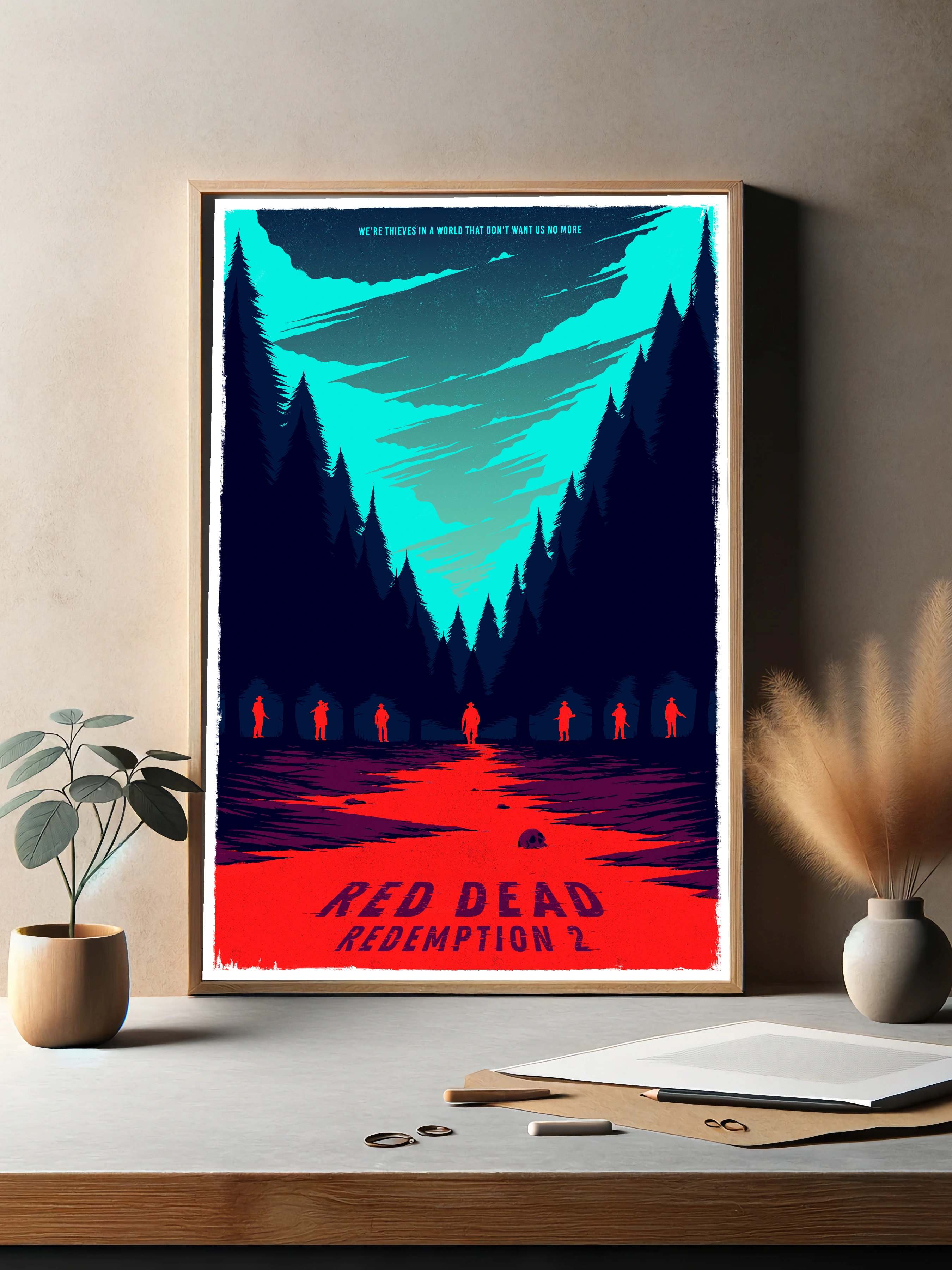 Яркий и стильный художественный плакат по мотивам игры Red Dead Redemption 2 раскрывает драматическую сцену с силуэтами семи ковбоев, стоящих в лесу. Контраст выразительных красных, синих и черных оттенков создаёт атмосферу напряжённости и свободы Дикого Запада. Идеально подойдёт как интерьерный постер для спальни, гостиной или офиса, добавляя уникальность и стиль.