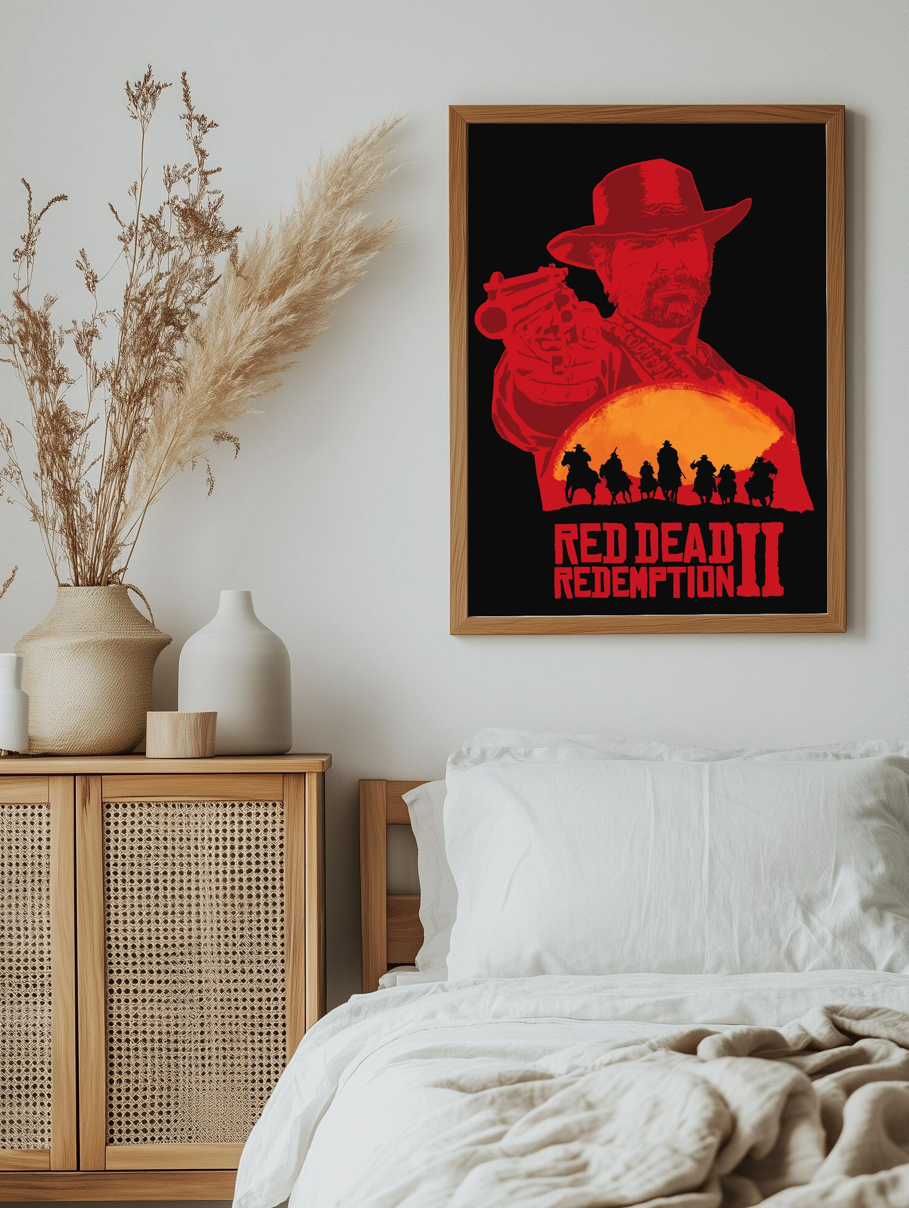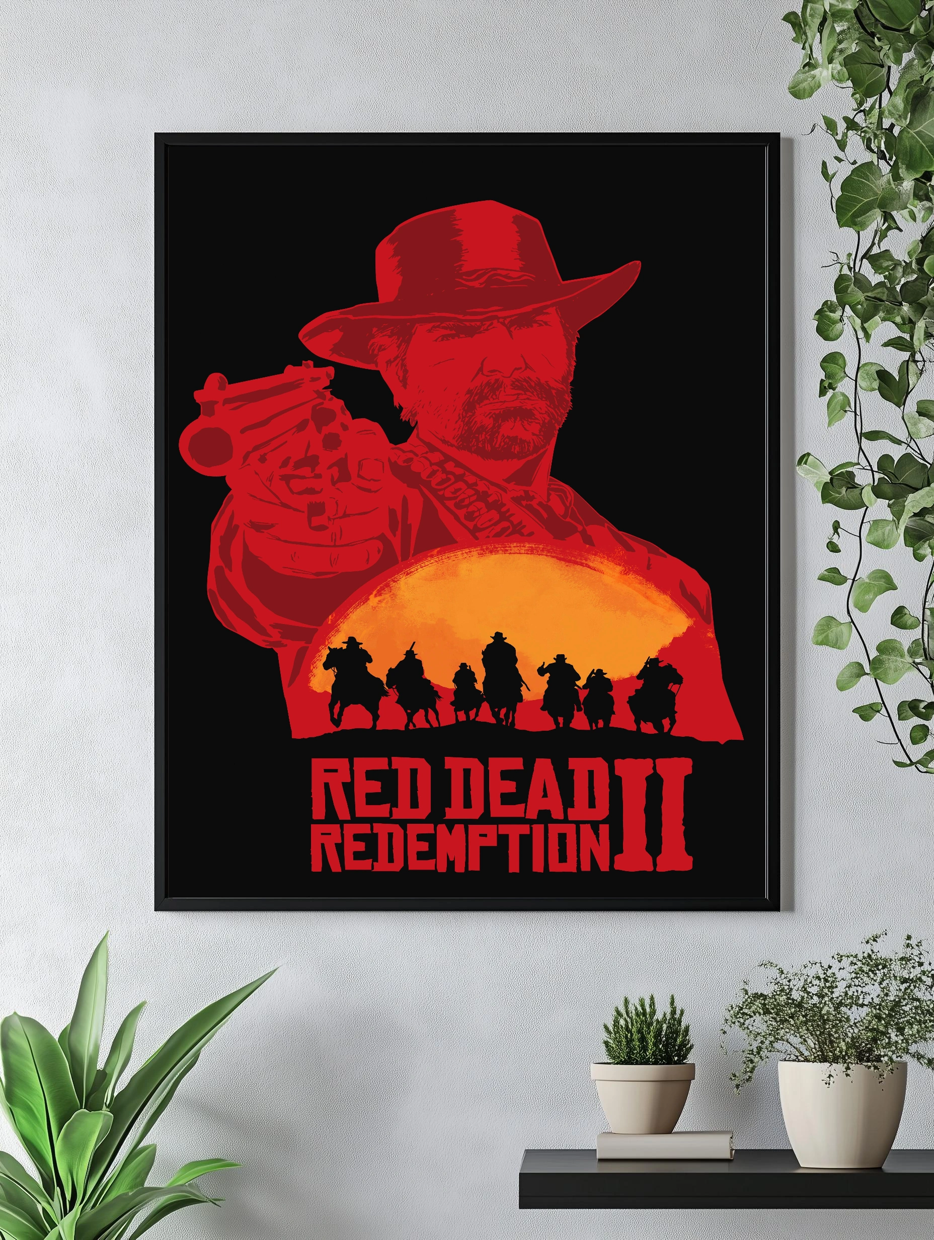 Изображение представляет собой атмосферный декоративный плакат, вдохновленный игрой Red Dead Redemption II. На черном фоне выделяется красный силуэт ковбоя с револьвером и большим шляпой, на переднем плане — группа всадников на фоне большого оранжевого солнца на закате. Это стильный интерьерный арт для фанатов вестерна и игровой тематики.