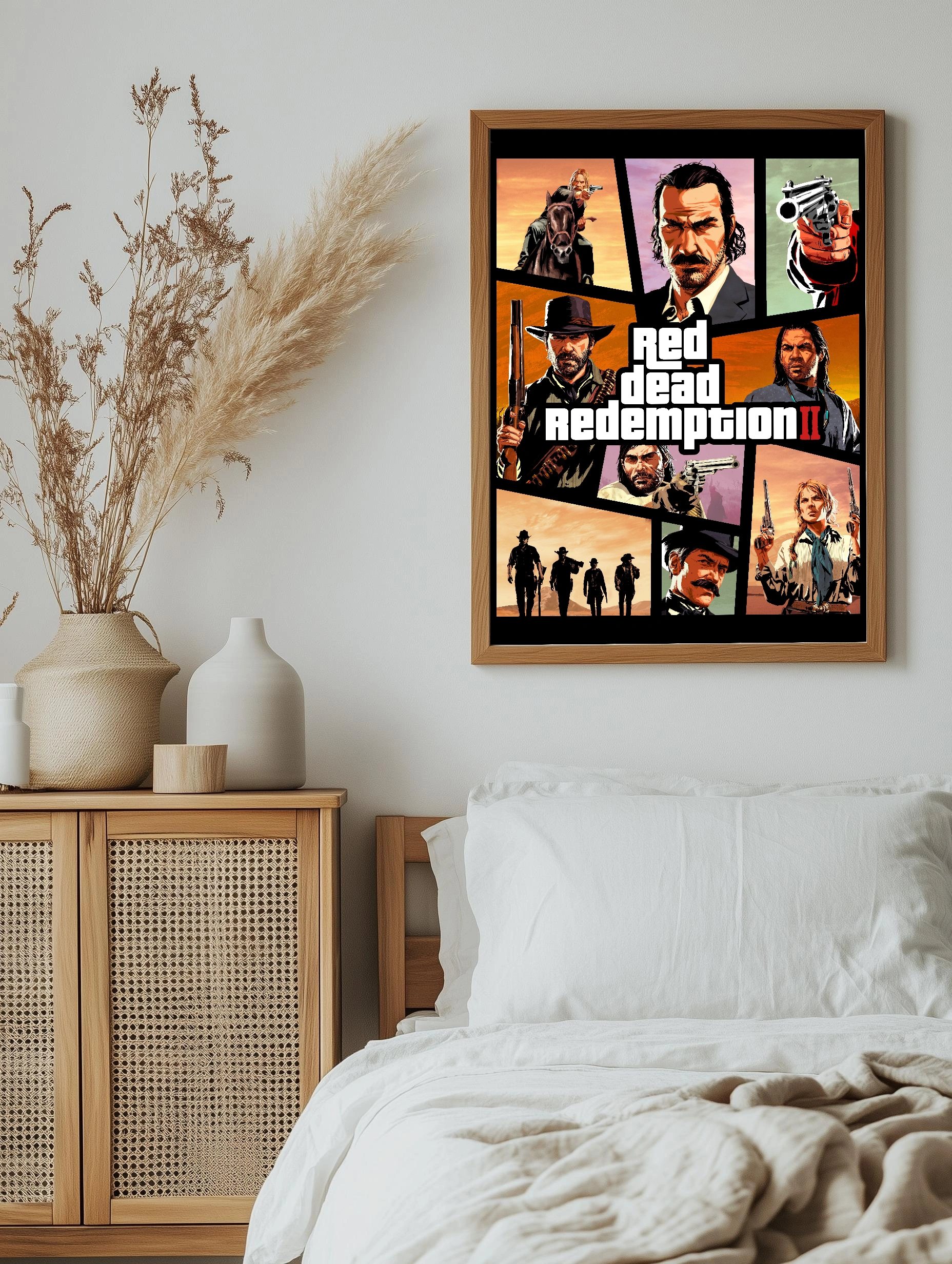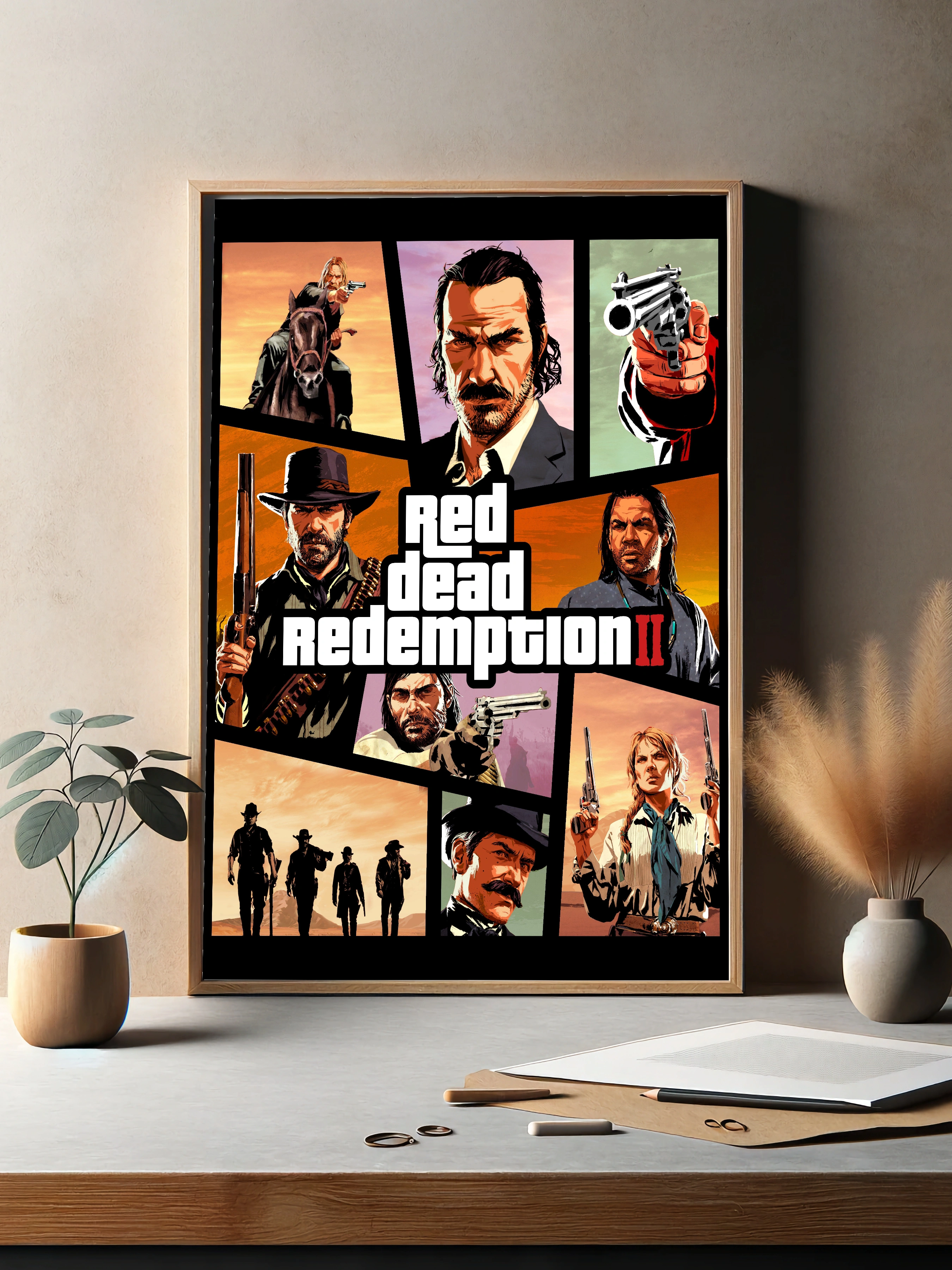 Яркое и динамичное изображение в стиле игры Red Dead Redemption II, передающее дух Дикого Запада. Центральное расположение названия игры и многосекционные портреты ключевых персонажей с оружием в руках создают атмосферу напряжённого приключения. Идеально для интерьера поклонников видеоигр и современного искусства для стен, подходит как декоративный плакат или художественный настенный декор.