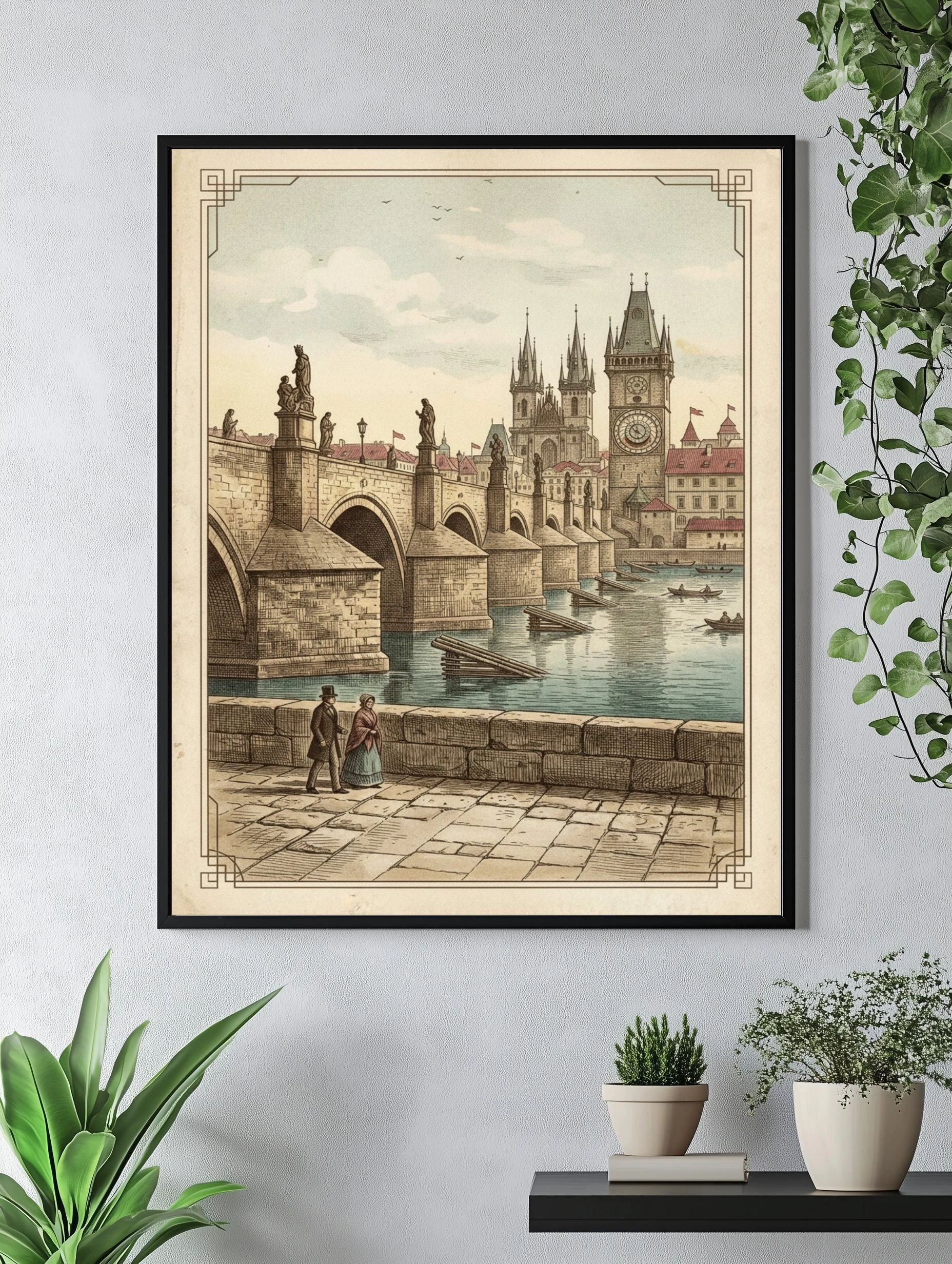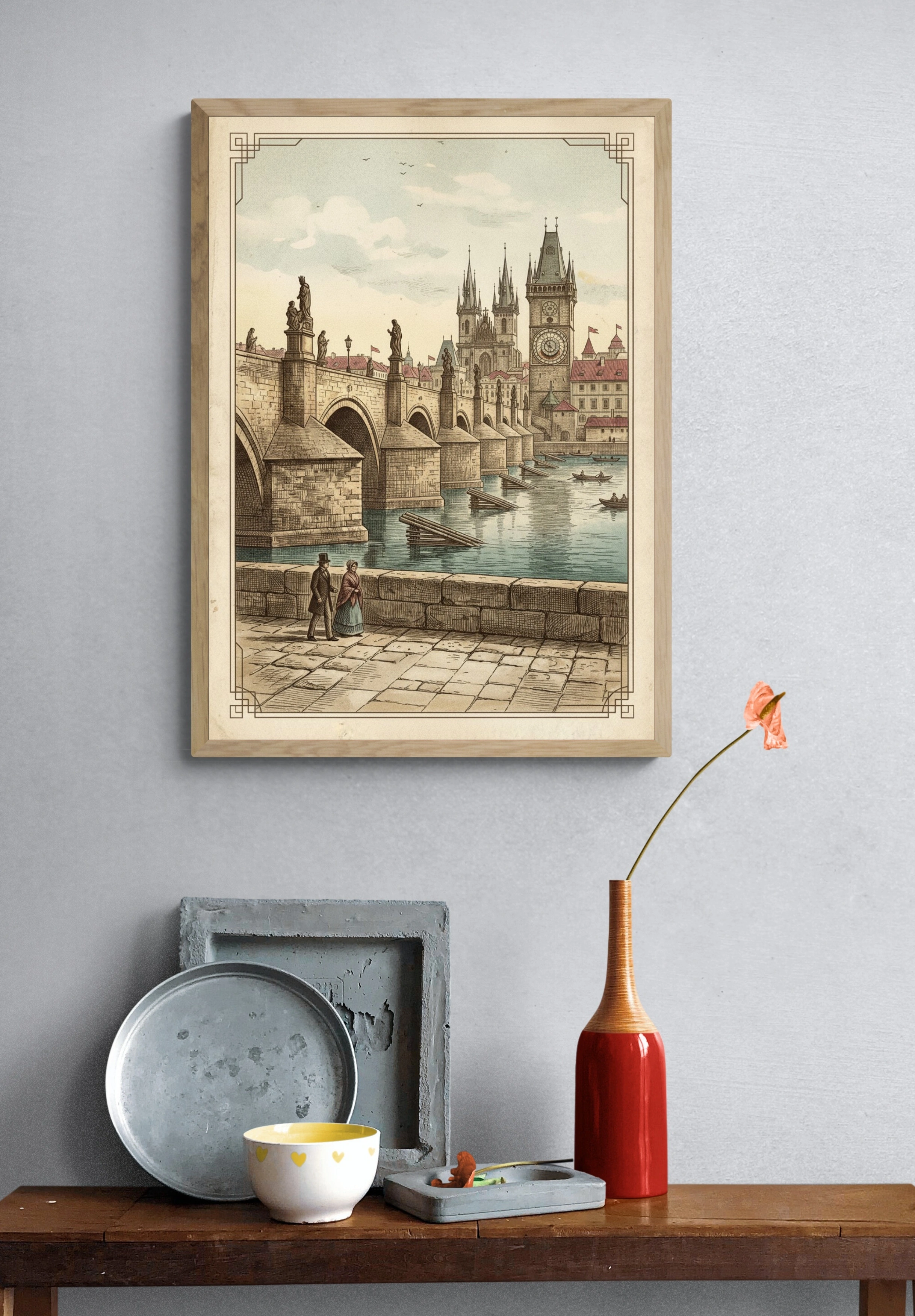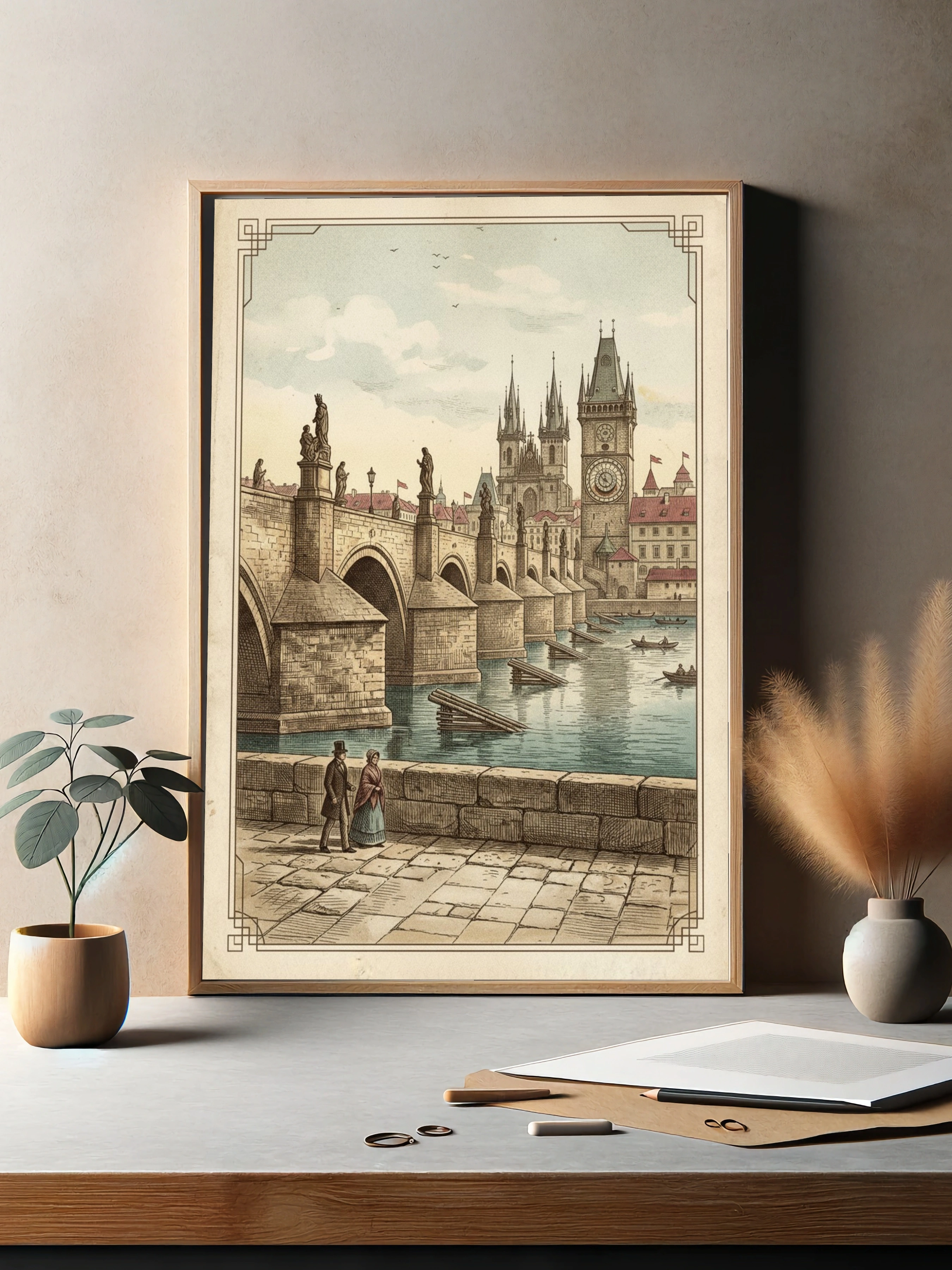 Погрузитесь в атмосферу старинной Праги с этим великолепным постером, изображающим Пражский мост. На переднем плане вы видите пару, прогуливающуюся вдоль каменной набережной, в то время как за ними возвышаются величественные арки моста, украшенные статуями. На заднем плане виднеется знаменитая башня с часами, а также очаровательные здания с красными крышами. Нежные оттенки голубого и бежевого создают ощущение спокойствия и романтики. Этот постер идеально впишется в интерьер вашей гостиной или спальни, добавляя нотку исторического шарма. Он станет отличным выбором для любителей путешествий и истории, а также для тех, кто ценит искусство и эстетику.