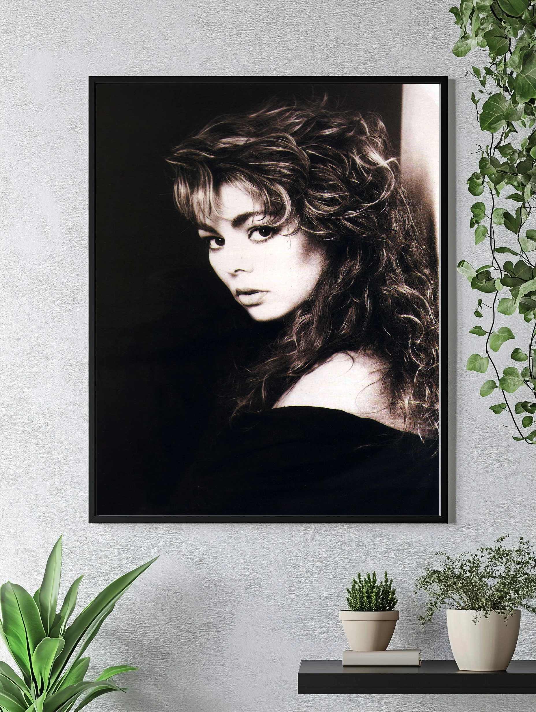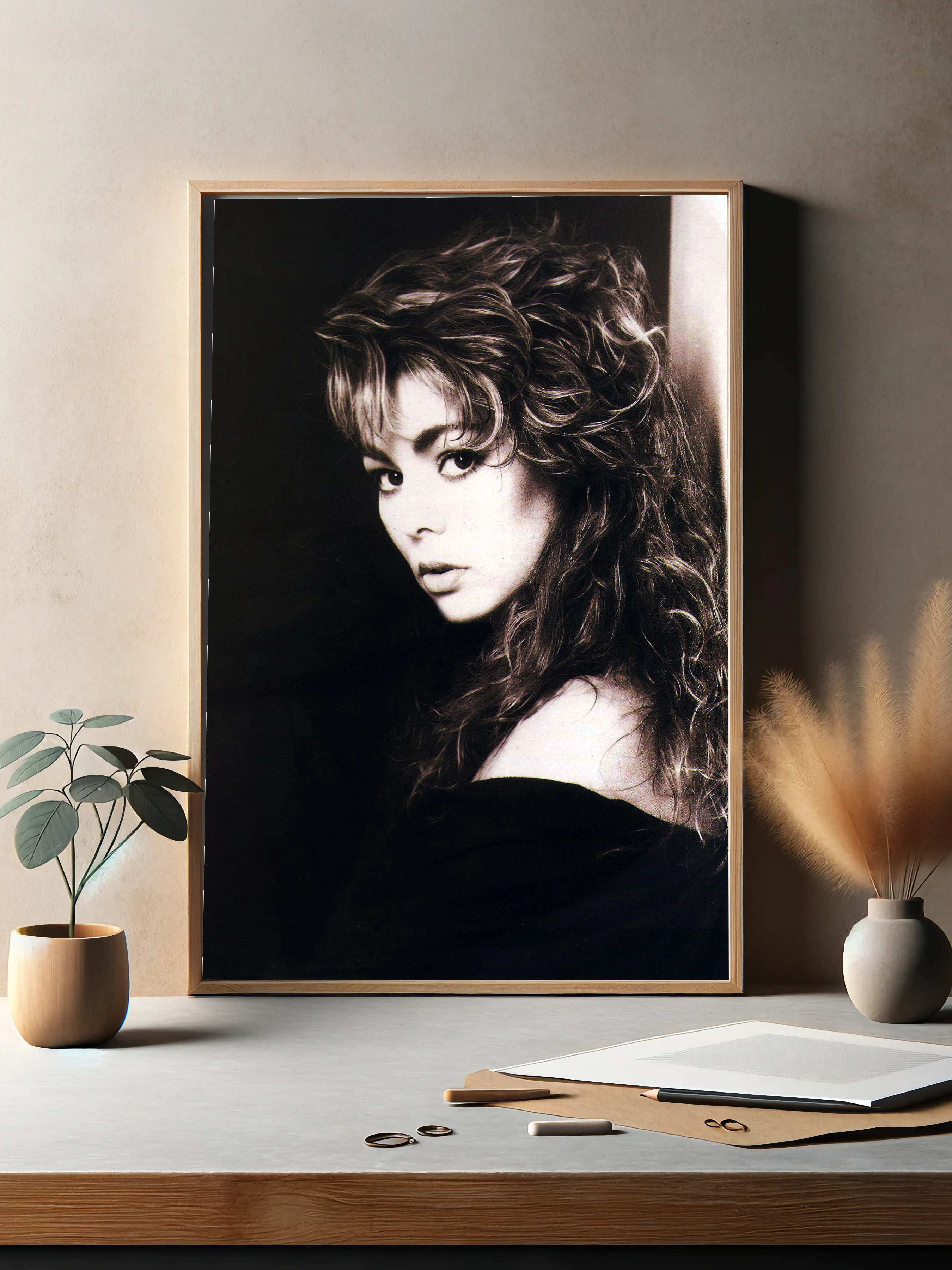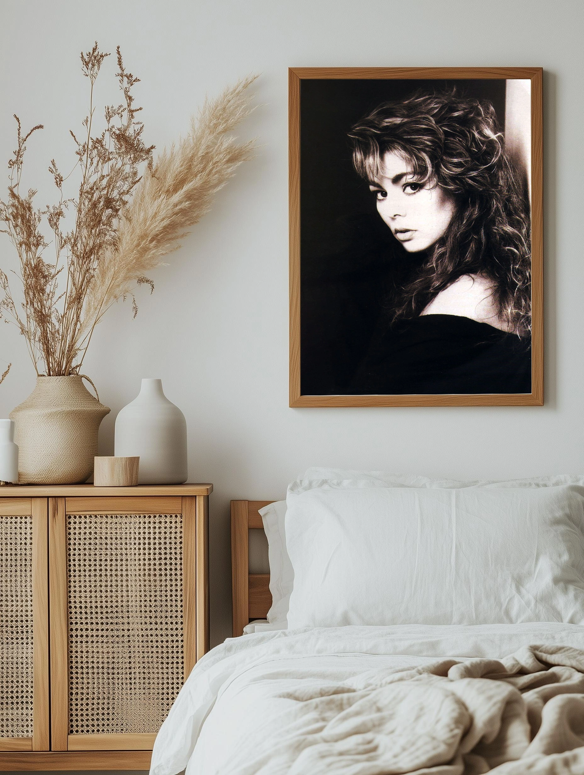 Этот интерьерный постер представляет собой художественную черно-белую фотографию молодой женщины с волнистыми волосами и выразительным взглядом в стиле 80-х. Работа выделяется контрастной игрой света и тени, создавая глубокое и загадочное настроение. Отличное решение для создания стильного декора стен в гостиной или офисе.