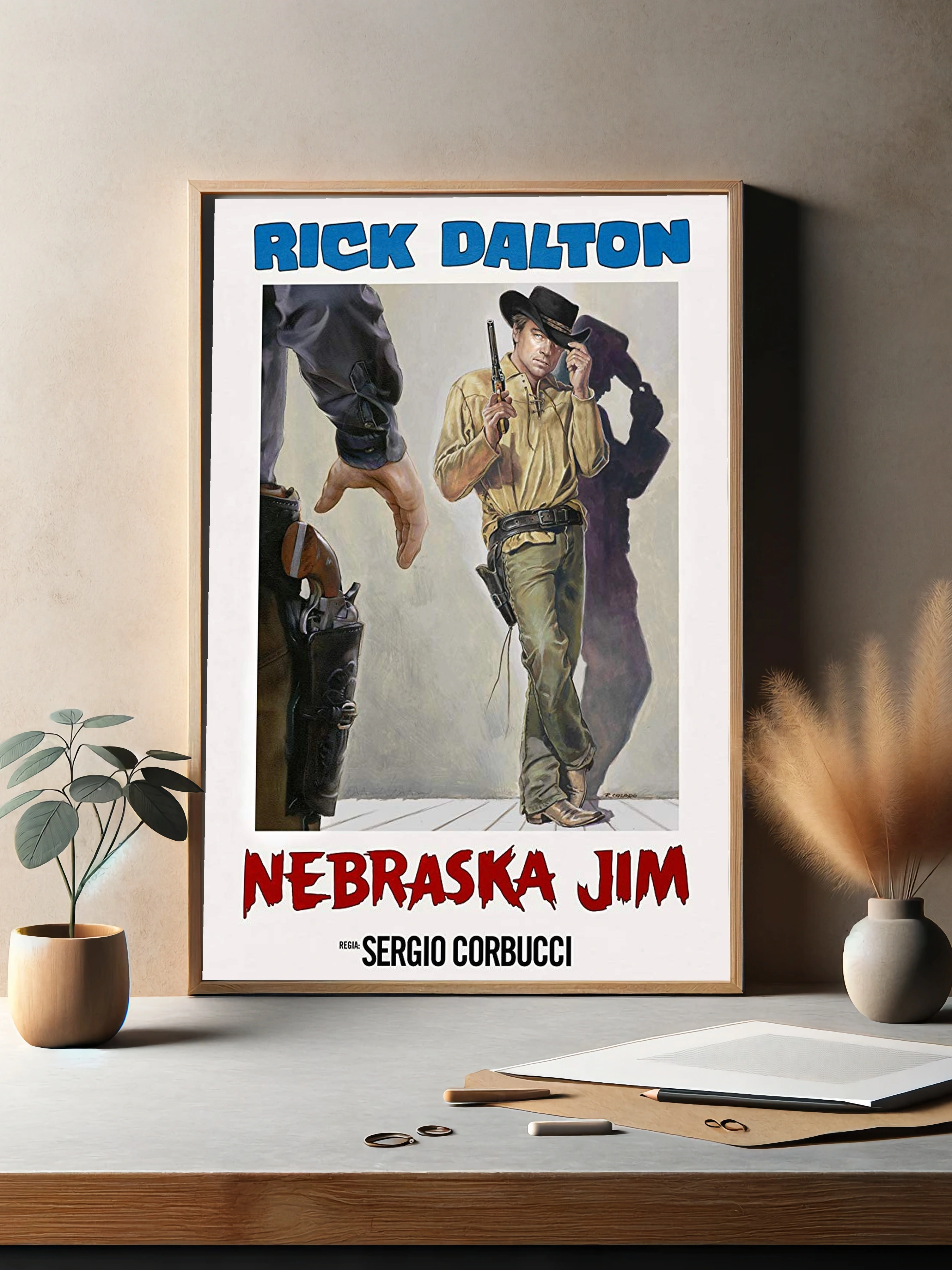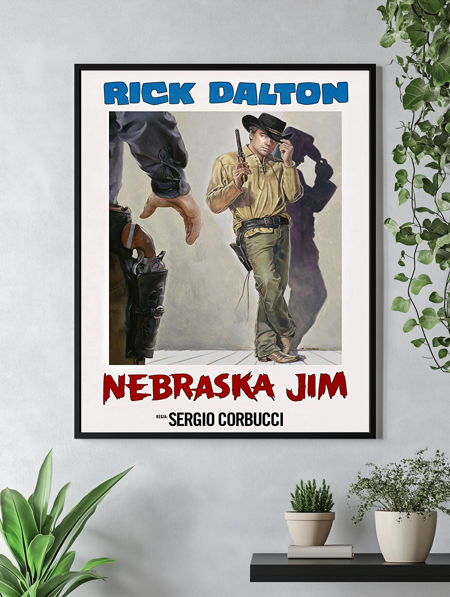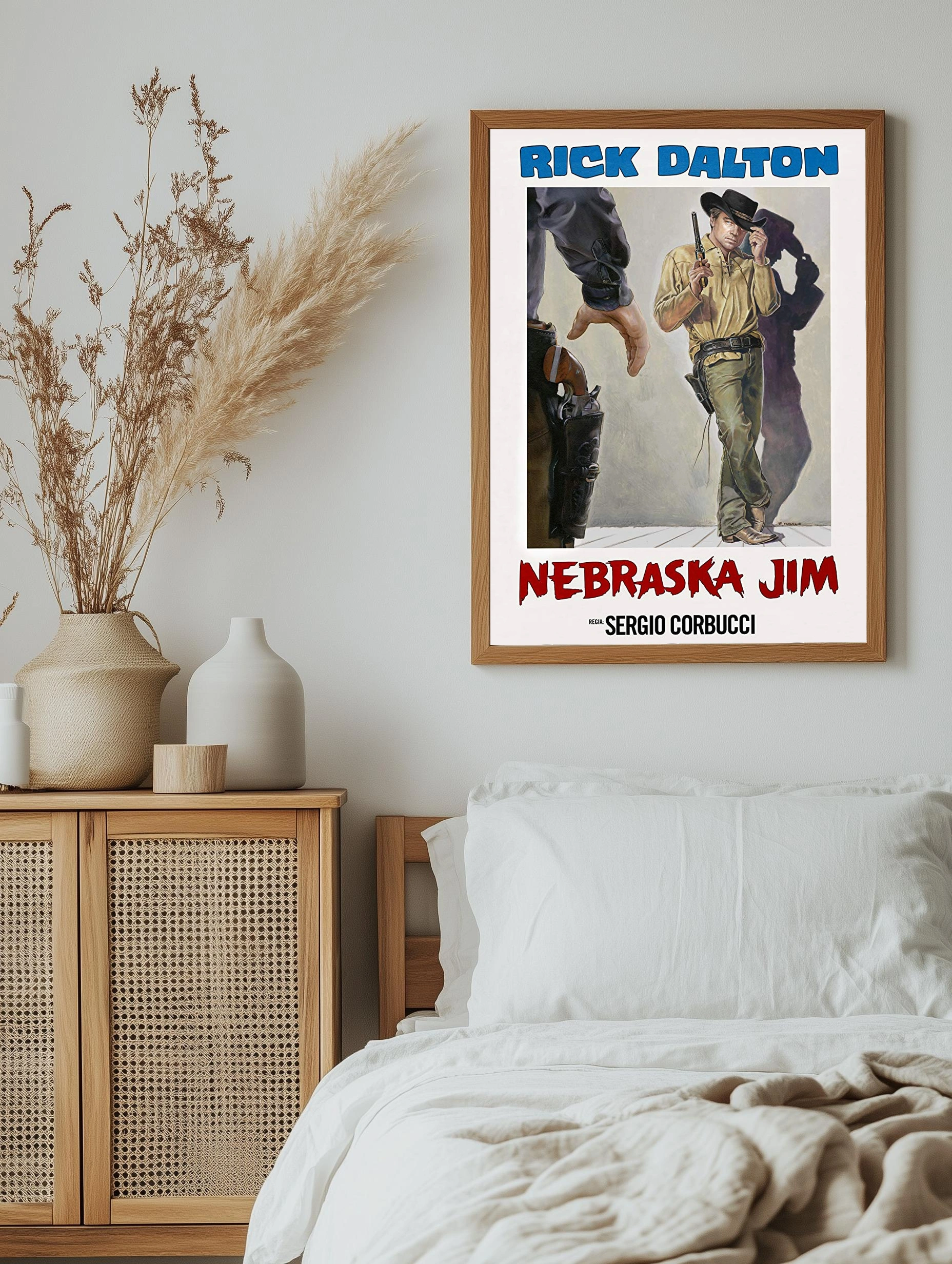 Интерьерное искусство с изображением ковбоя Рика Далтона, позирующего с револьвером на фоне светлой стены и тенью. Картина выдержана в классическом стиле вестерна с акцентом на драматизм и атмосферу Дикого Запада. Отлично подходит для стильного декора стен в гостиной или офисе, сочетая исторический сюжет с качественной художественной техникой.