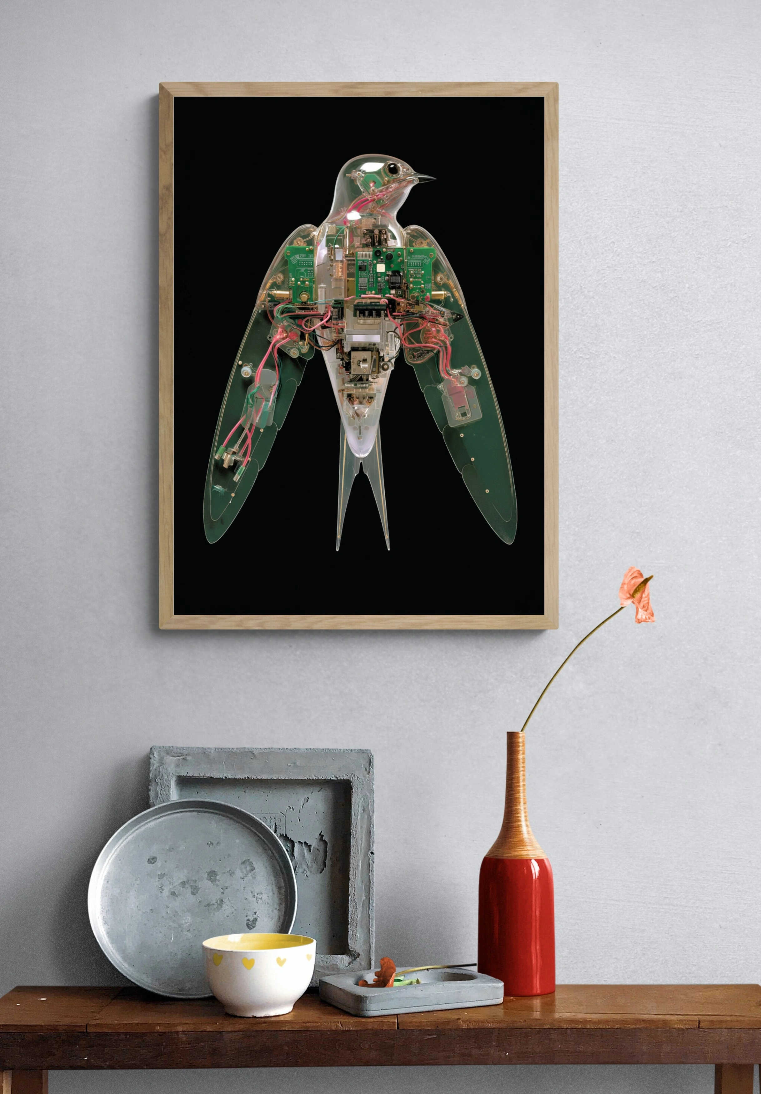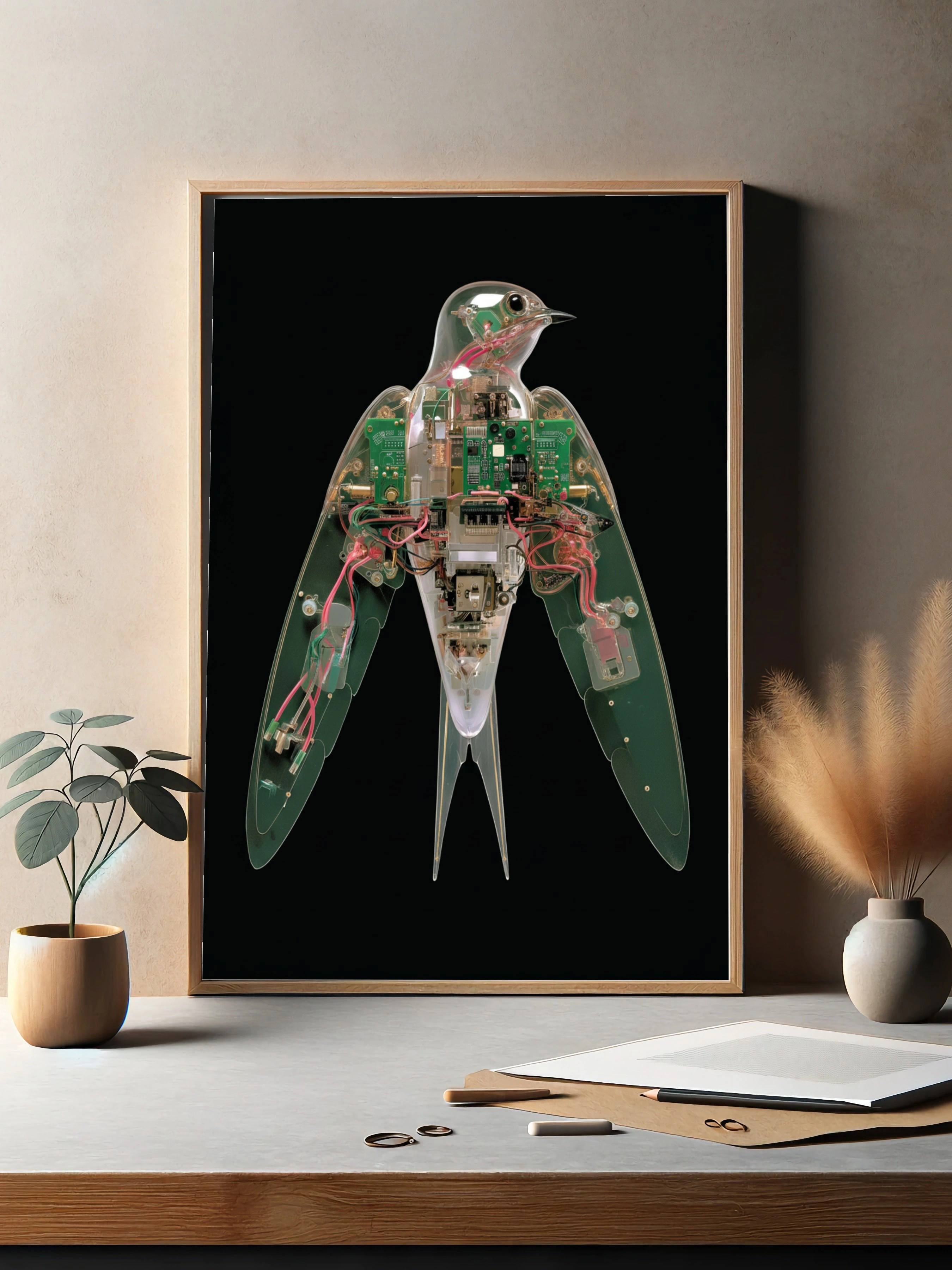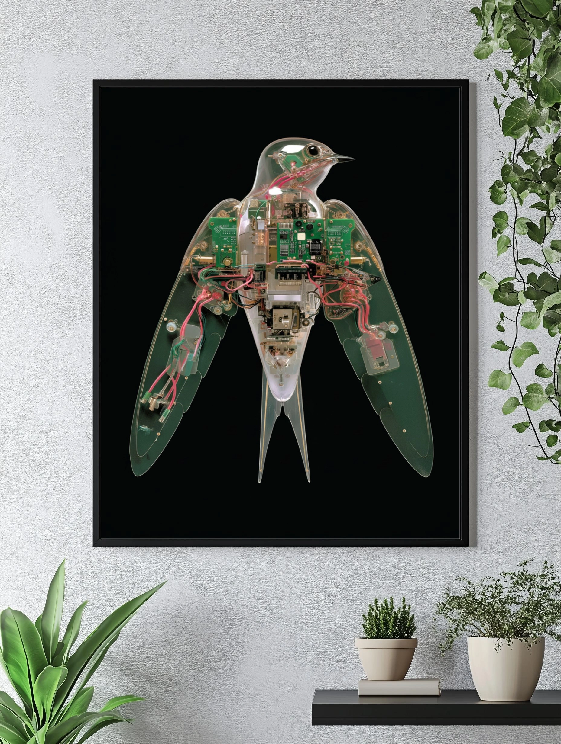 Этот уникальный постер изображает роботизированную птицу, выполненную в прозрачном корпусе, который позволяет увидеть внутренние механизмы и электронные компоненты. На фоне глубокого черного цвета выделяются яркие детали: зеленые платы, красные провода и металлические элементы, создающие эффект технологической гармонии. Композиция подчеркивает симбиоз природы и технологий, вызывая восхищение и интерес. Постер выполнен в стиле современного искусства, что придаёт ему особую атмосферу футуризма и инноваций. Идеально подходит для оформления офисов, креативных пространств или домашних кабинетов, где ценят уникальный дизайн и технологические новшества. Целевая аудитория — молодежь, креативщики и любители искусства.