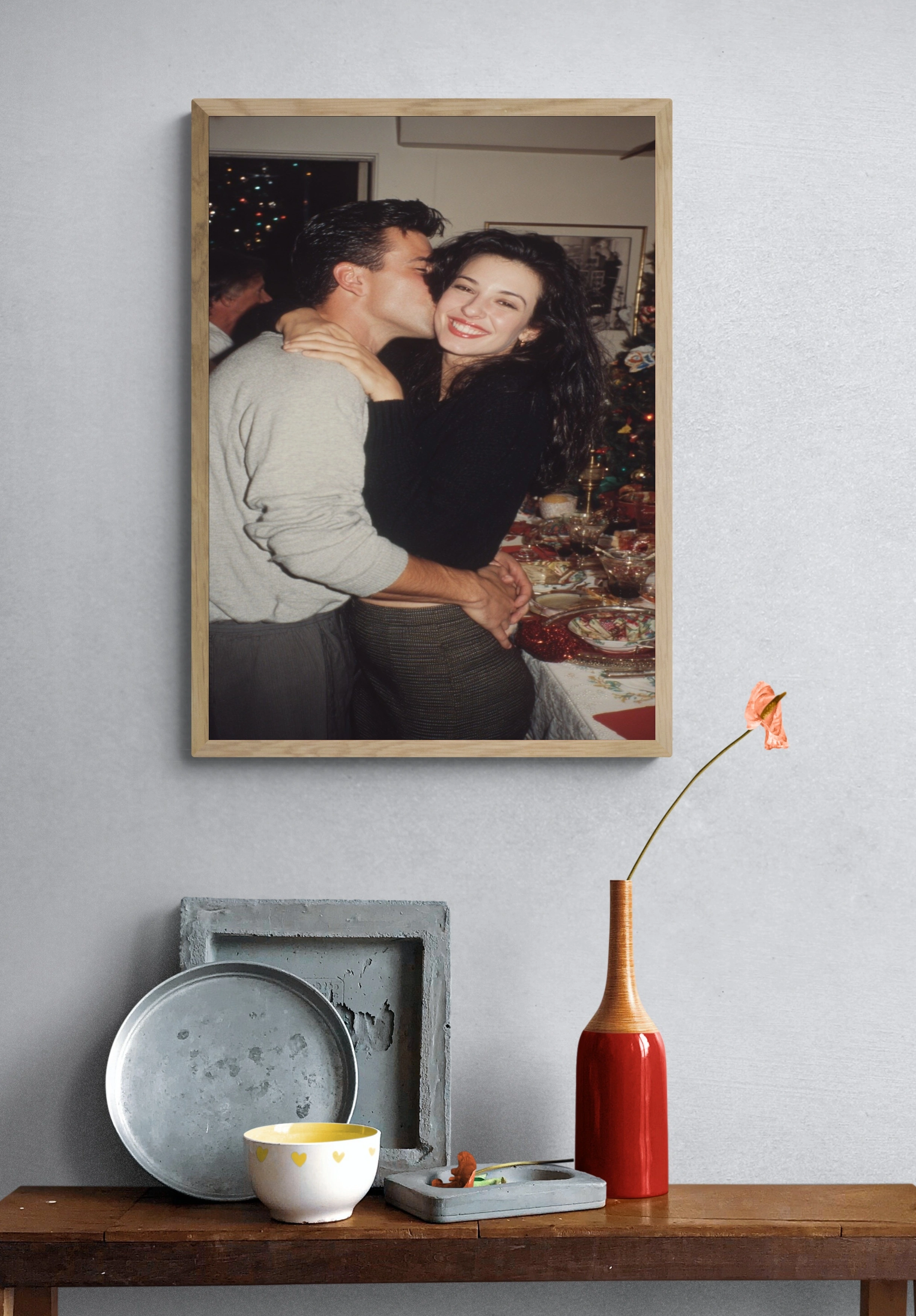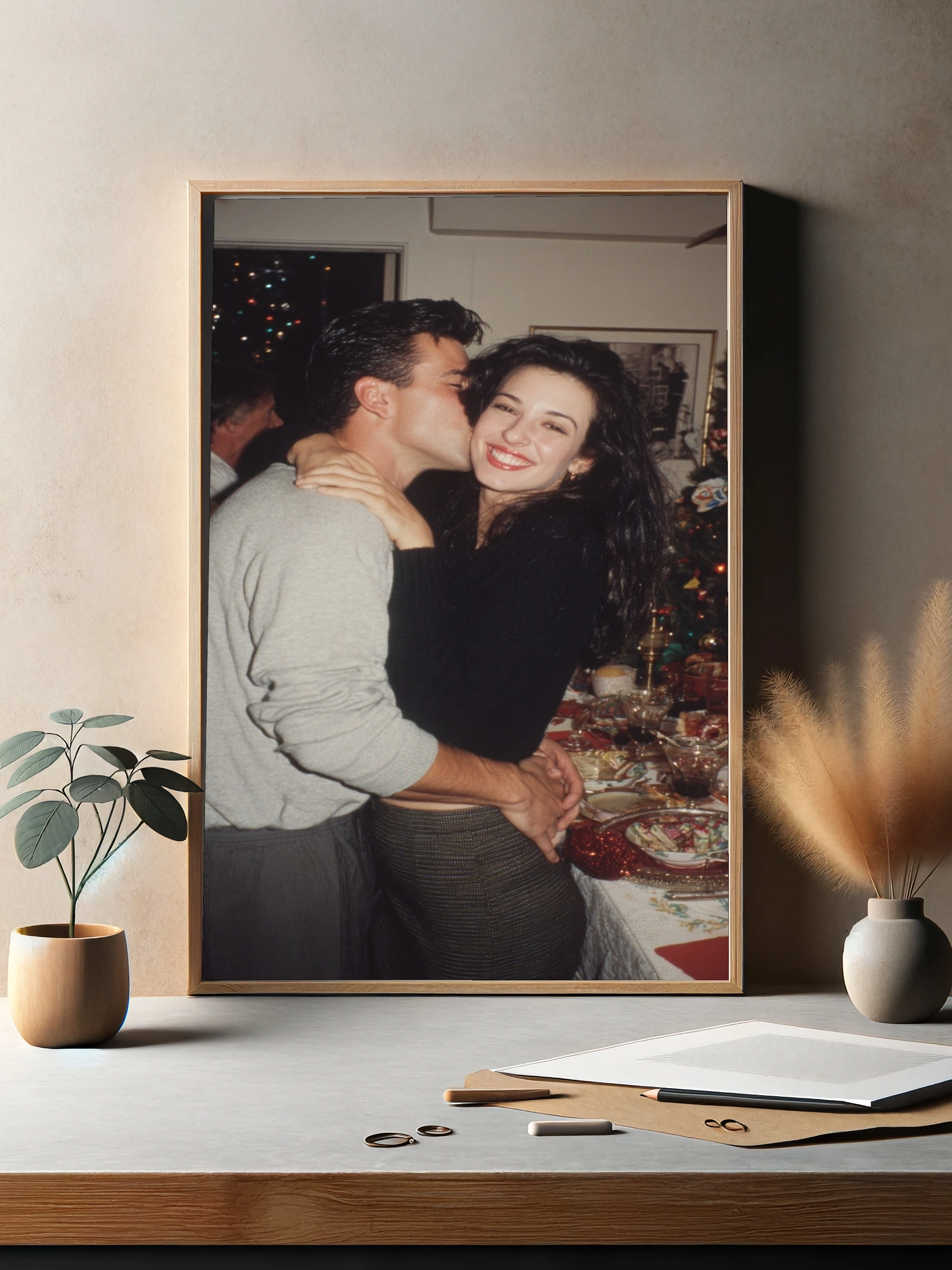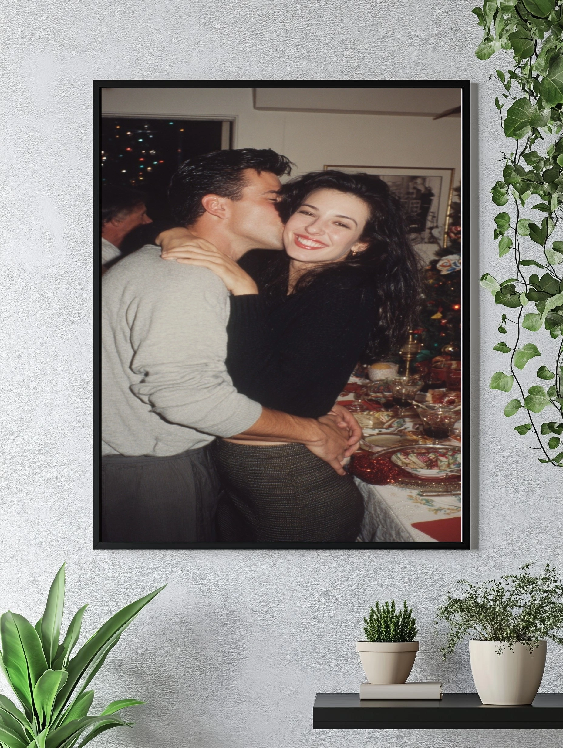 Погрузитесь в атмосферу тепла и любви с этим постером, запечатлевающим нежный момент между парой на праздничной вечеринке. На переднем плане — влюбленные, улыбающиеся друг другу, с яркими эмоциями на лицах. Мужчина в светлом свитере нежно целует девушку в щеку, которая одета в стильный черный свитер, подчеркивающий её красоту. За ними виден праздничный стол, украшенный изысканными блюдами и бокалами, создающими атмосферу уюта. Цветовая гамма включает теплые оттенки, такие как красный и золотой, что добавляет ощущение праздника. Стиль изображения — реализм, передающий искренние чувства и радость момента. Этот постер идеально подойдет для гостиной или спальни, добавляя романтики и уюта в любое пространство. Целевая аудитория — молодые пары и семьи, которые ценят моменты счастья и любви.