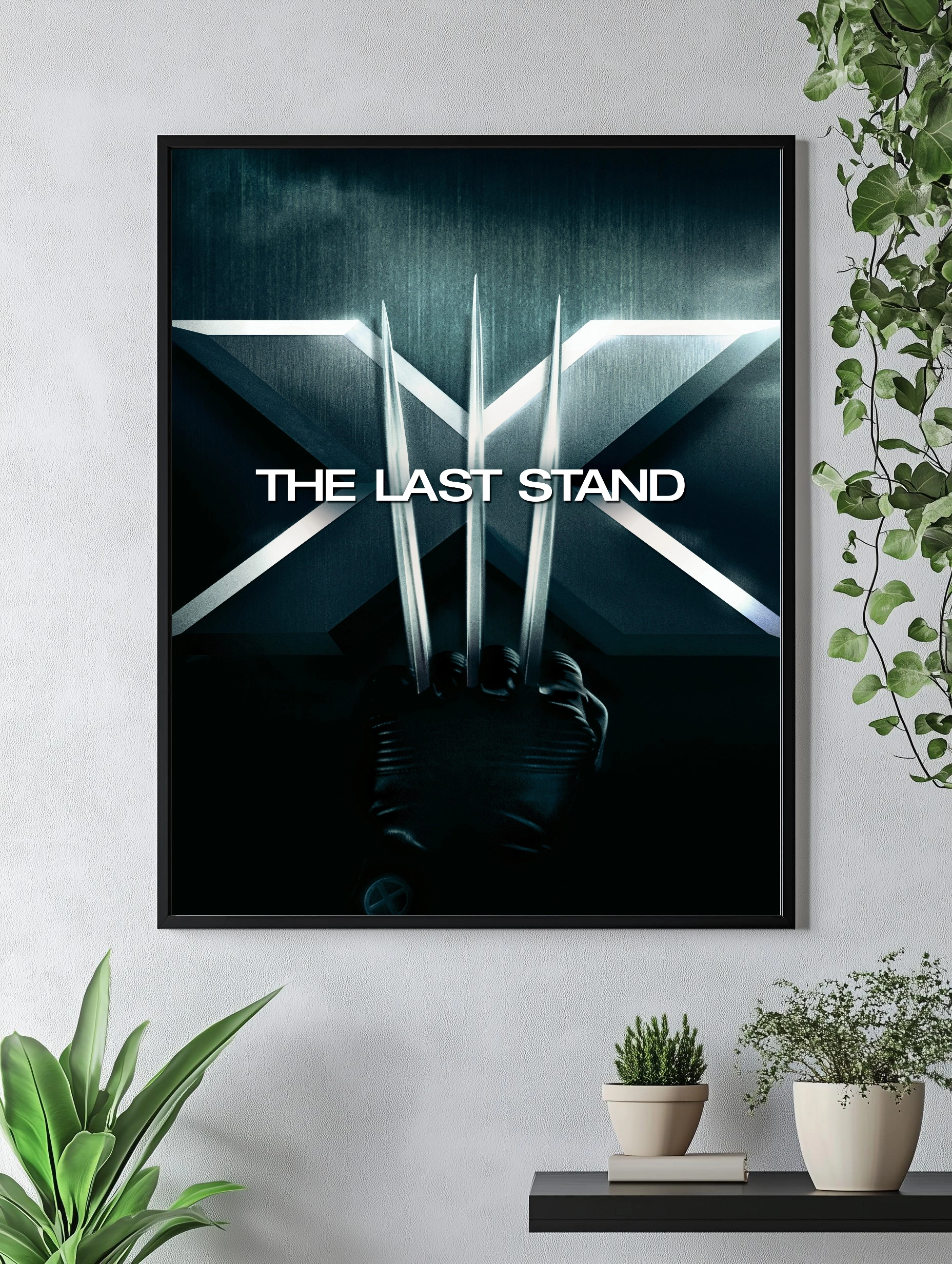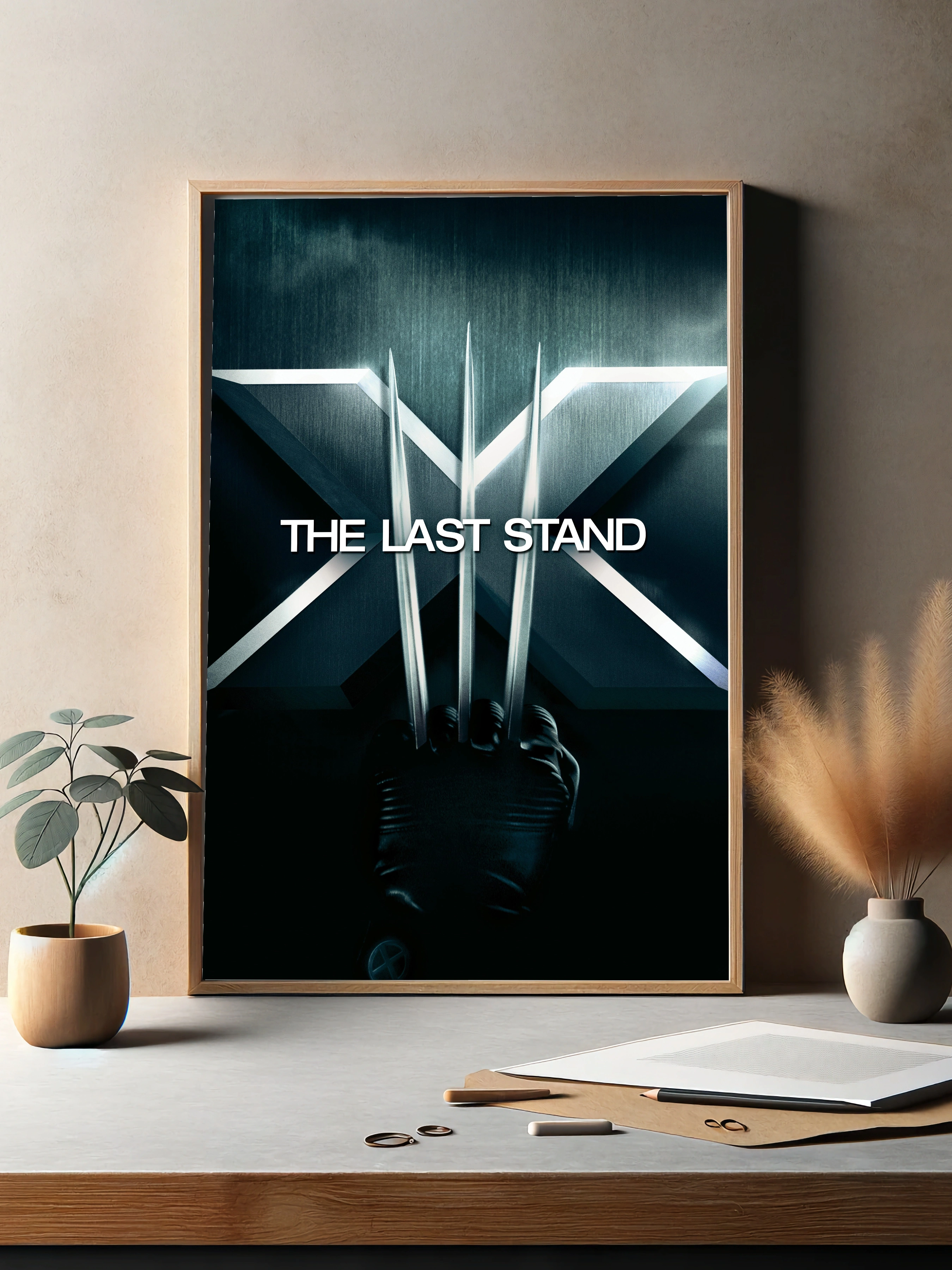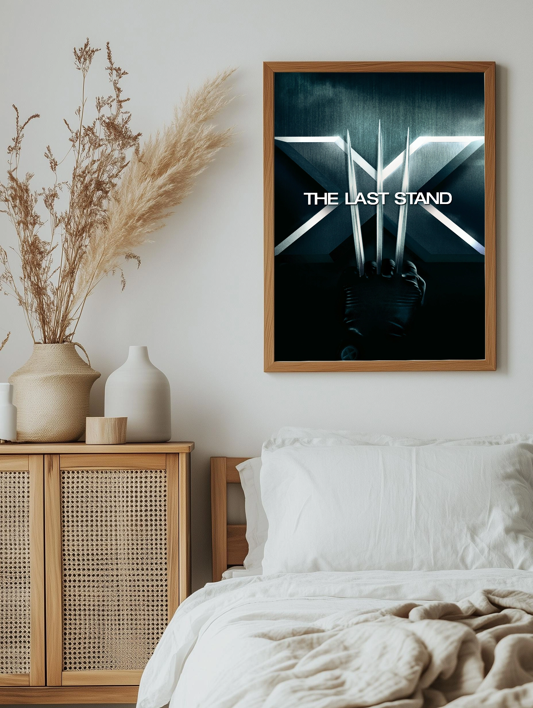 Изображение представляет собой интерьерный арт с темным и насыщенным стилем, изображающий кулак в перчатке с выступающими металлическими когтями персонажа Росомаха из вселенной Людей Икс. Лаконичный дизайн с использованием графичных линий и мистической атмосферой создает драматическое настроение и отлично подойдет как декоративный плакат для гостиной или офиса.